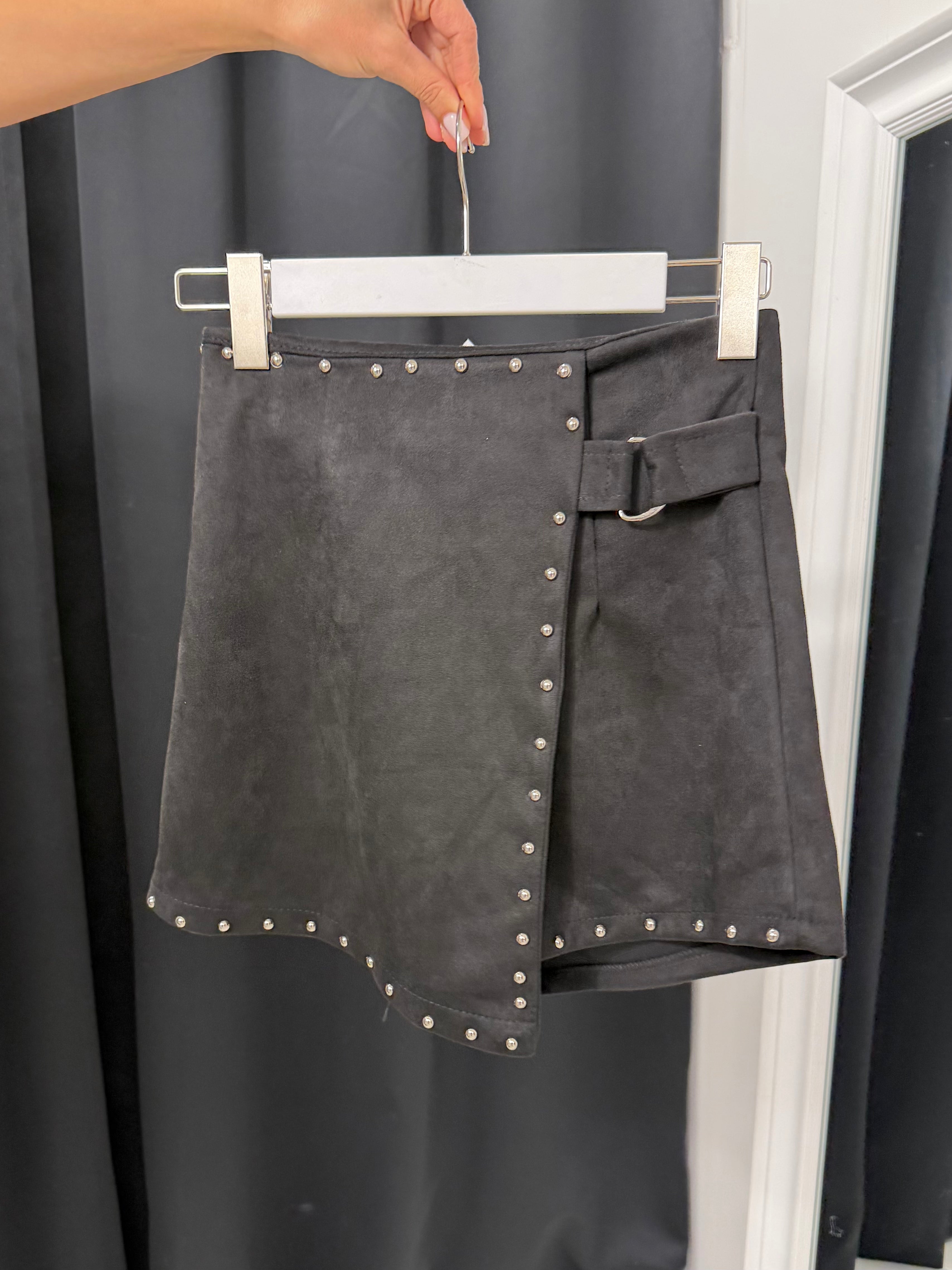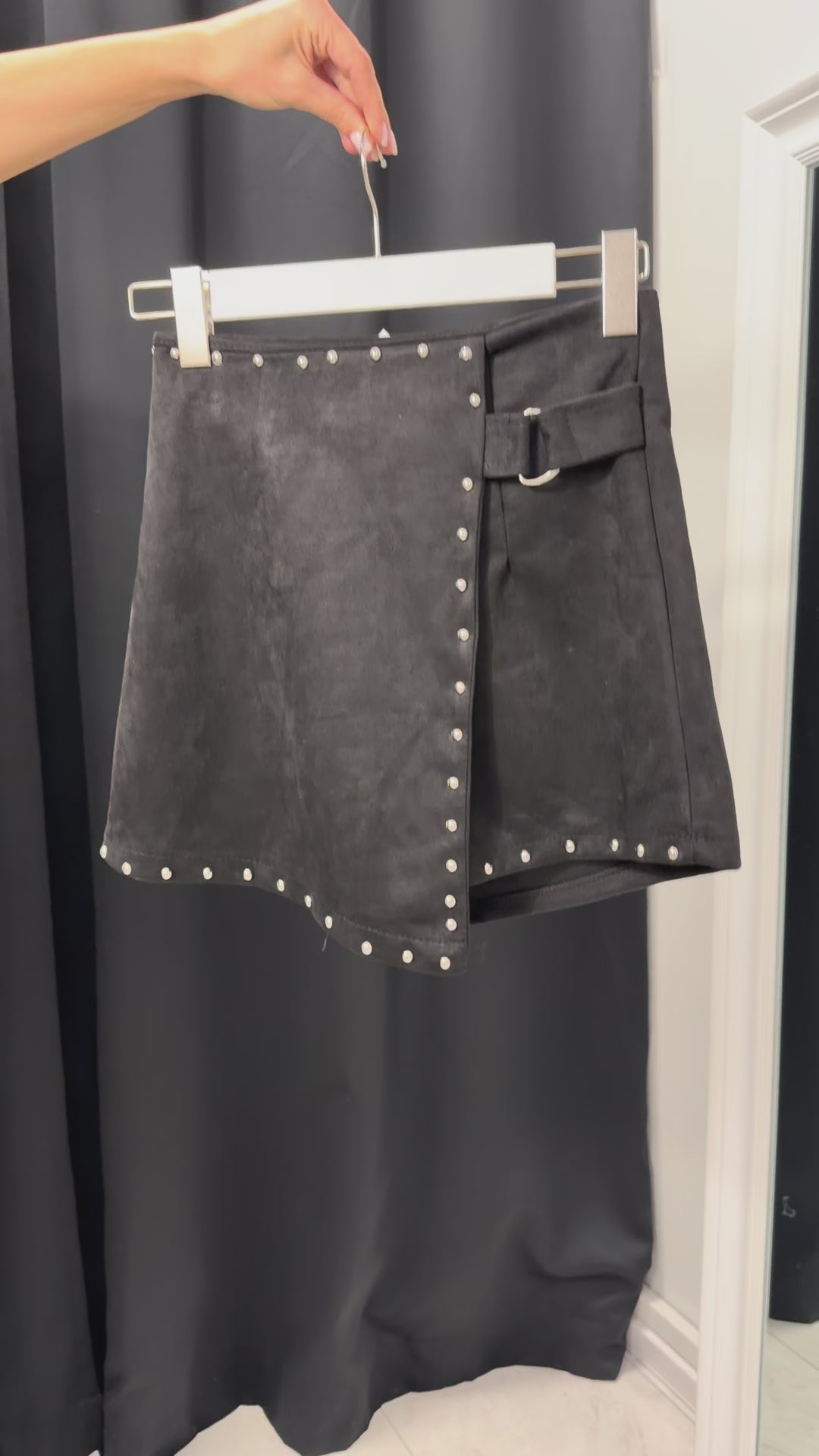 NOVA SUEDE SKORT – fustă-pantalon scurtă din piele întoarsă, cu design asimetric
