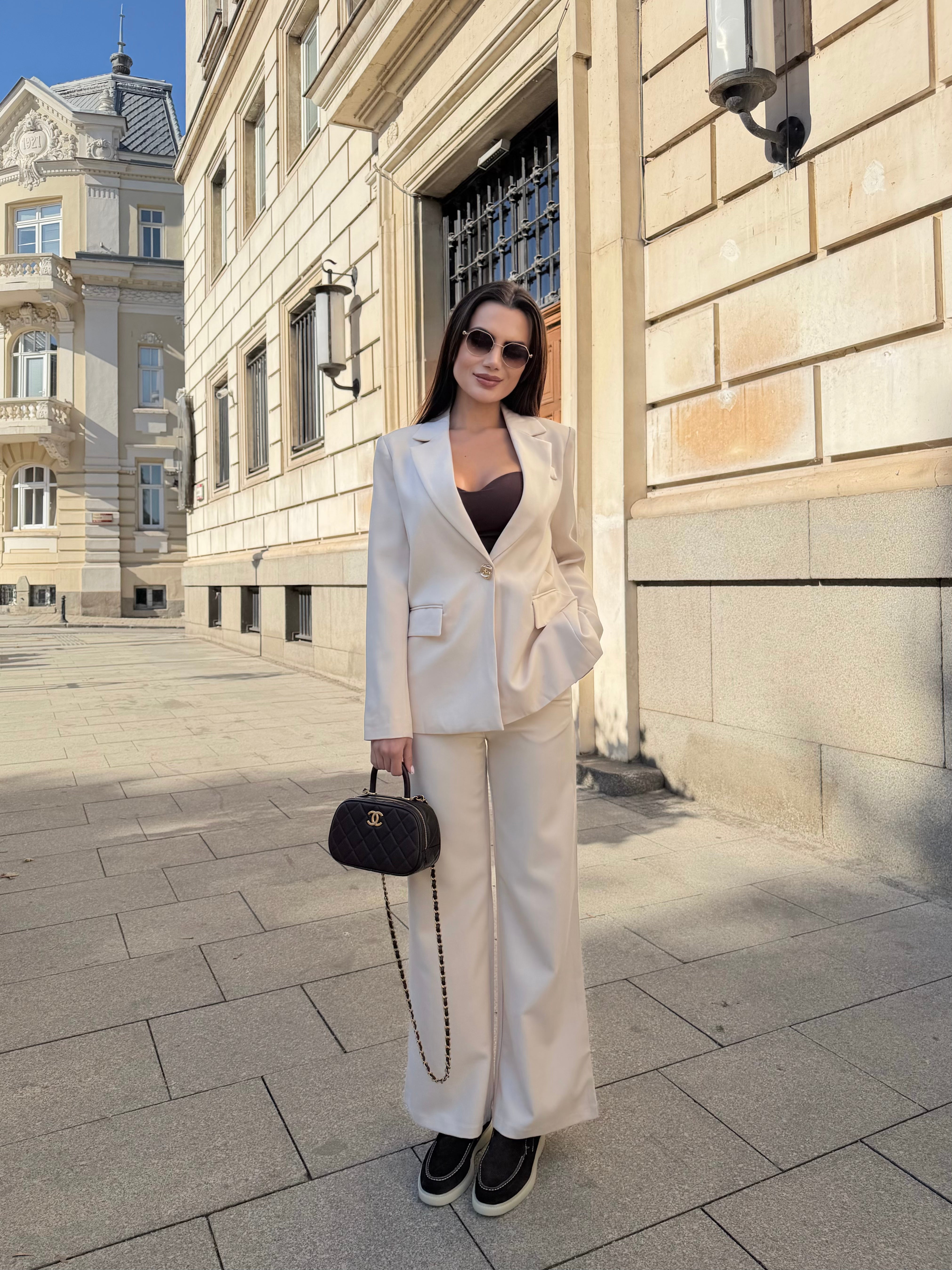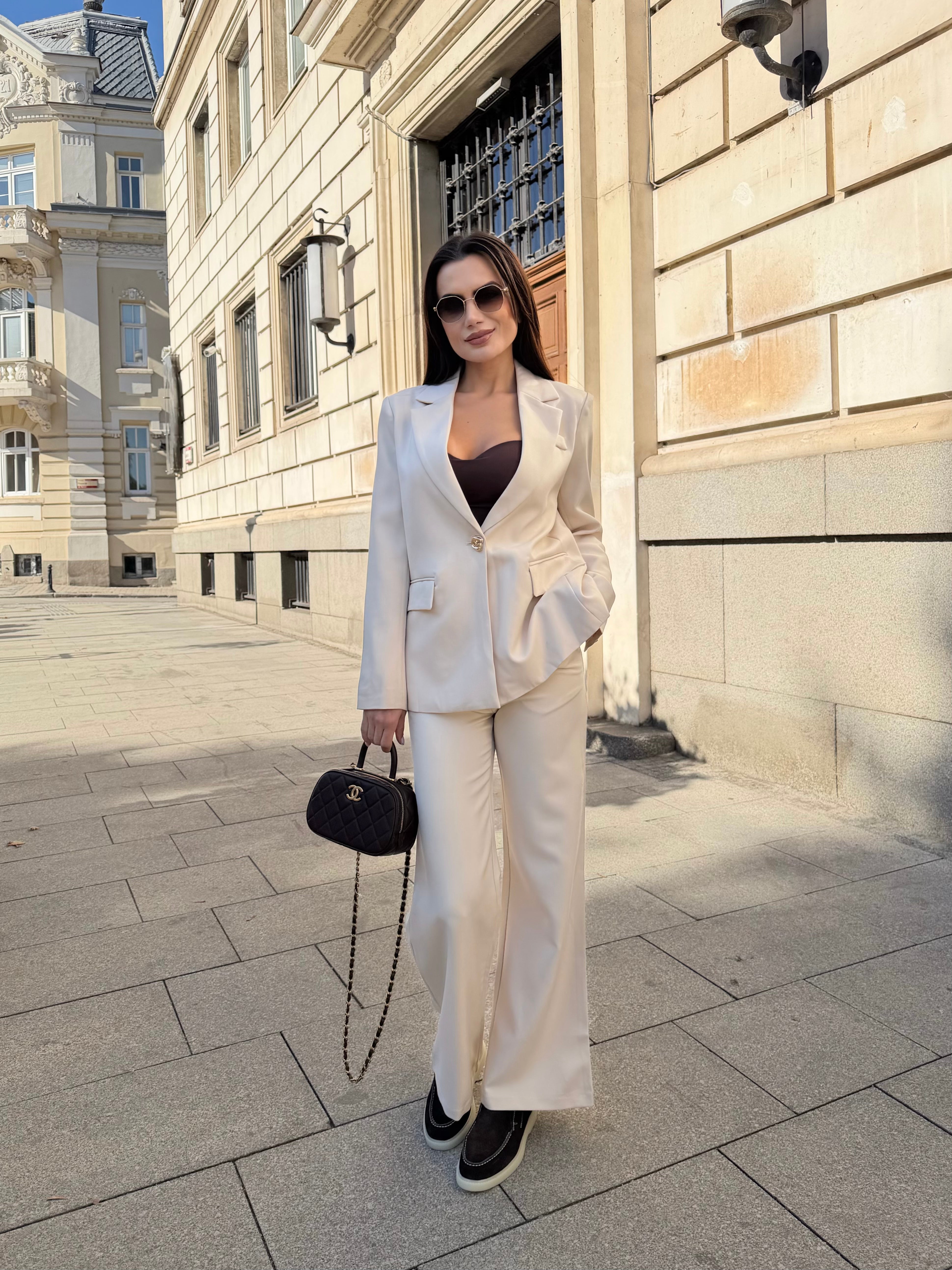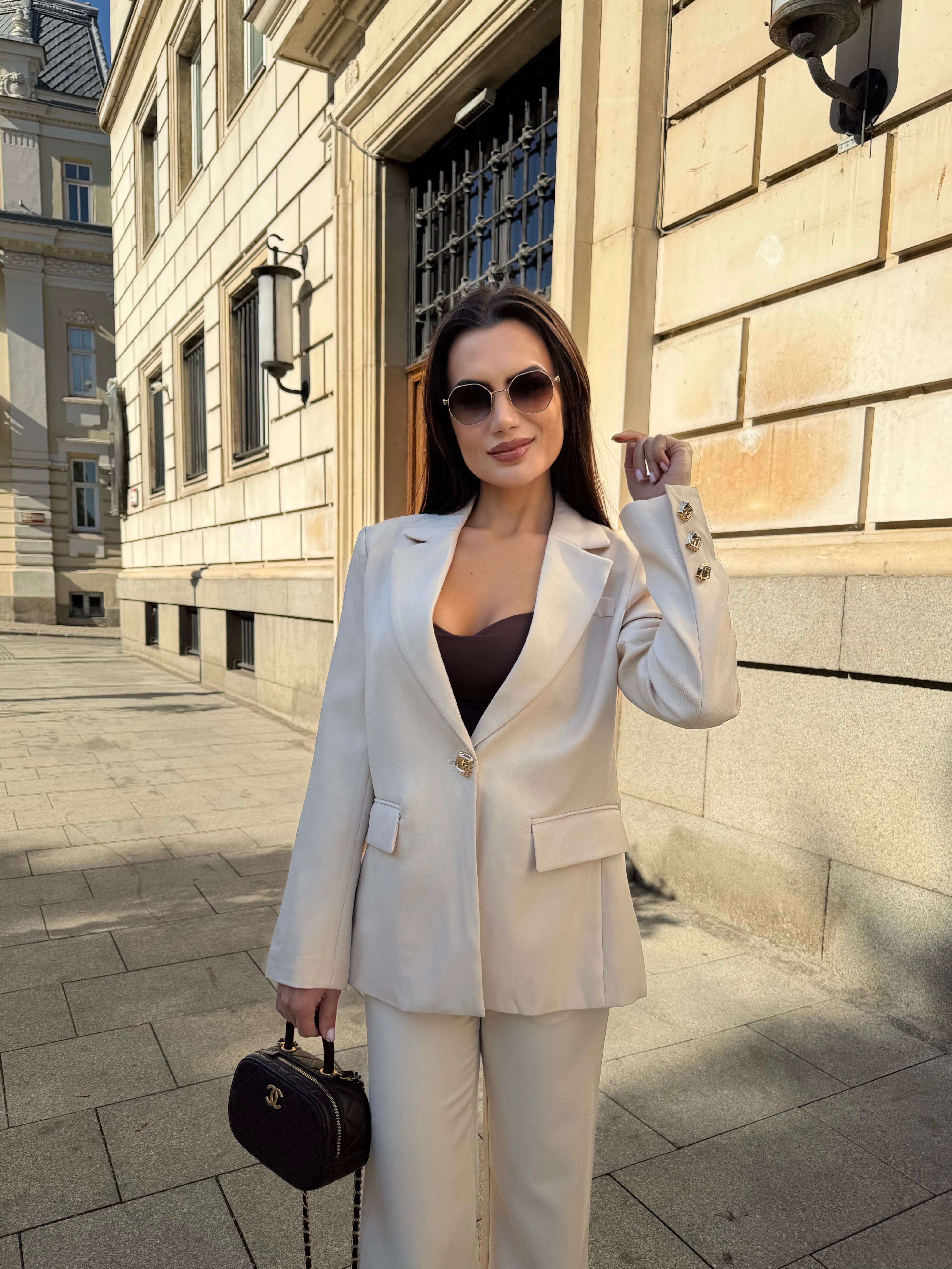Costum luxos din două piese – sacou și pantaloni, creat pentru femeia modernă cu atenție la detalii.