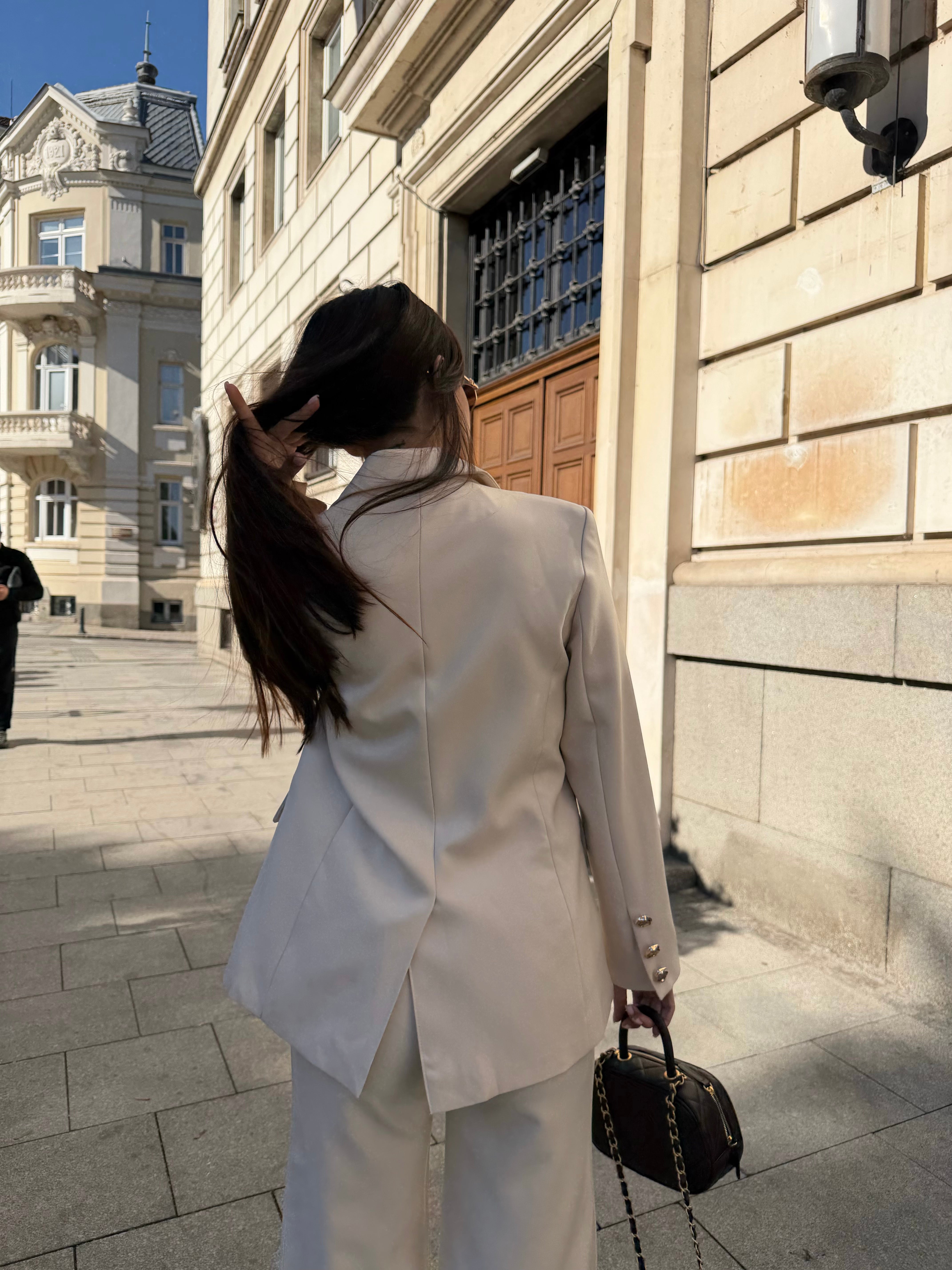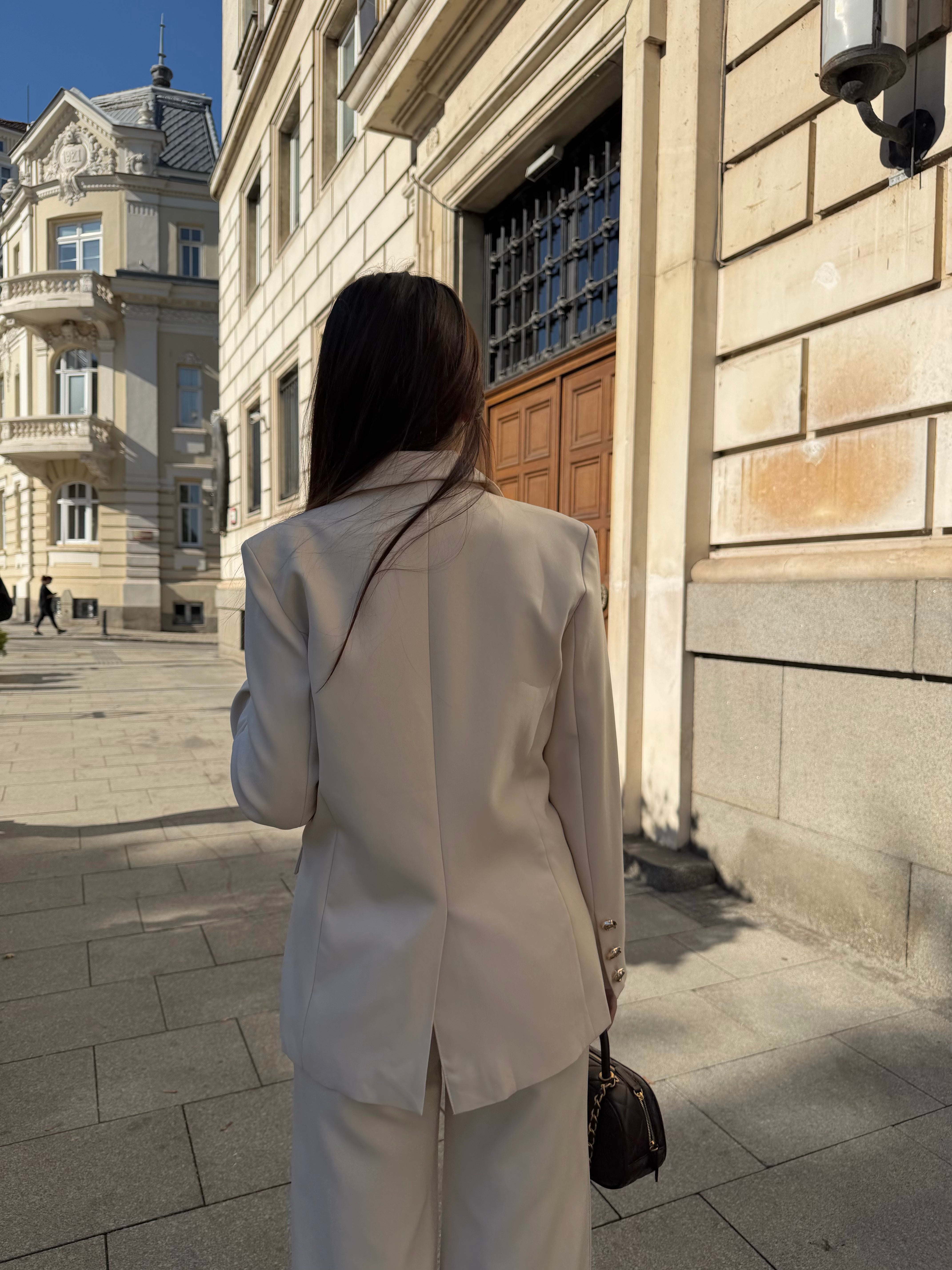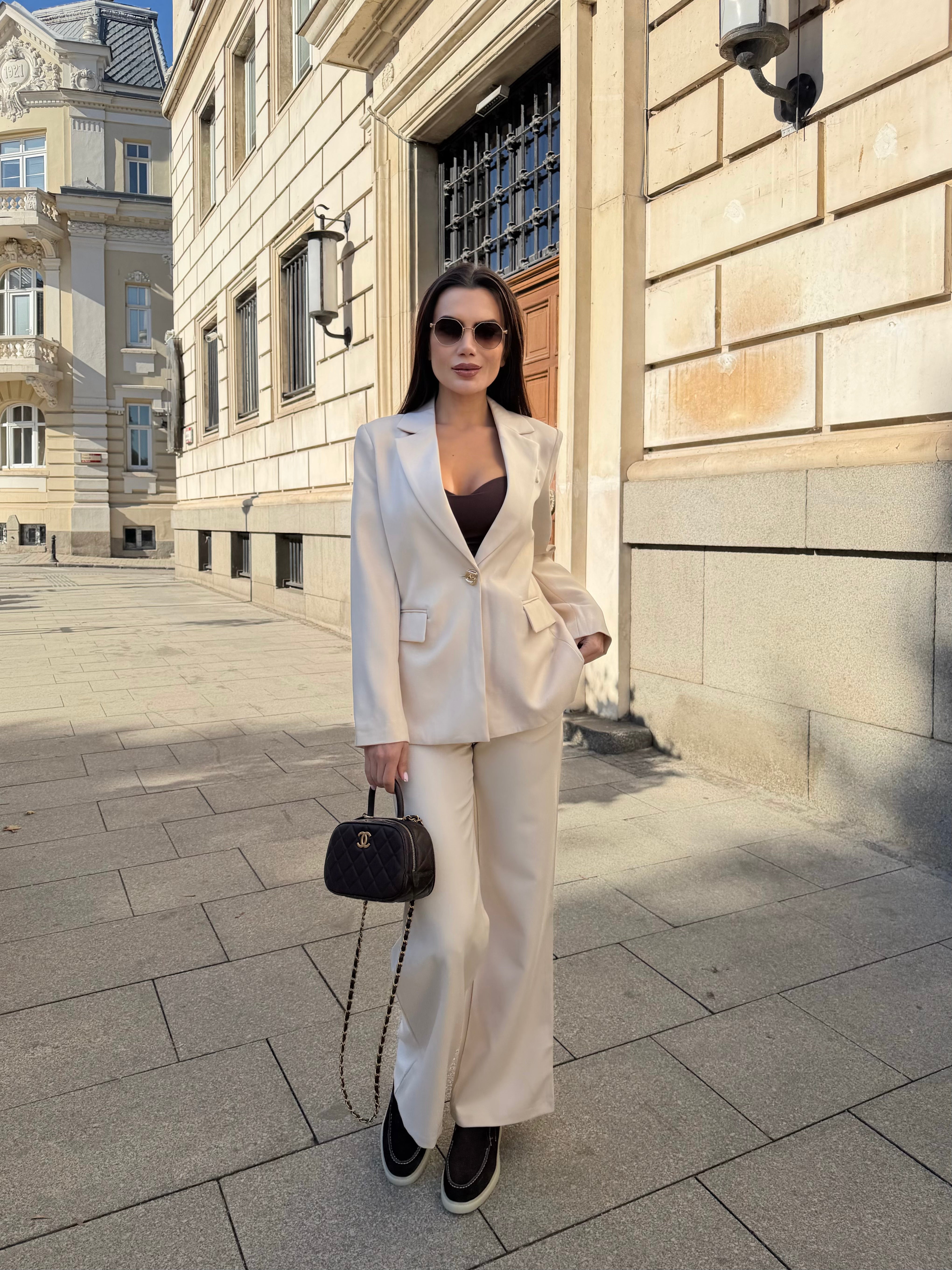 Costum luxos din două piese – sacou și pantaloni, creat pentru femeia modernă cu atenție la detalii.