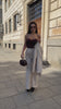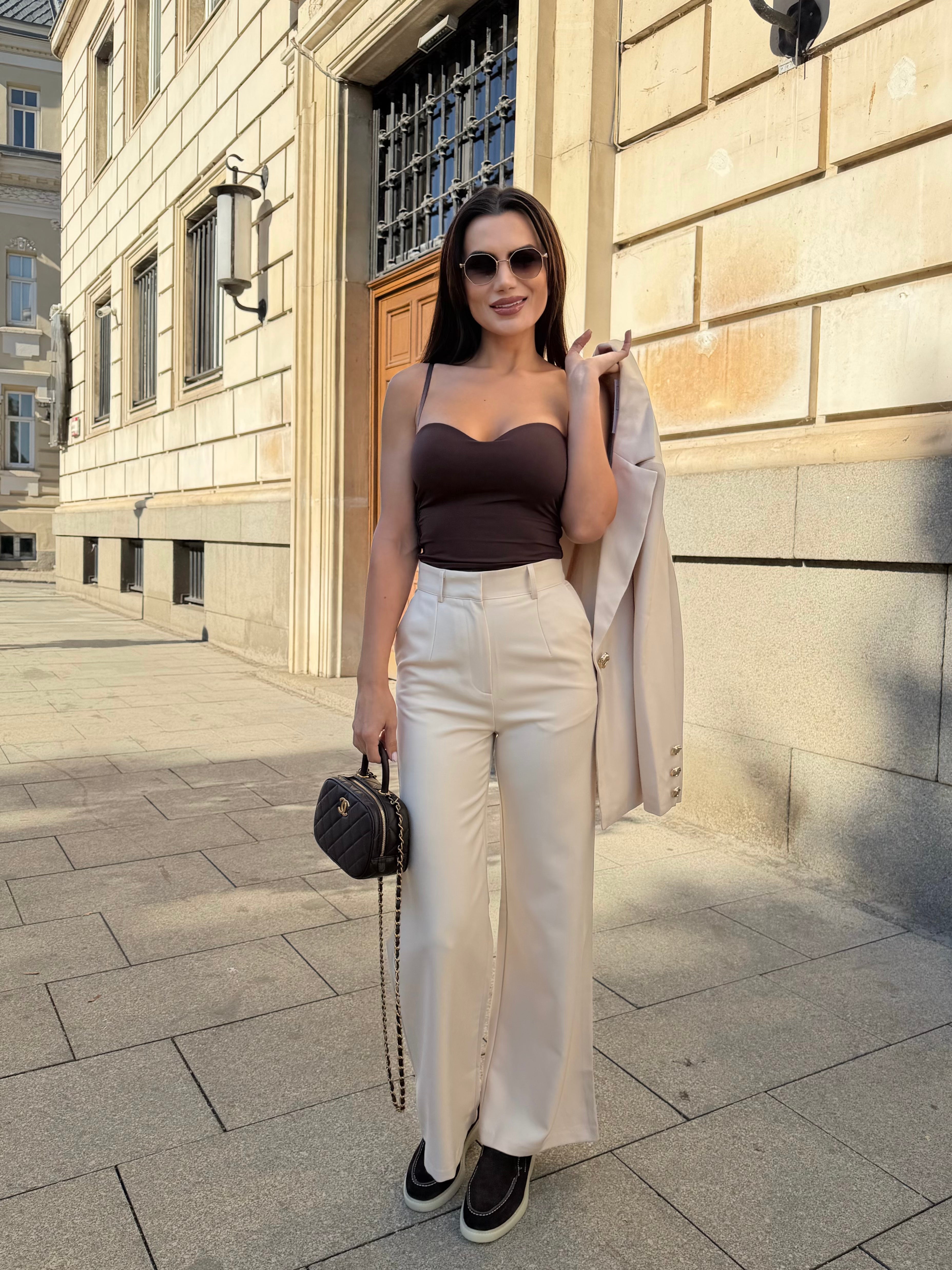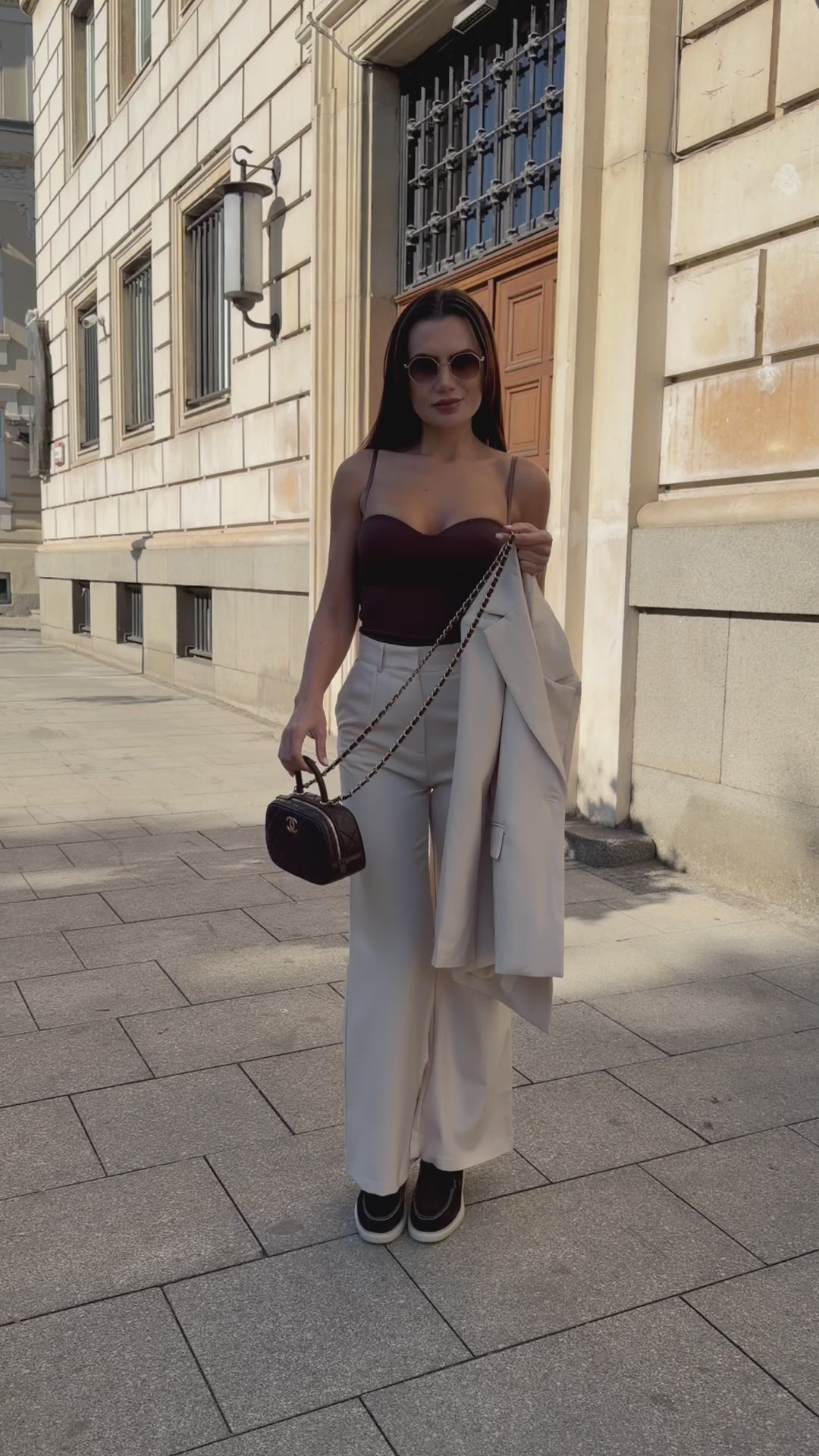 Pantalonii au talie înaltă și o siluetă ușor evazată, care alungește picioarele și asigură confort și rafinament în fiecare mișcare.