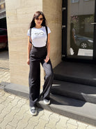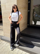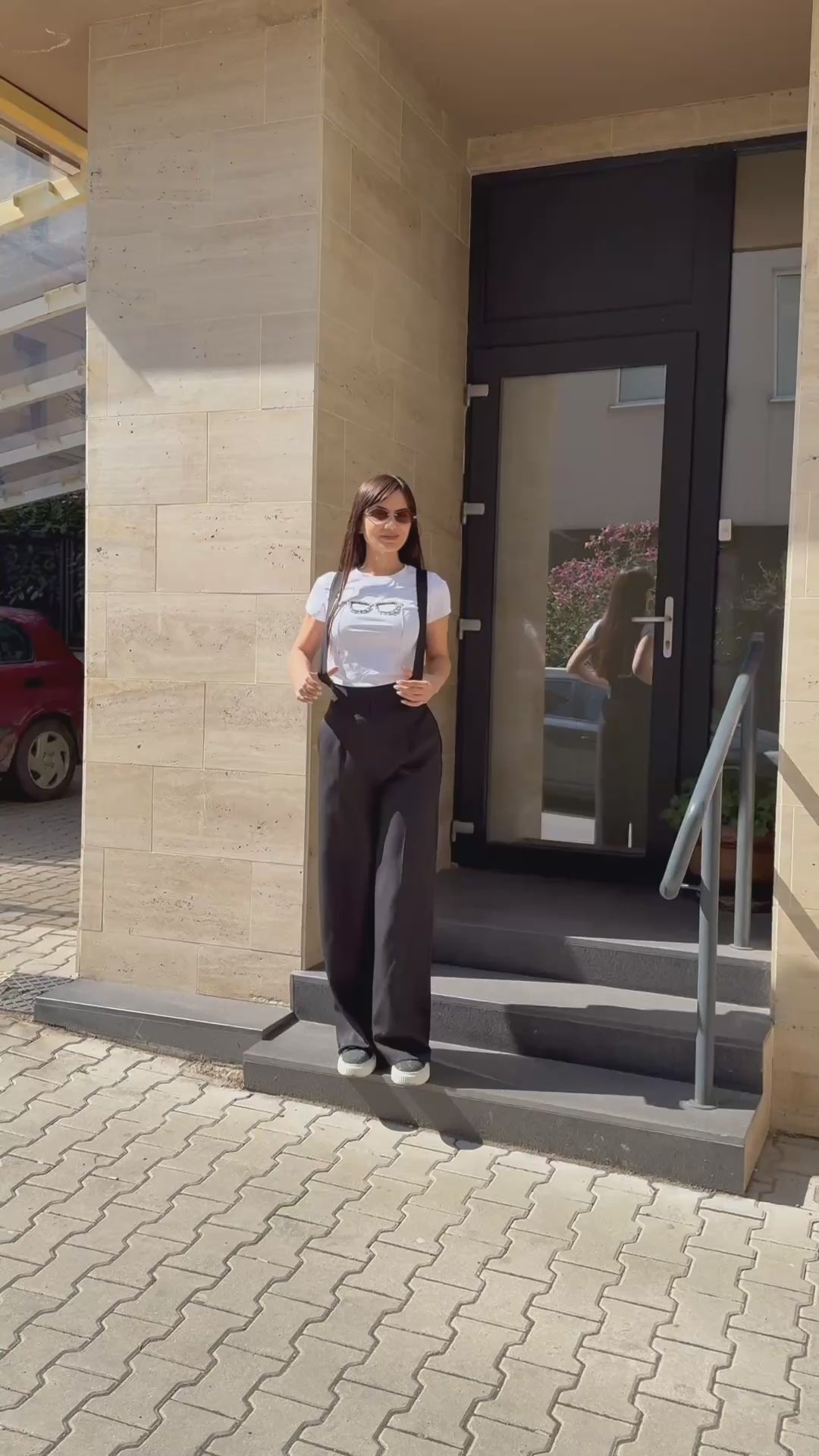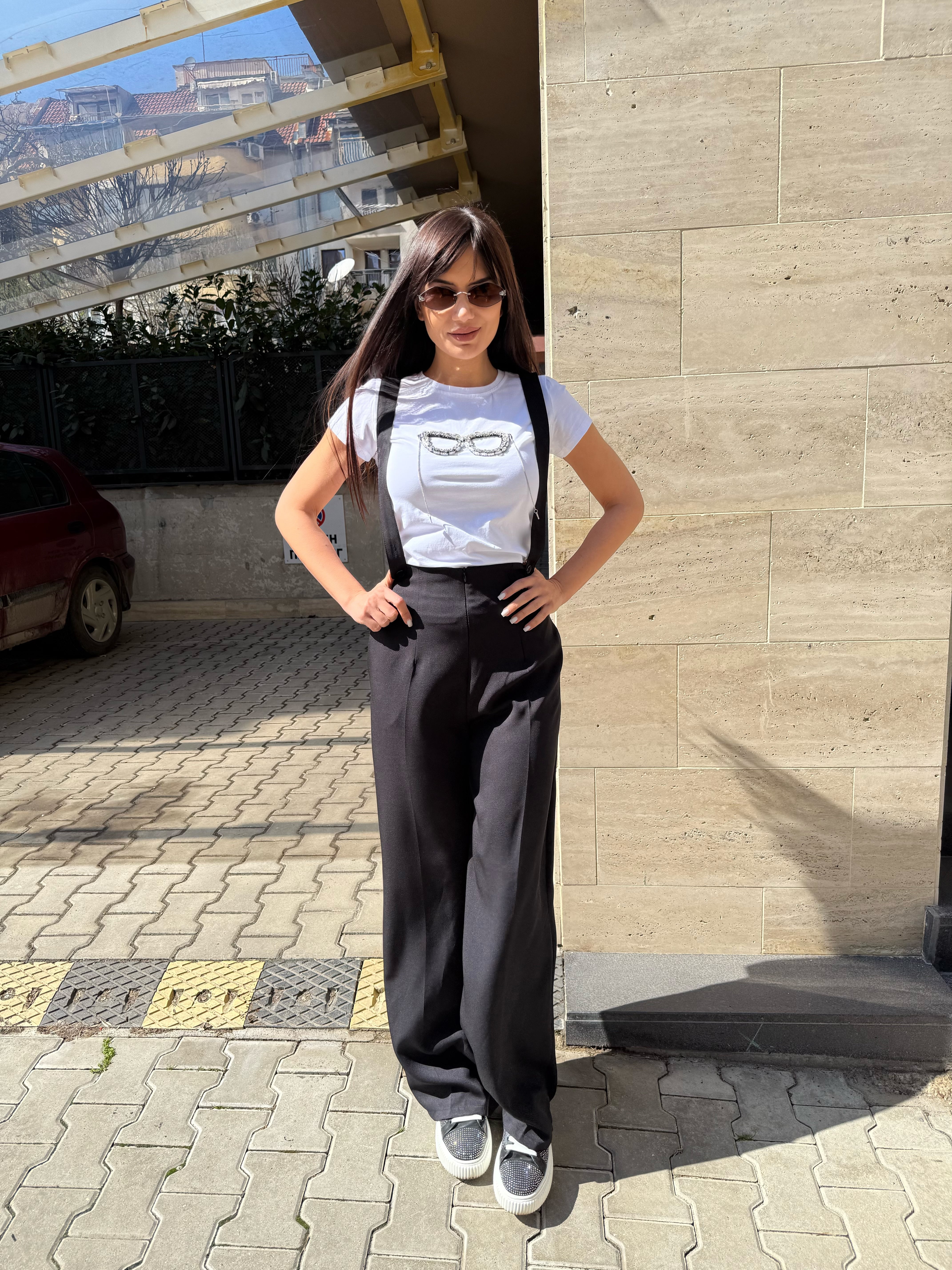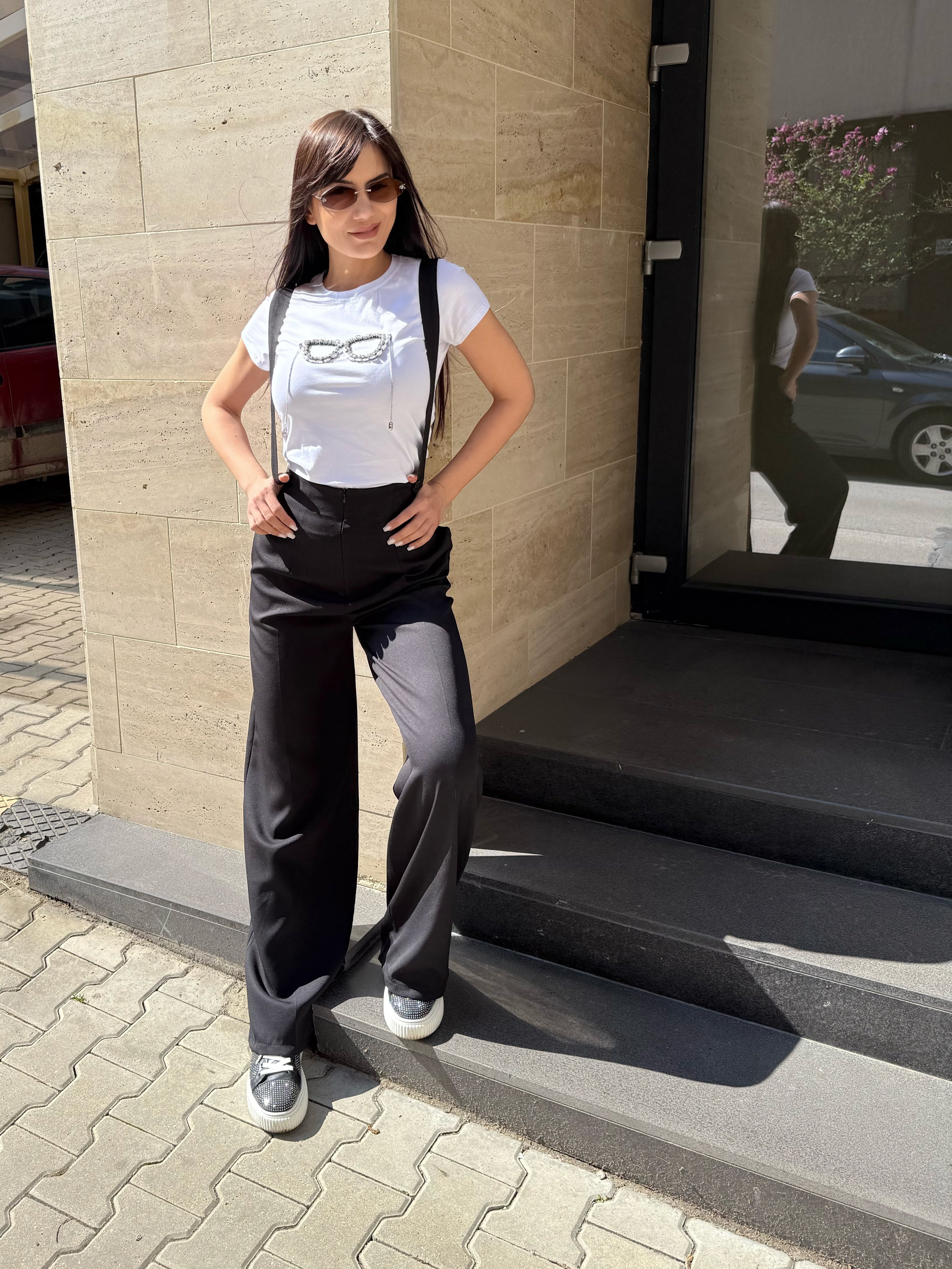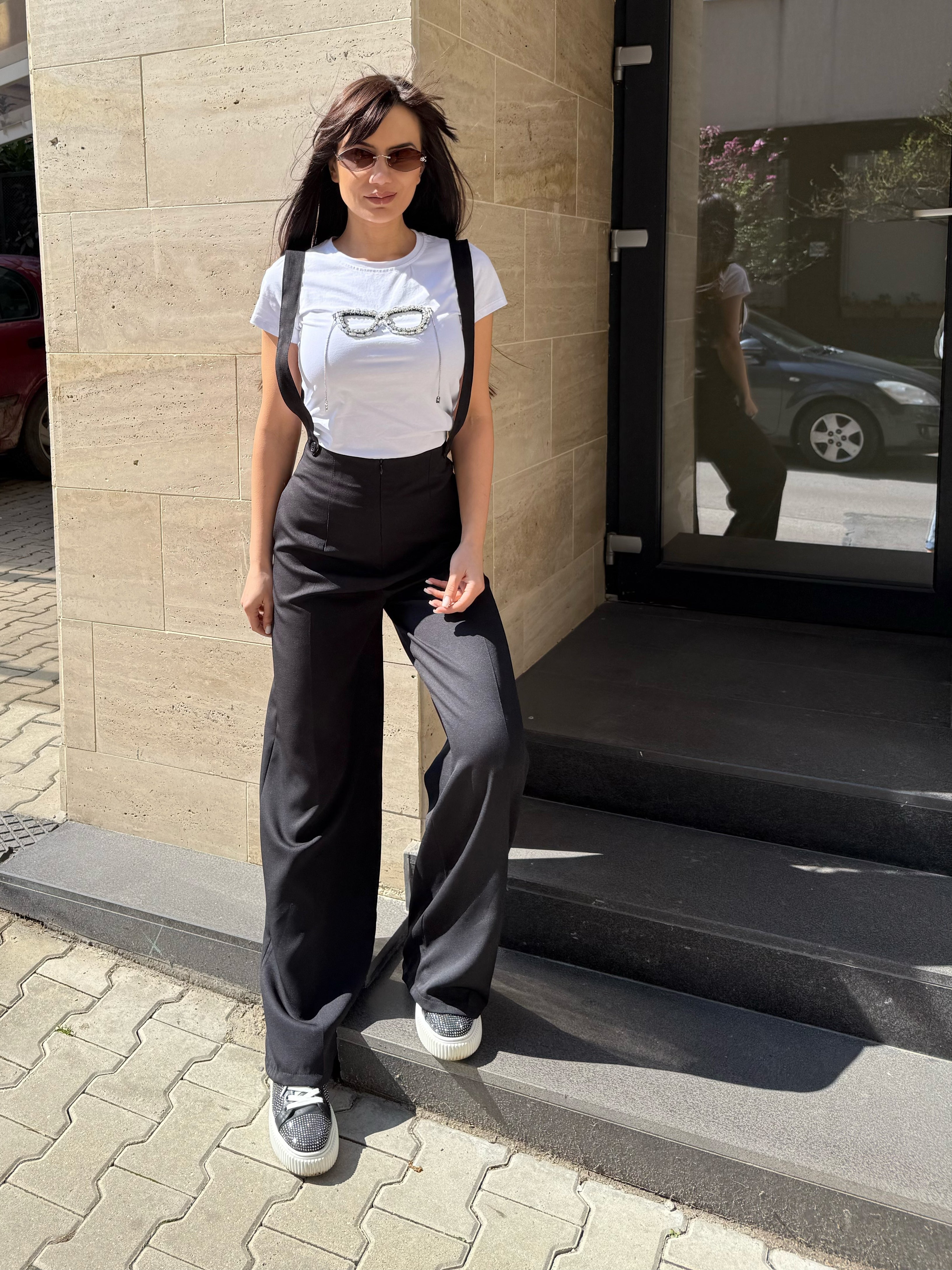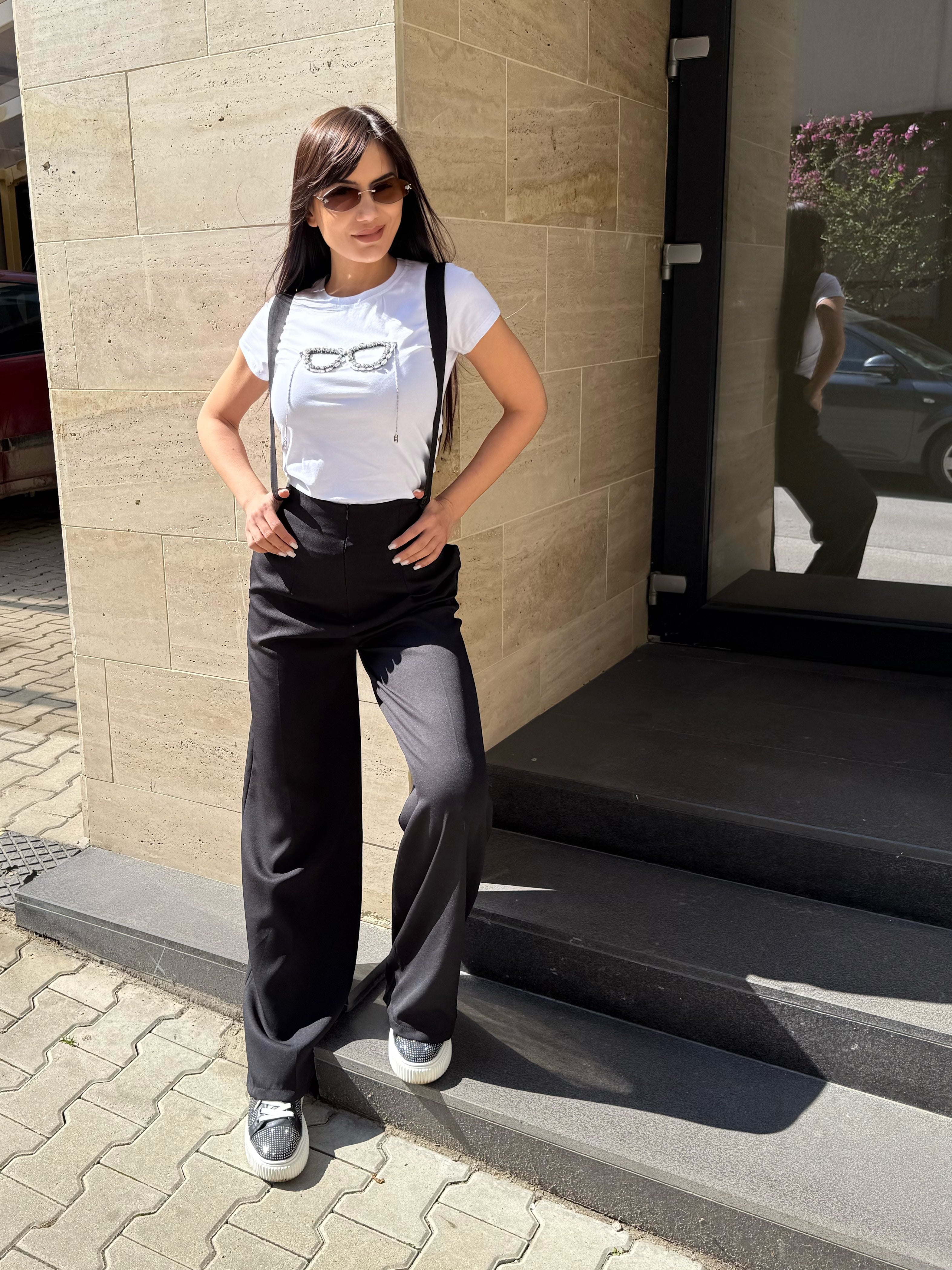 PANTALONI sport-elegați, cu talie înaltă și bretele. Se închid cu fermoar în față și au buzunare laterale;