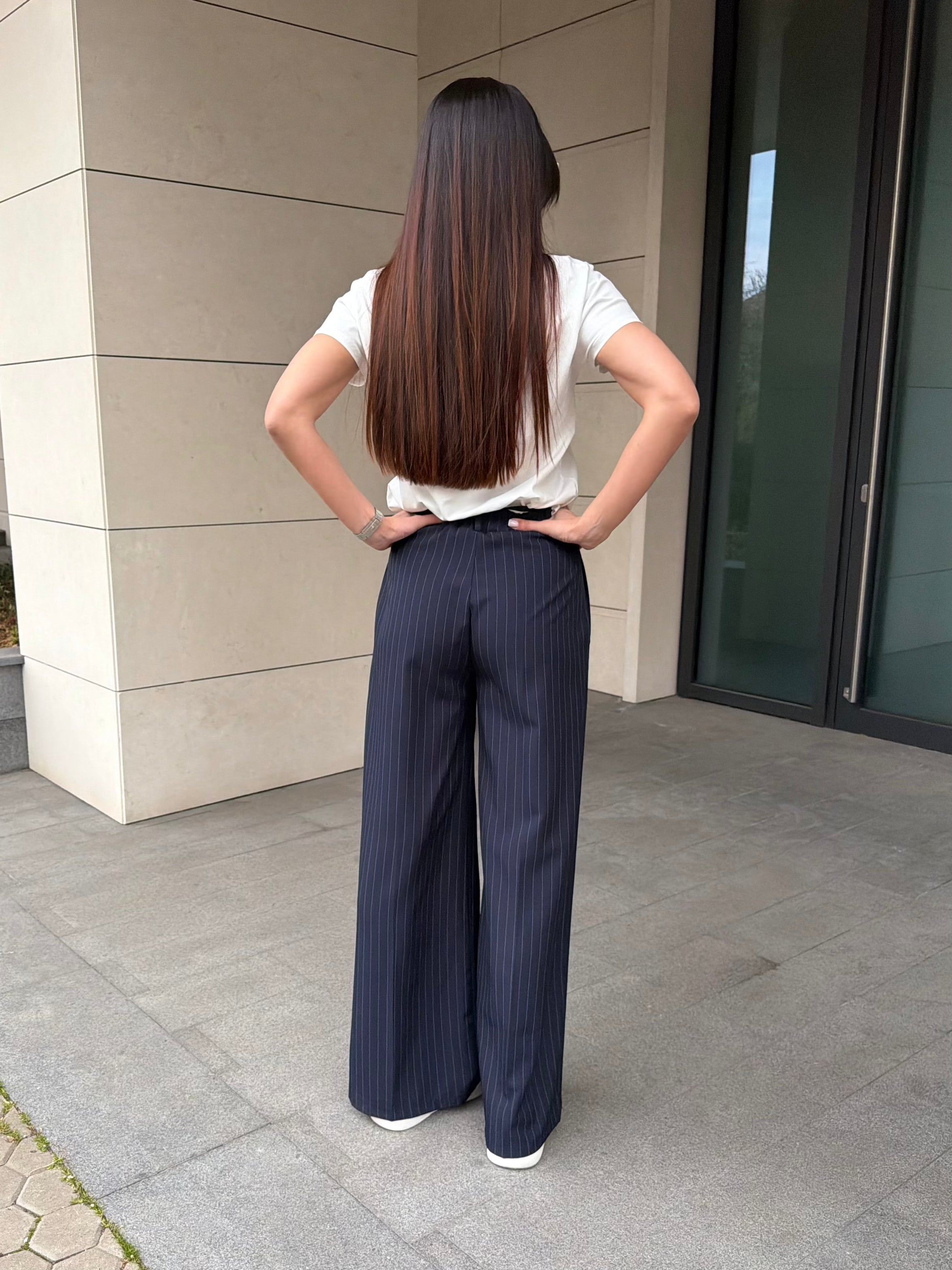 Pantaloni eleganți cu talie înaltă și siluetă dreaptă, amplă, care alungește figura și oferă un aspect sofisticat. Modelul are dungi fine și pliuri delicate în partea din față pentru un look și mai elegant.