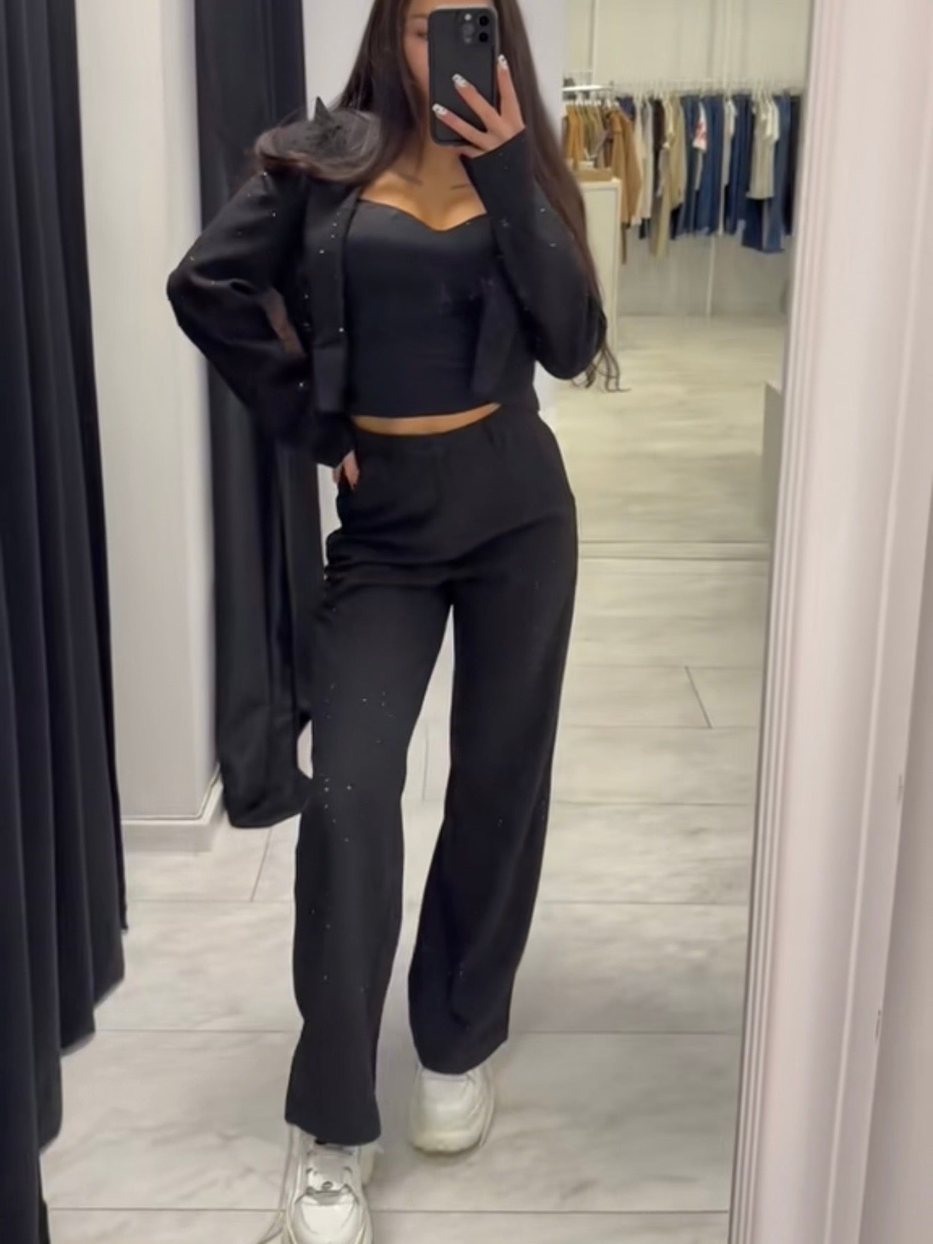 Adaugă o strălucire elegantă ținutei tale cu CRYSTAL BLACK TROUSERS – pantaloni drepți, negri, confecționați dintr-un material neted și decorați cu mini-cristale pe toată lungimea. Modelul este în același timp rafinat și modern, combinând confortul unei siluete de zi cu un accent luxos.