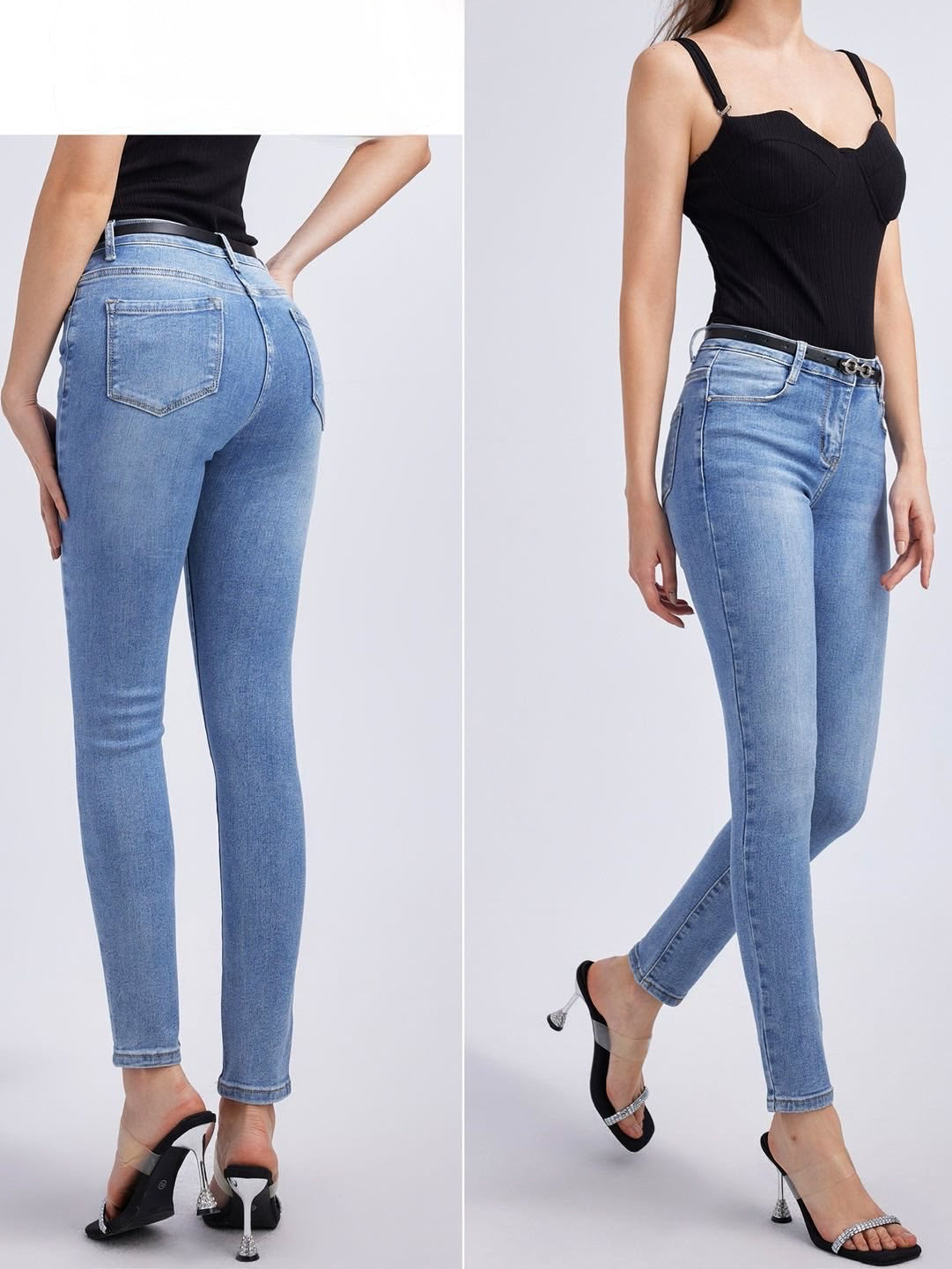 Blugi SLIM FIT de culoare albastră elegantă, cu curea din piele neagră.
