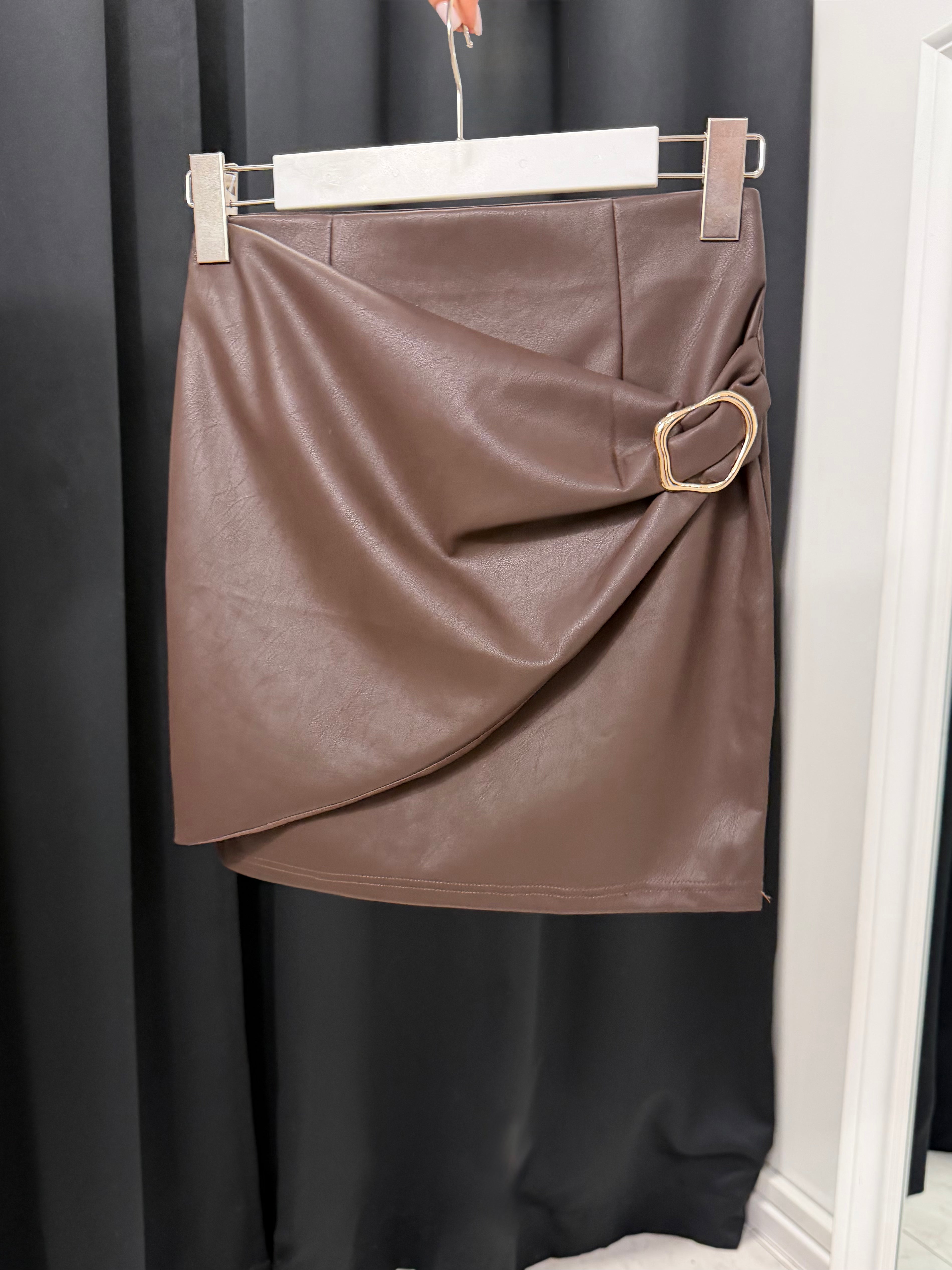 Fustă de piele elegantă și seducătoare, confecționată din piele ecologică de înaltă calitate, cu un finisaj satinat fin. Modelul are un frumos efect de drapaj în față și un inel decorativ auriu care formează o asimetrie unică și subliniază talia. Lungimea este confortabilă, iar croiala este concepută pentru a îmbrățișa silueta și a crea un aspect elegant și modern.