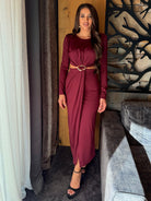 Elementul metalic auriu din talie adaugă un accent rafinat și modelează vizual silueta.