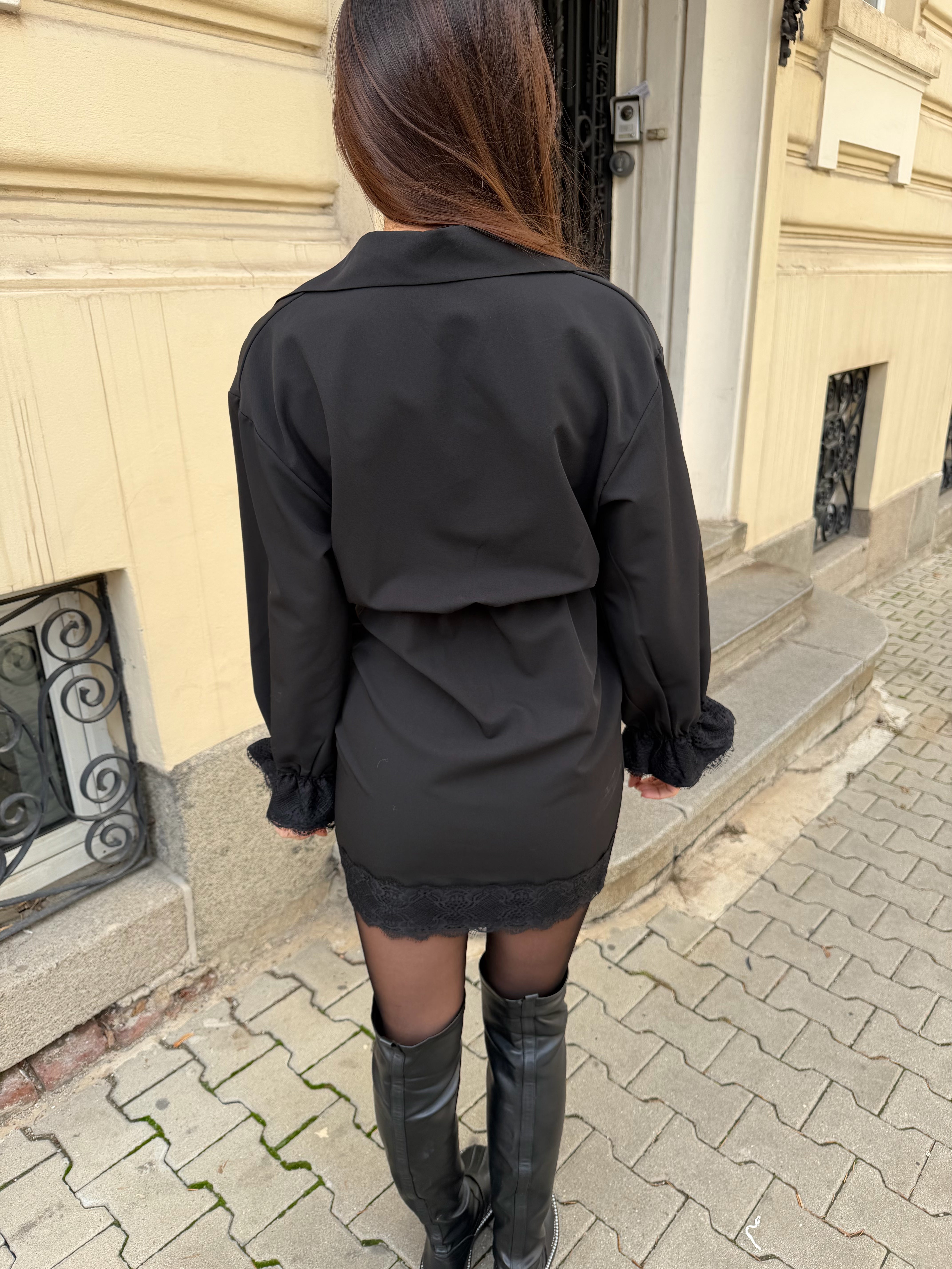 Mânecile tip balon se termină cu o manșetă delicată din dantelă, iar banda asimetrică din dantelă de la tiv adaugă lejeritate și rafinament. Perfectă atât cu cizme înalte, cât și cu tocuri – pentru un stil urban, de seară sau festiv.