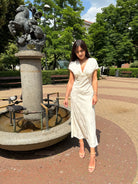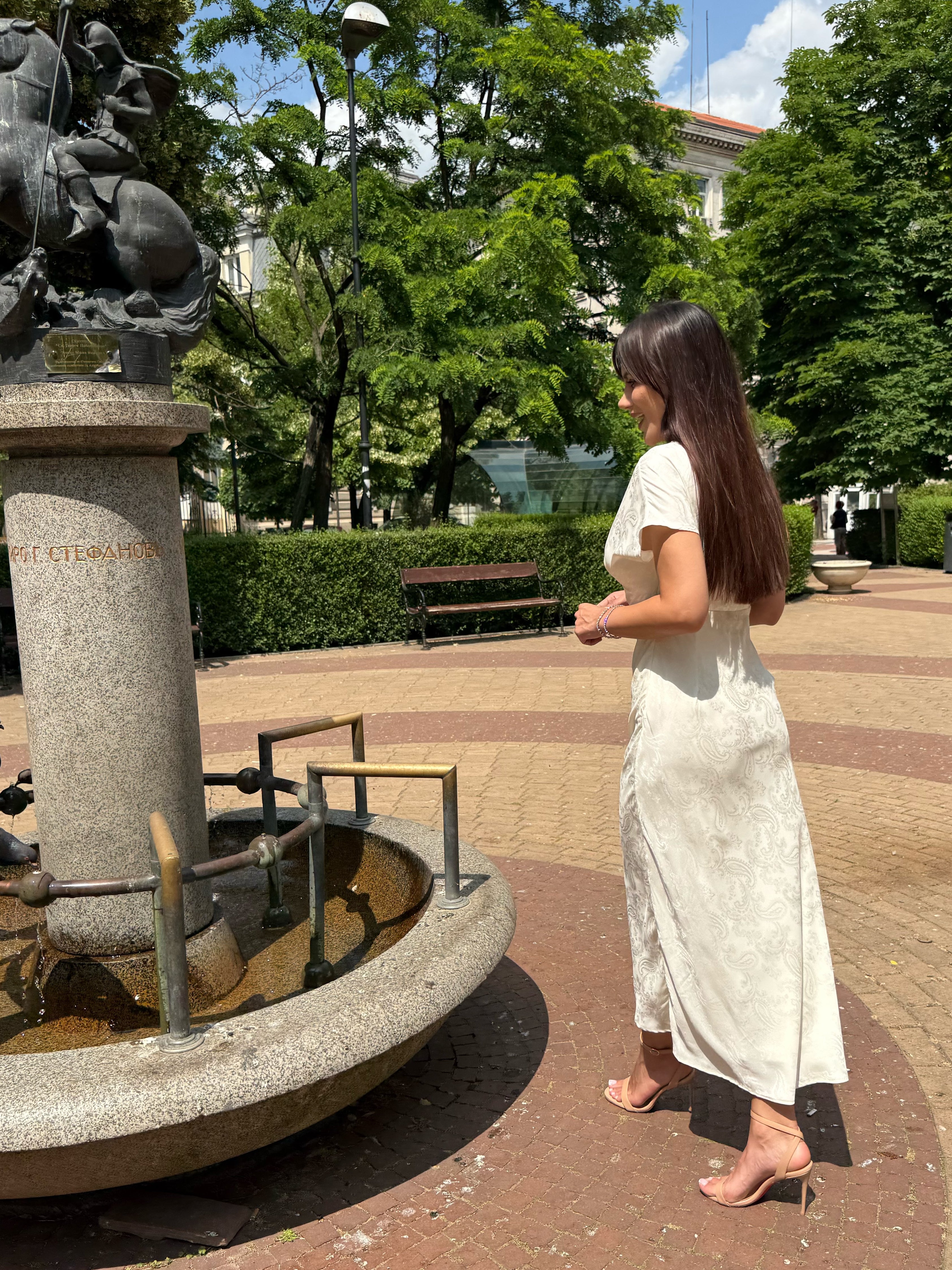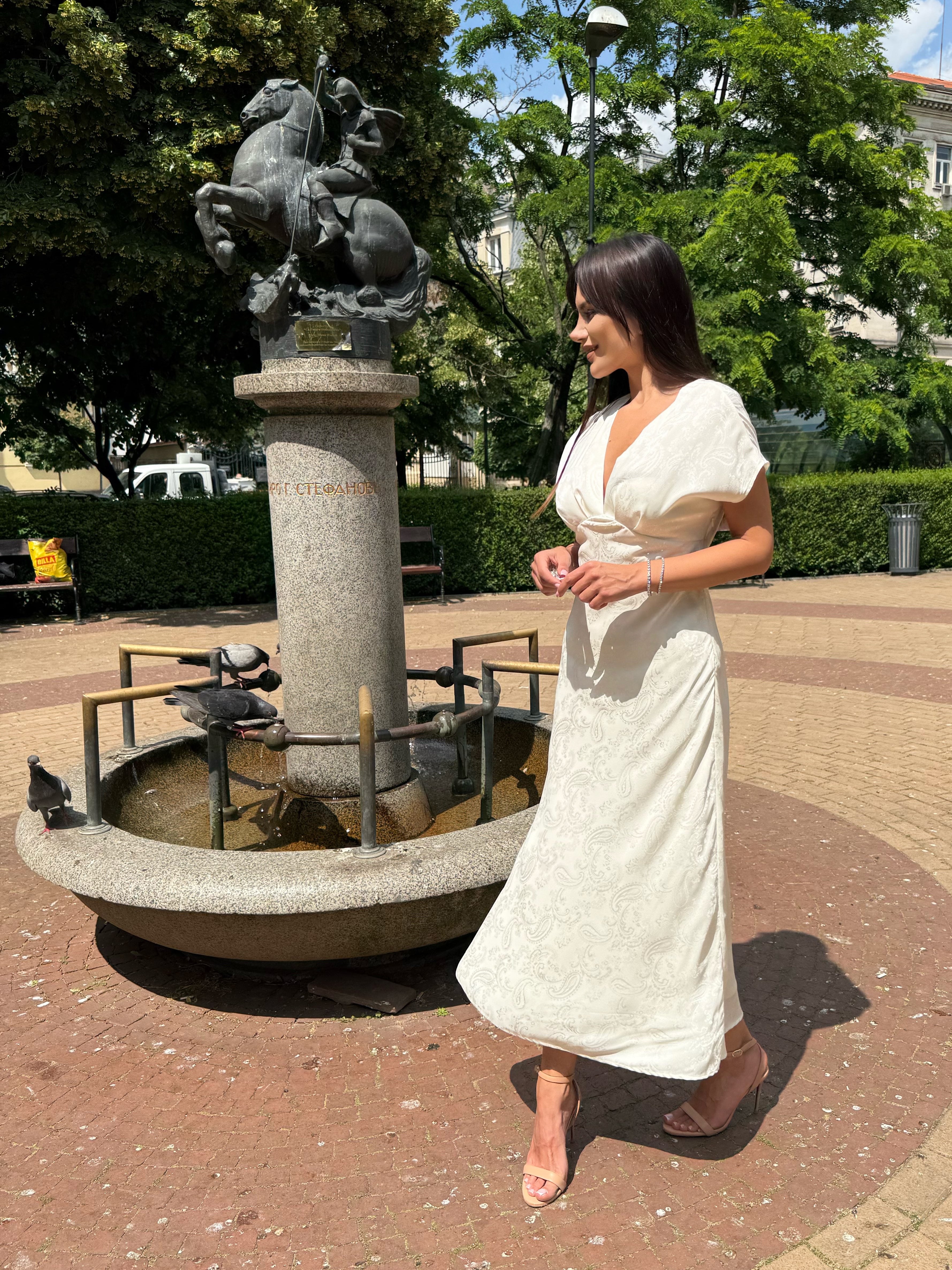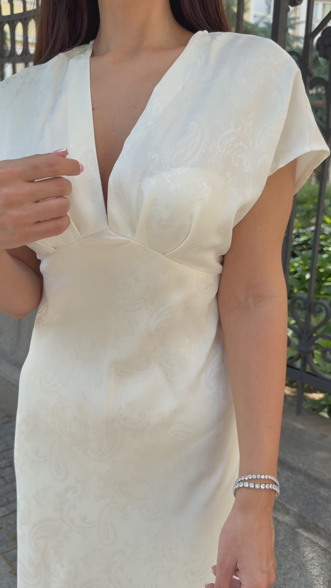 O rochie sofisticată din satin, cu un model delicat în relief și un decolteu elegant în V. O alegere perfectă pentru evenimente formale, ieșiri de seară sau ocazii speciale.