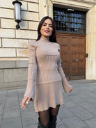 Inspirată de eleganța relaxată a parizienelor, LA PARISIENNE este o rochie care subliniază feminitatea fără efort. O structură fină tricotată care urmează liniile corpului, combinată cu finisaje delicate ondulate pentru o senzație de luxury knitwear.