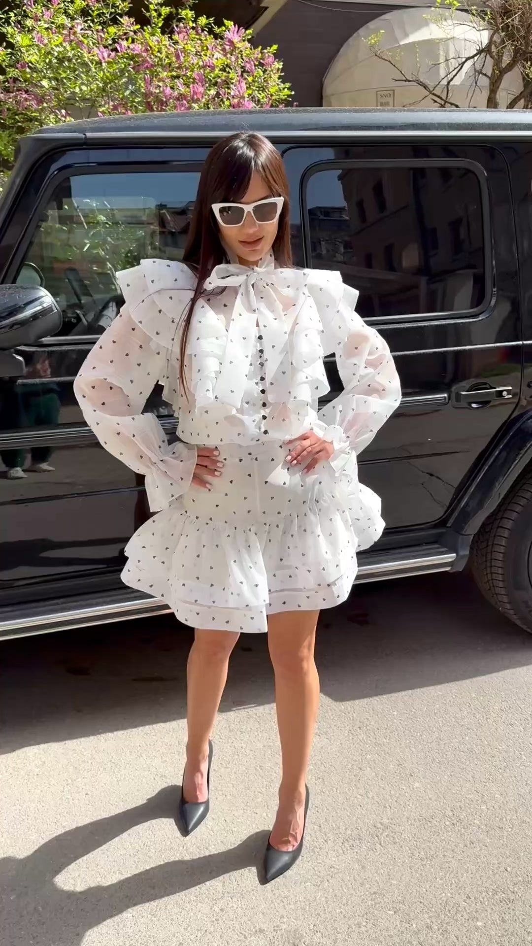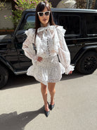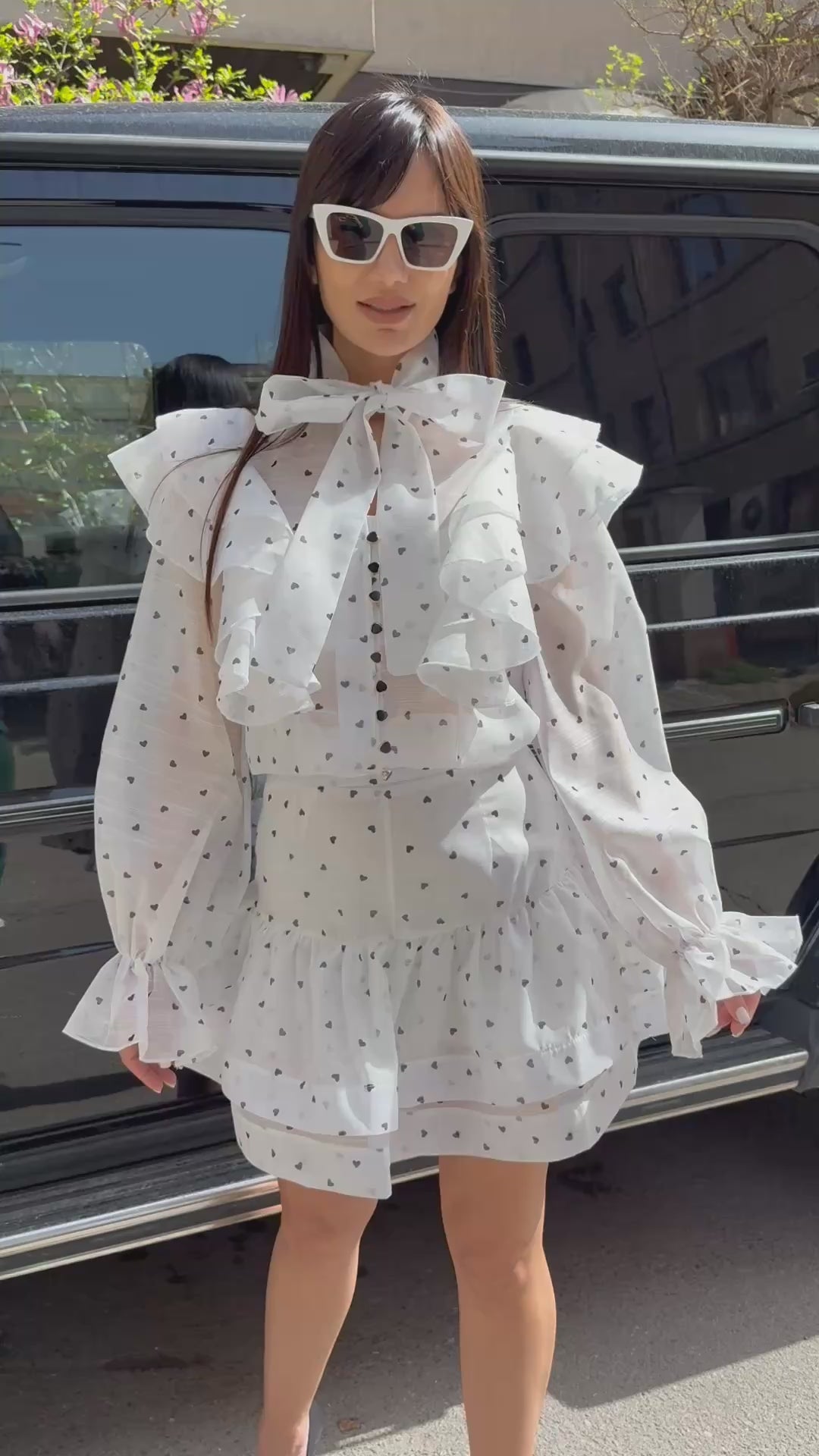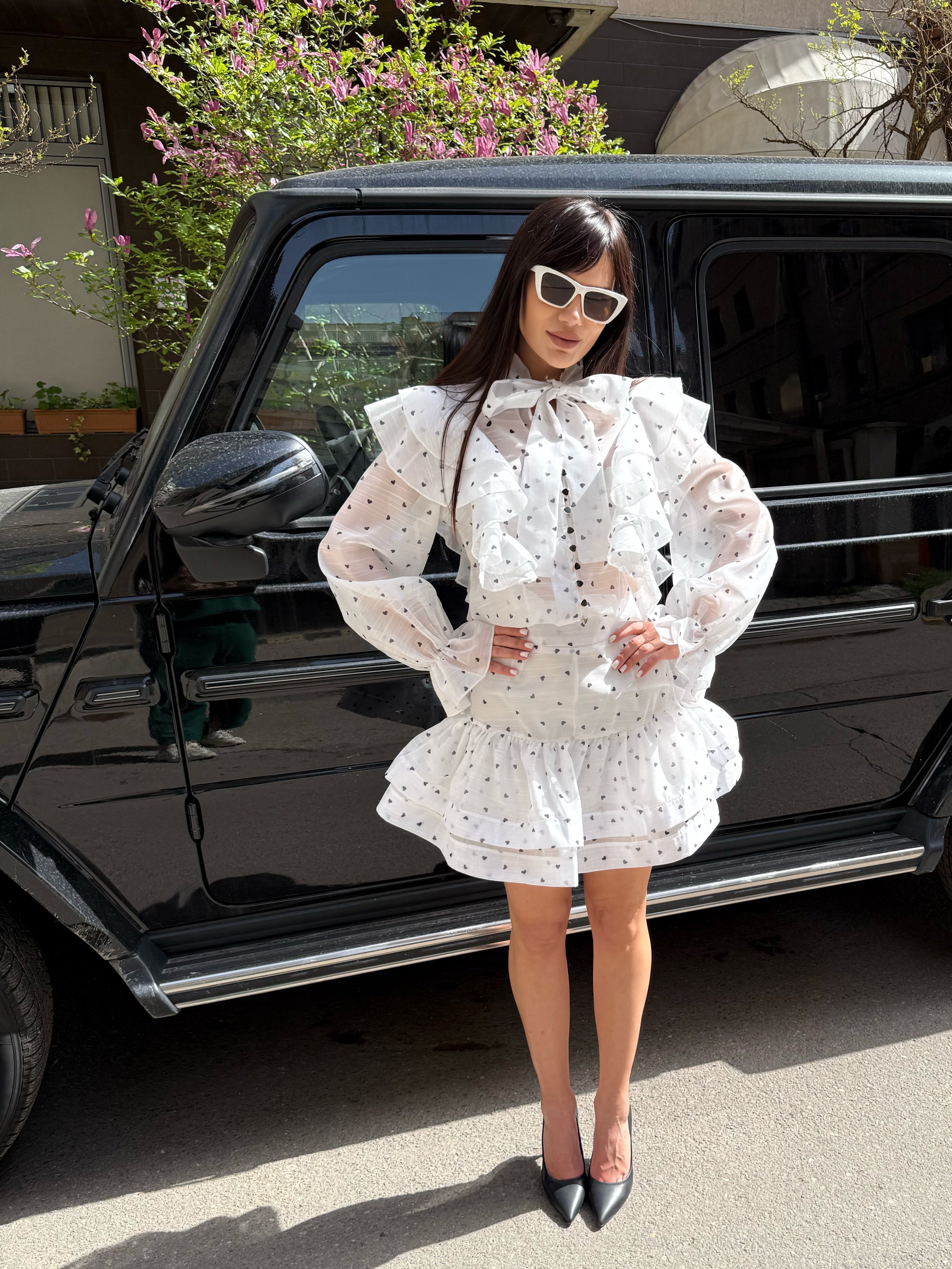 CĂMAȘĂ lejeră, cu panglică la decolteu și FUSTĂ SCURTĂ cu pantaloni scurți pe interior.