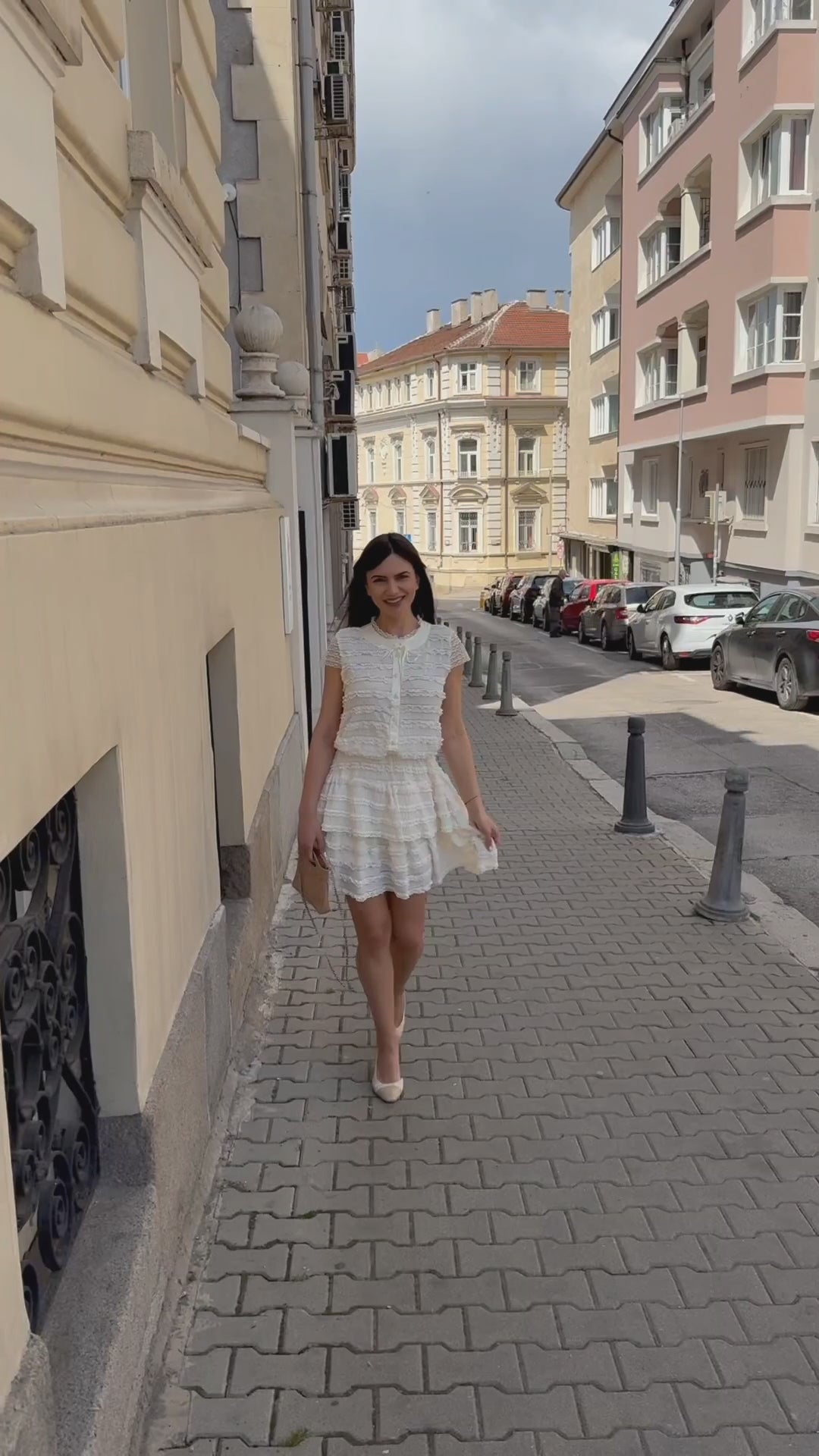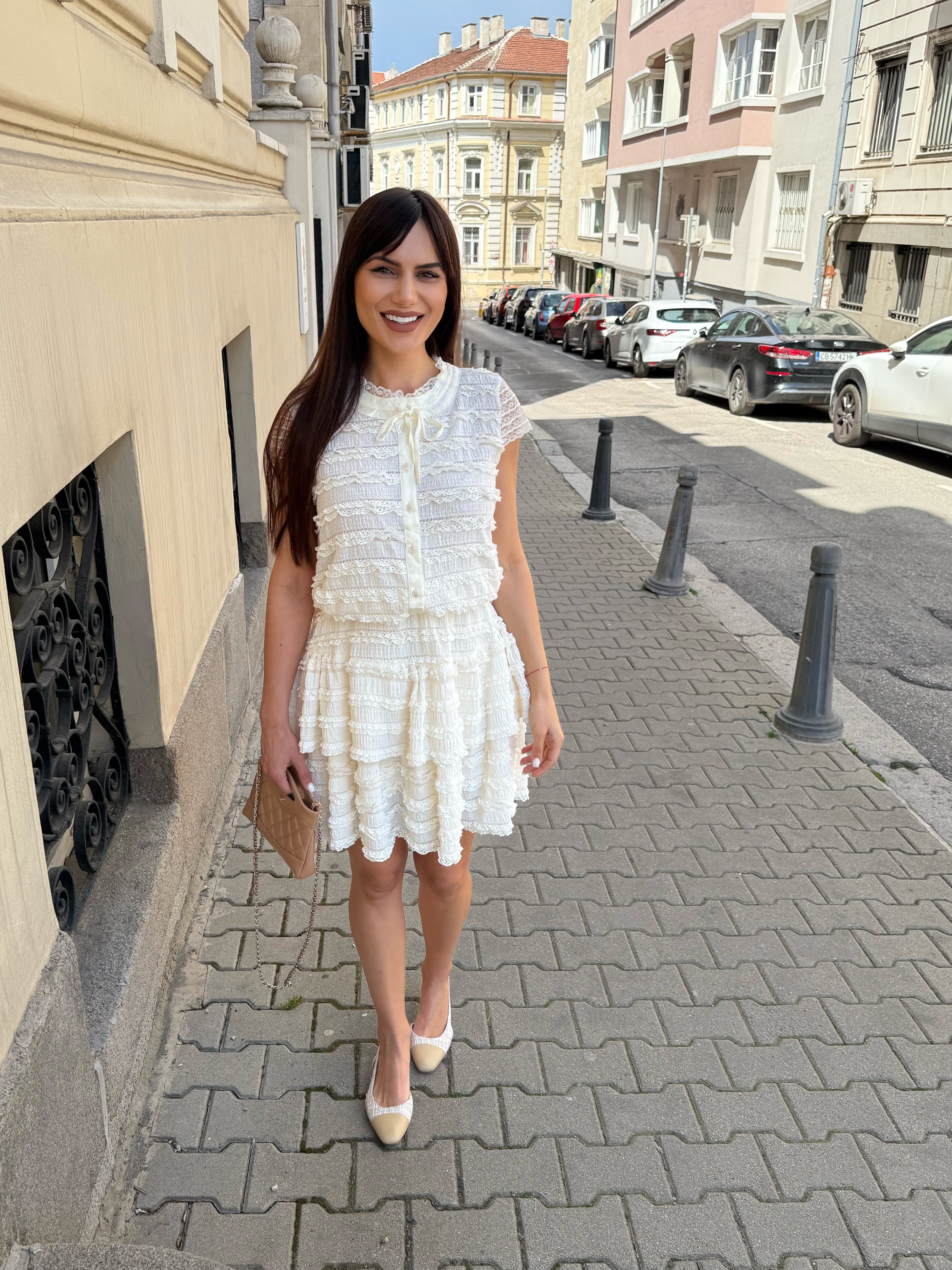 Delicat și elegant SET MONICA, format din două piese, cămașă fără mâneci, cu închidere în față și fustă cu talie înaltă.