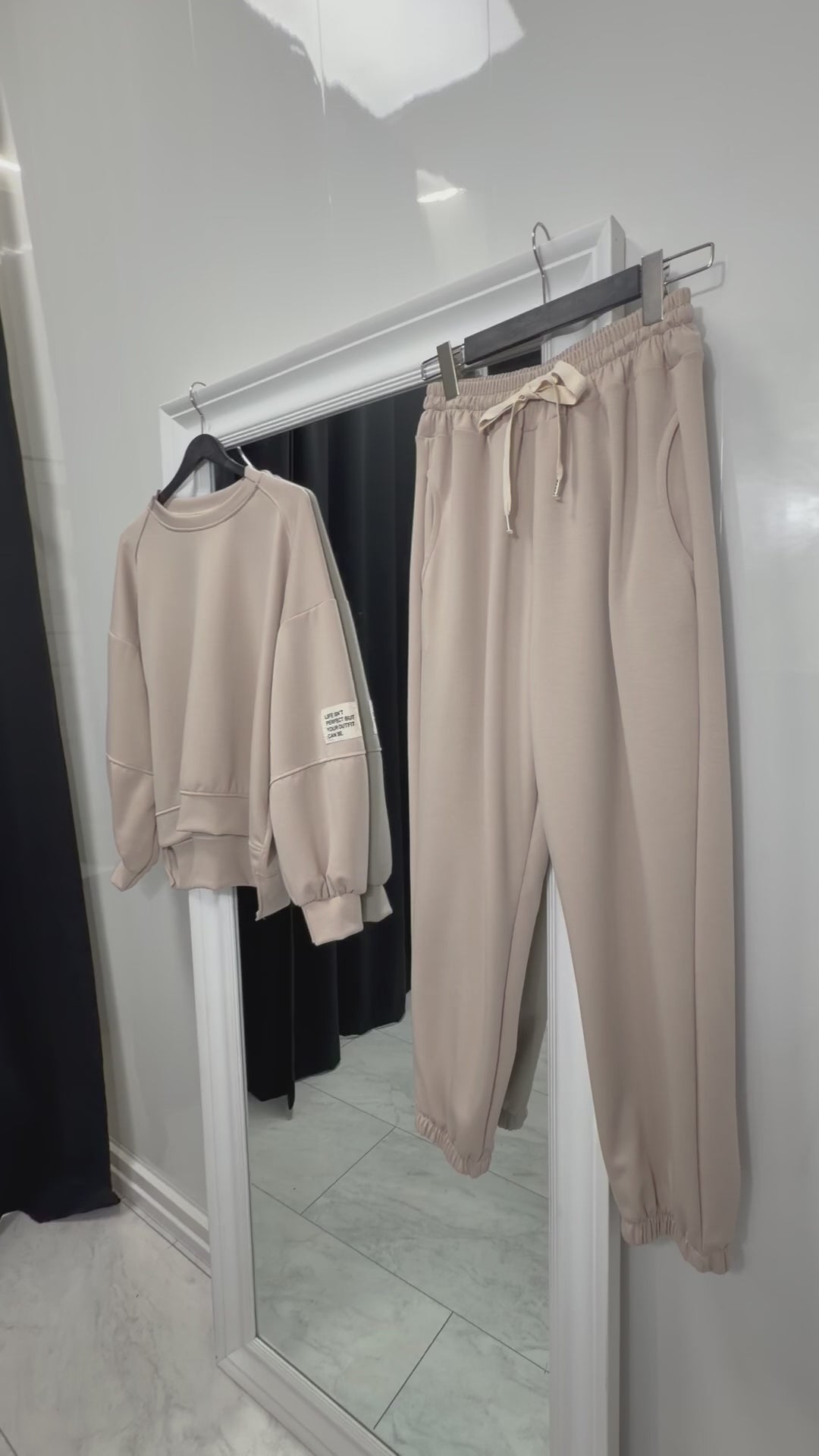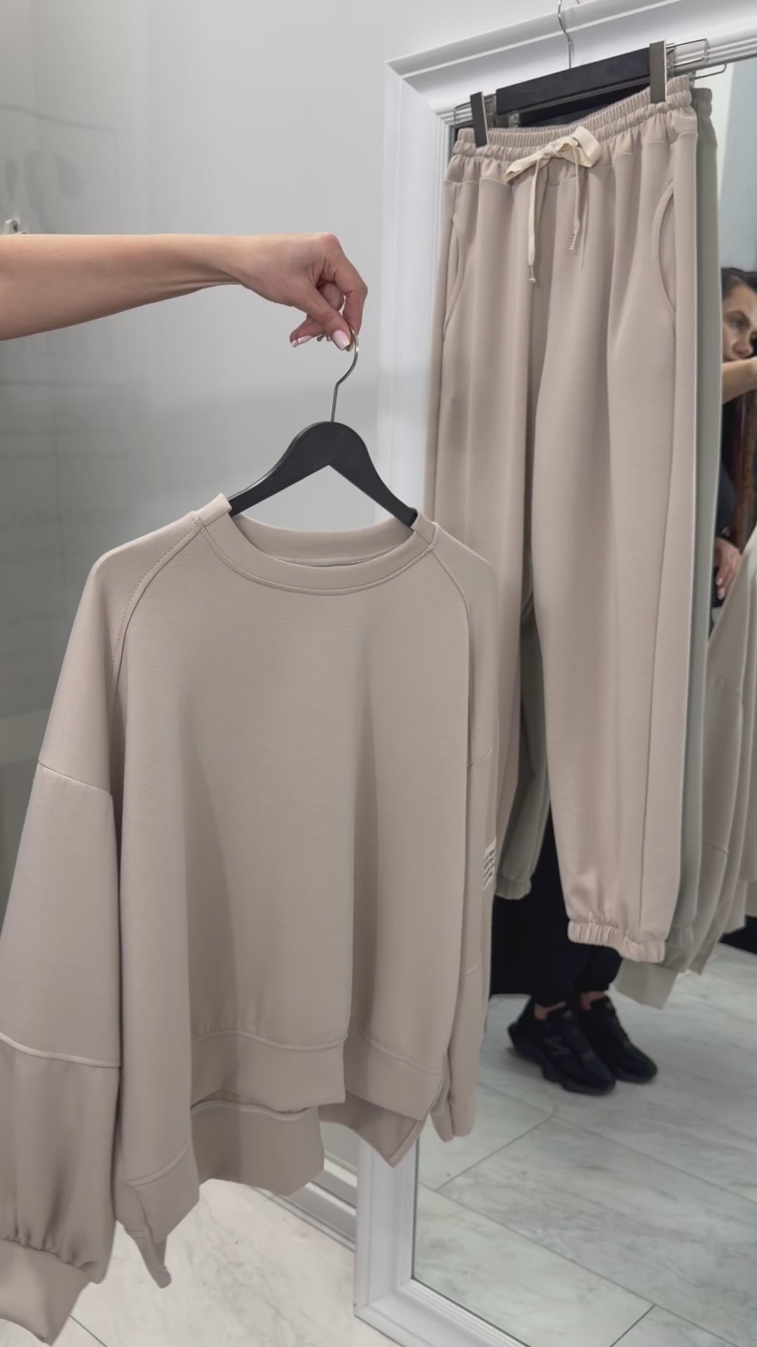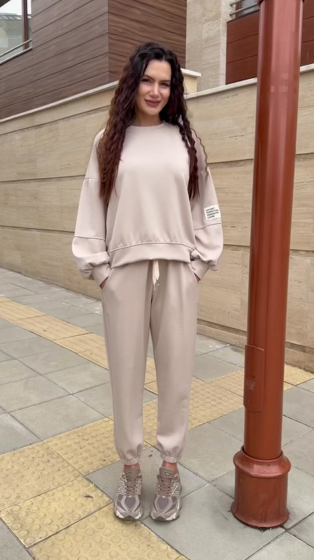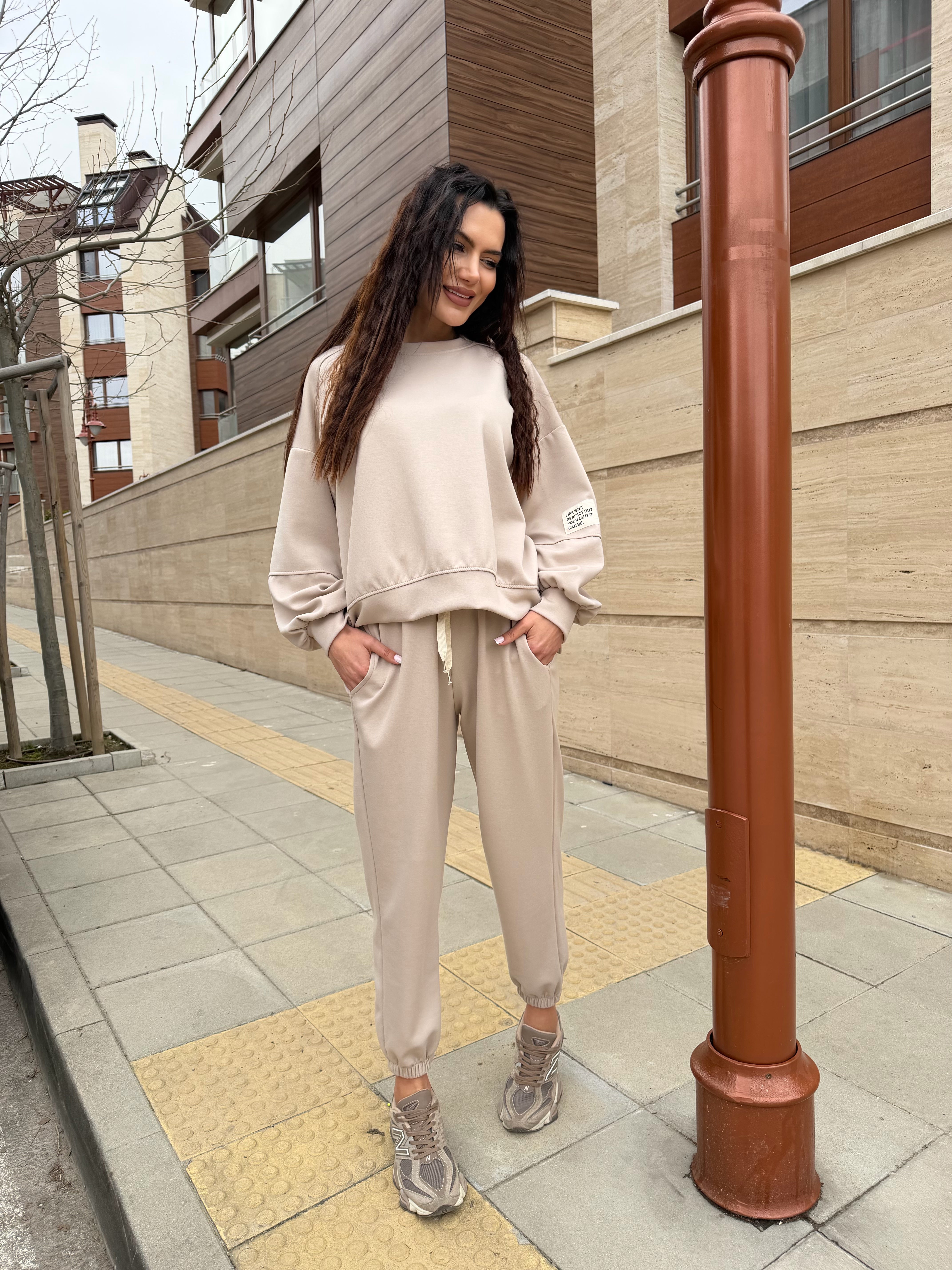 Linia lejeră a bluzei, cu umeri căzuți și mâneci voluminoase, creează un aspect modern, urban, iar pantalonii cu talie elastică conturează o siluetă echilibrată și alungită.