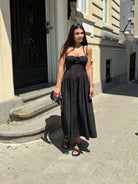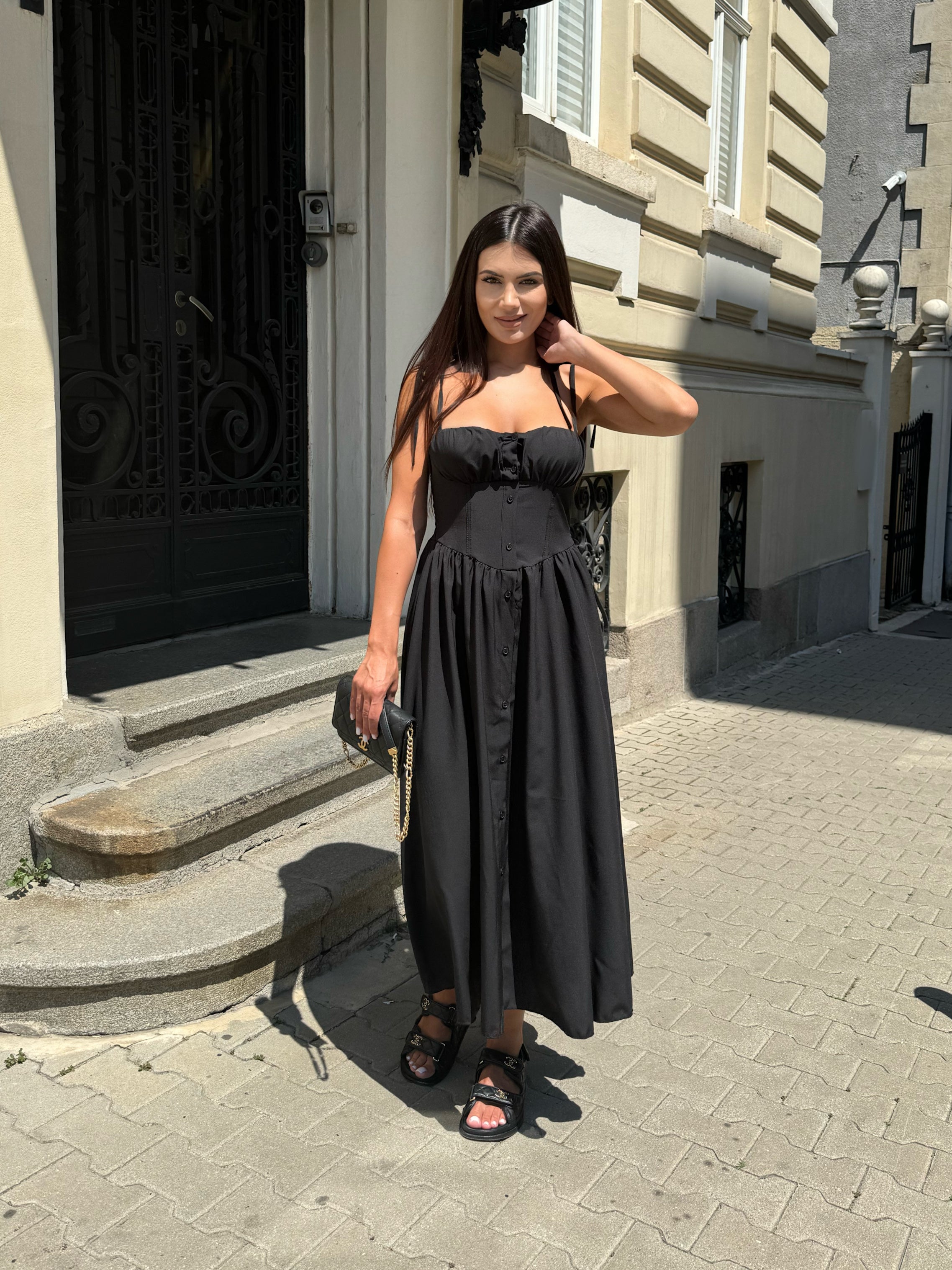 Bretelele cu șnururi permit ajustarea în funcție de înălțime, iar linia frontală cu nasturi alungește vizual silueta. Fusta cade fluid și creează o mișcare rafinată la mers.