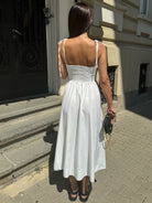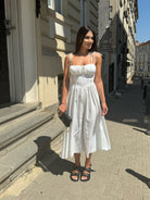 Bretelele cu șnururi permit o ajustare fină, iar linia frontală cu nasturi alungește vizual silueta. Fusta cade ușor și creează o mișcare naturală.