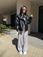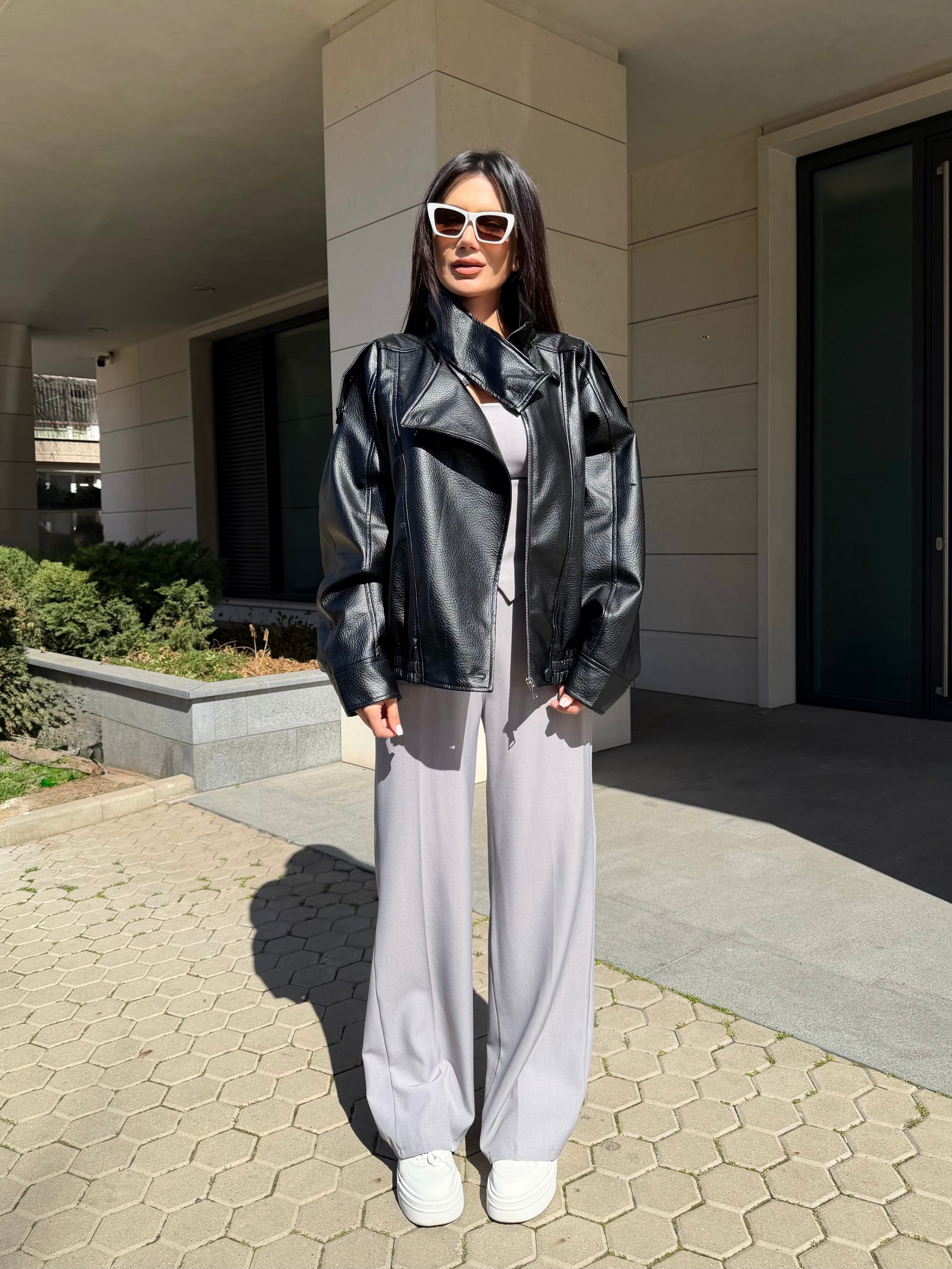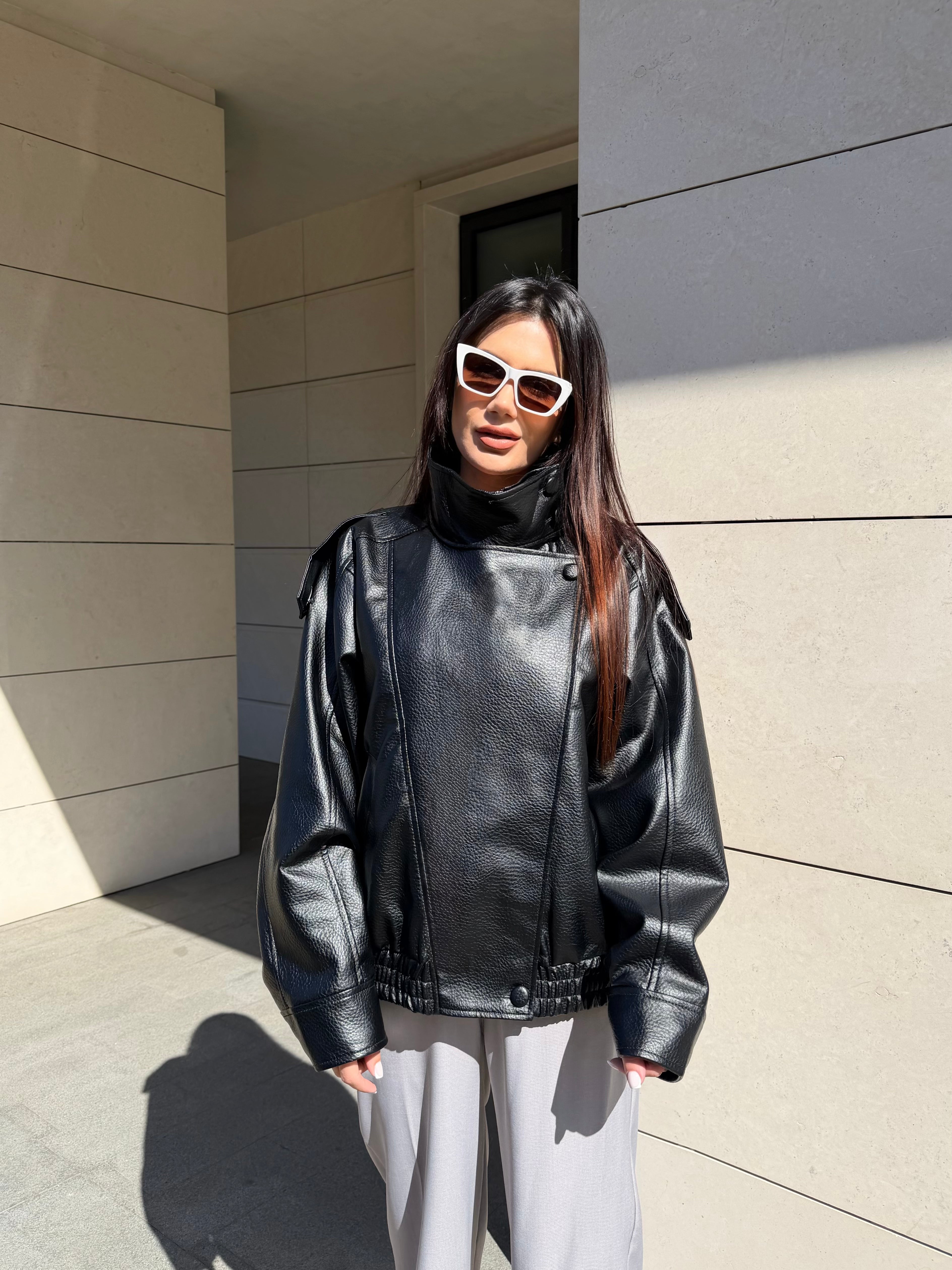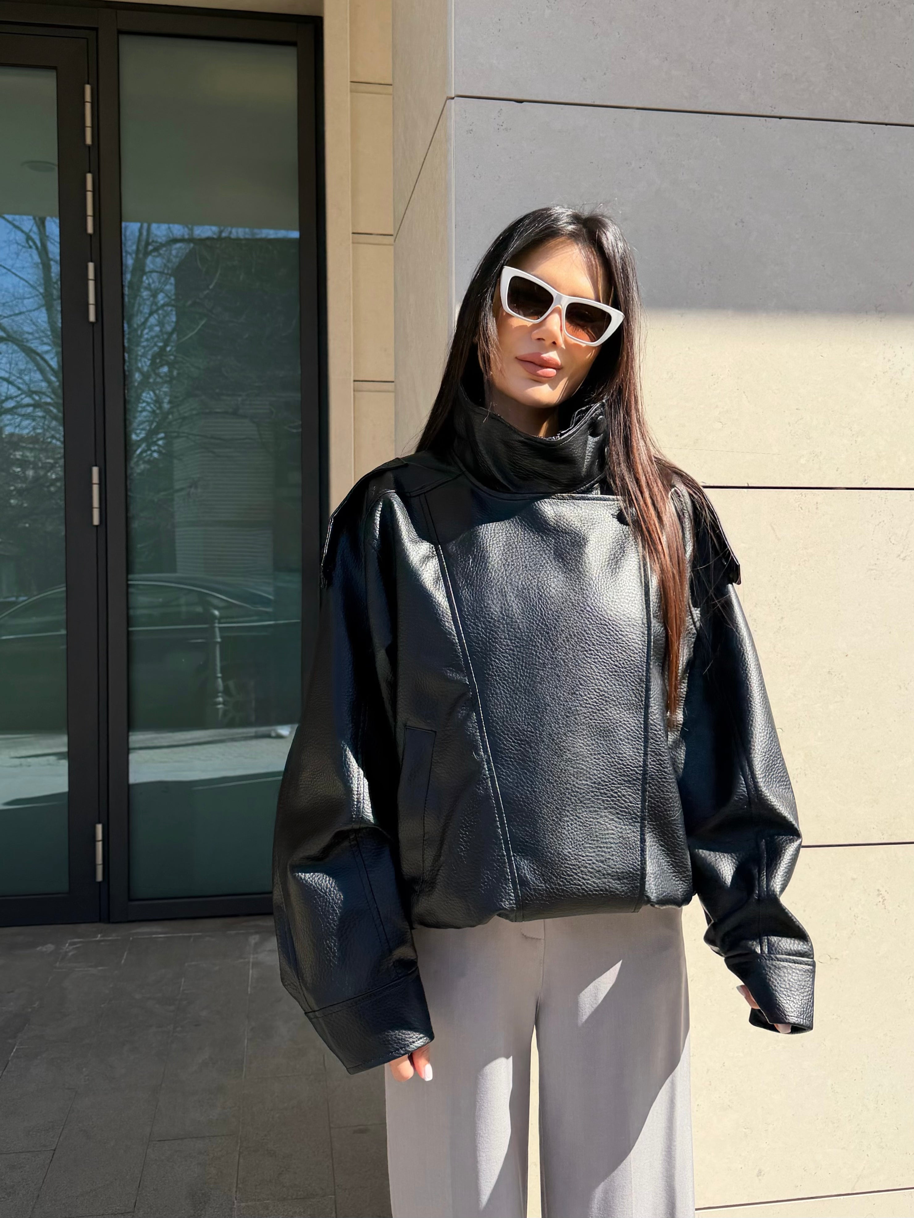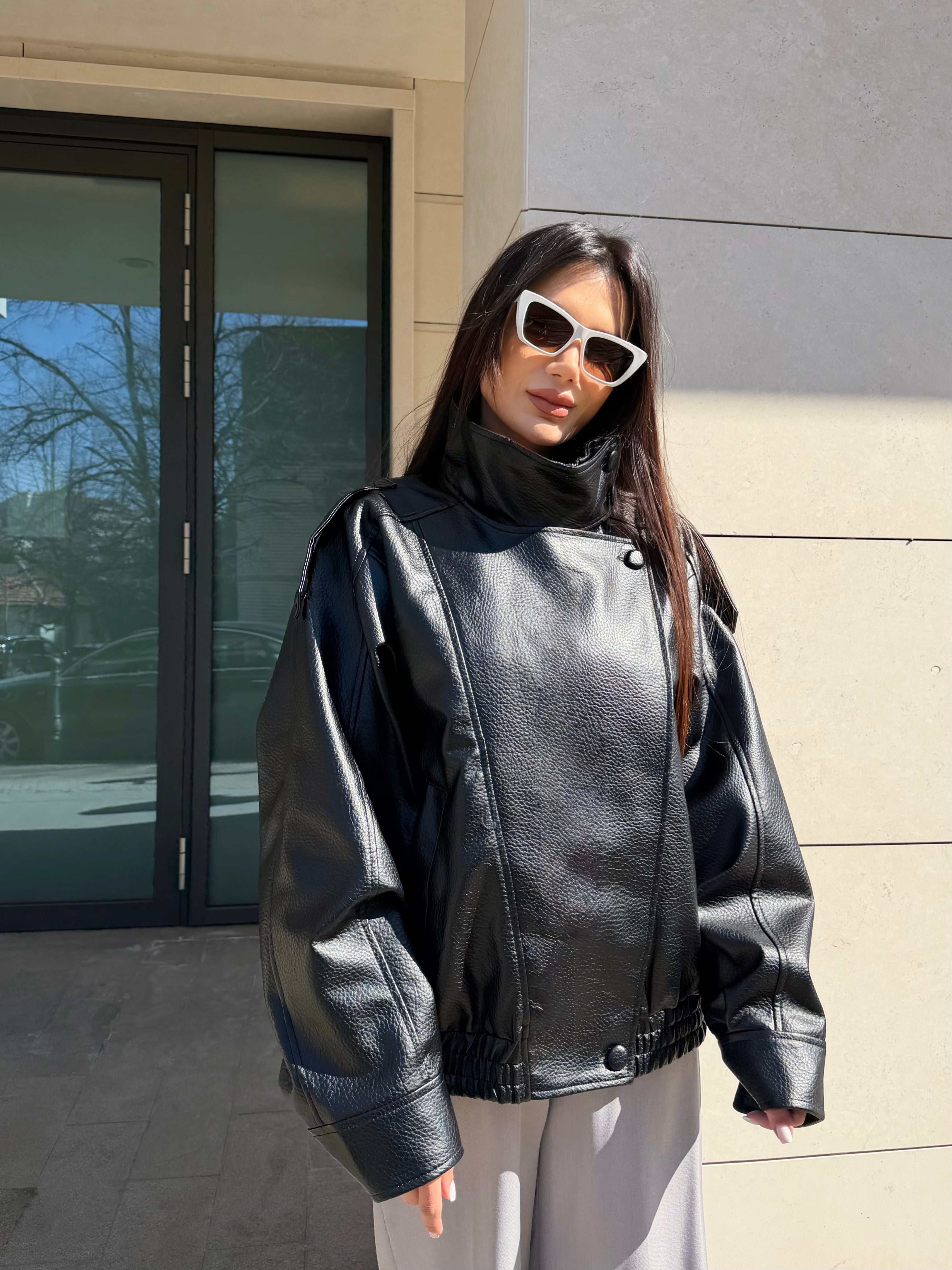 Geacă modernă de damă din piele, cu croială oversize și guler înalt, pentru un look puternic și stilat. Pielea ecologică moale și silueta voluminoasă conferă un aspect luxos și confort la purtare.