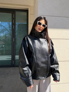 Geacă de piele neagră, supradimensionată