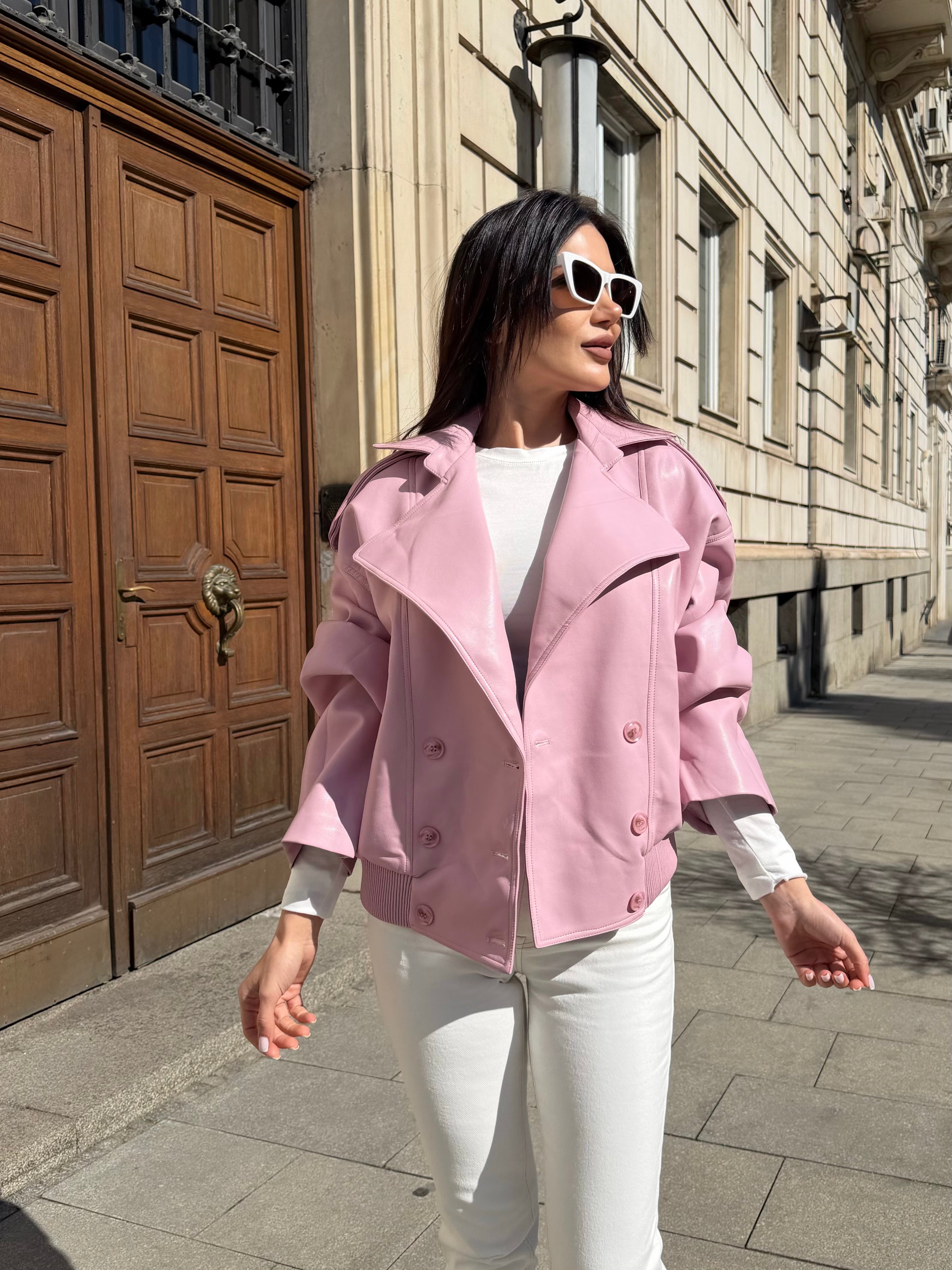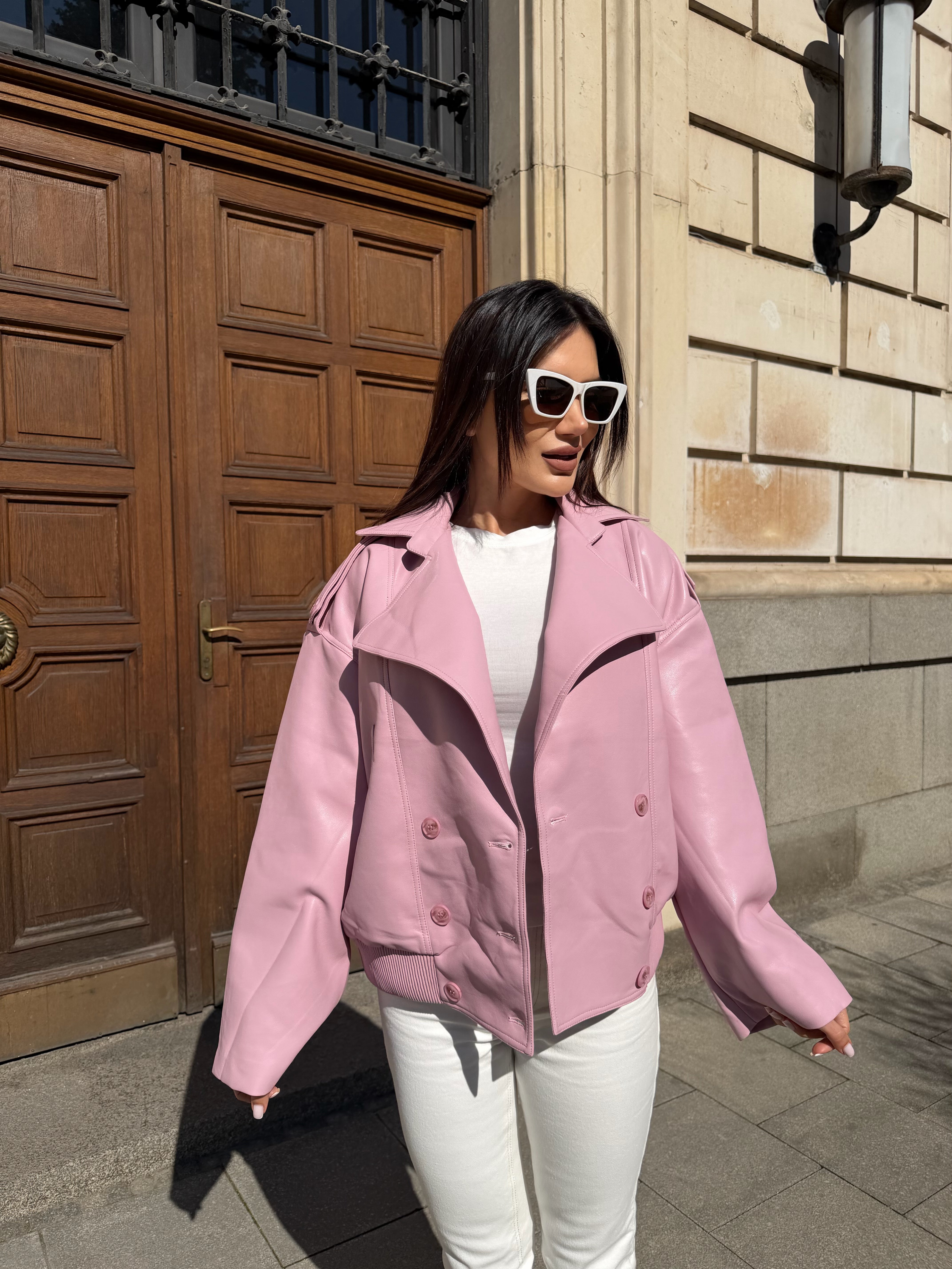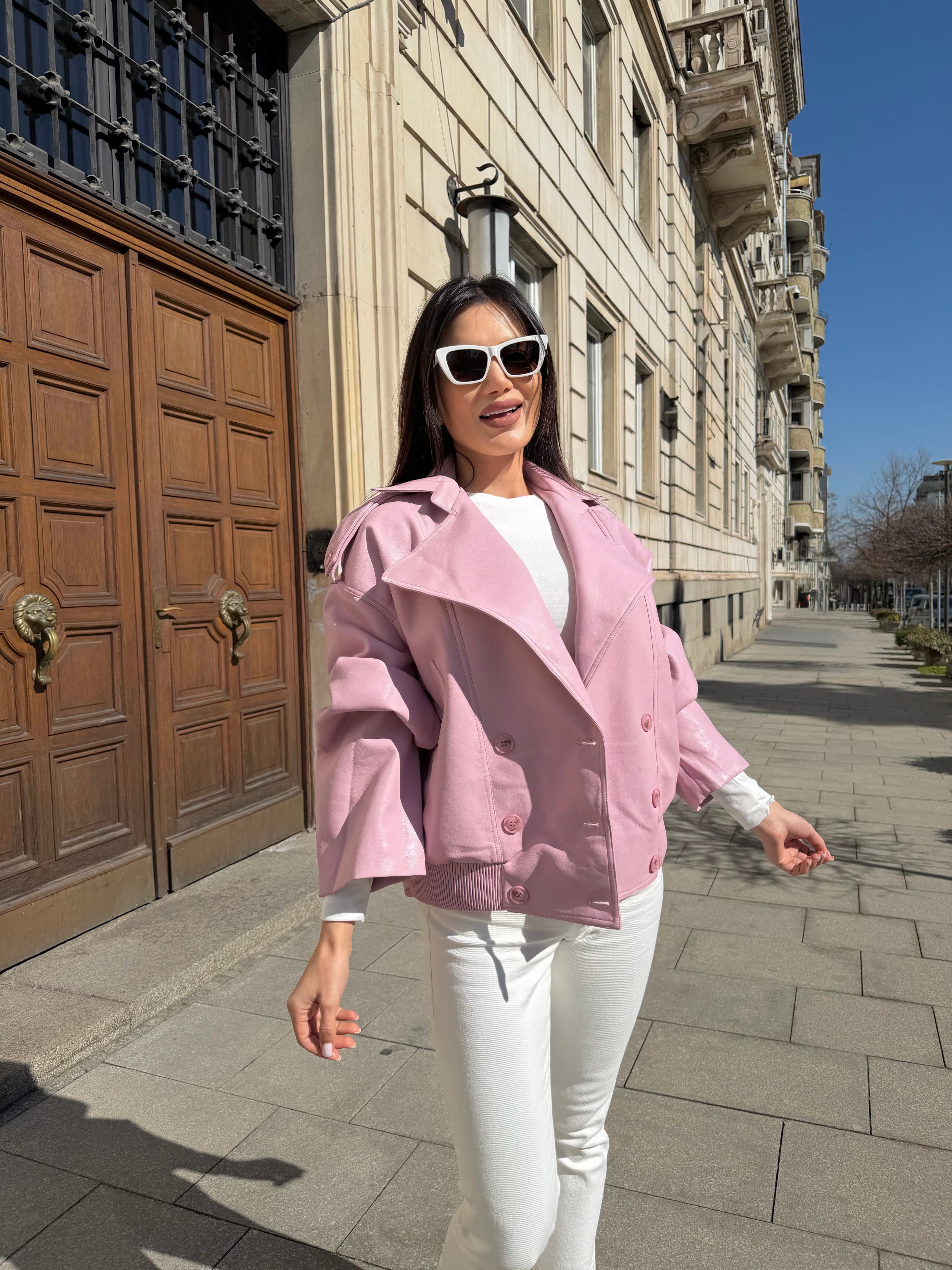 Jachetă scurtă din piele ecologică, cu o parte frontală spectaculoasă cu închidere dublă și o siluetă lejeră. Modelul are mâneci largi și elastic în partea de jos, care conturează talia și oferă o linie modernă, echilibrată.
