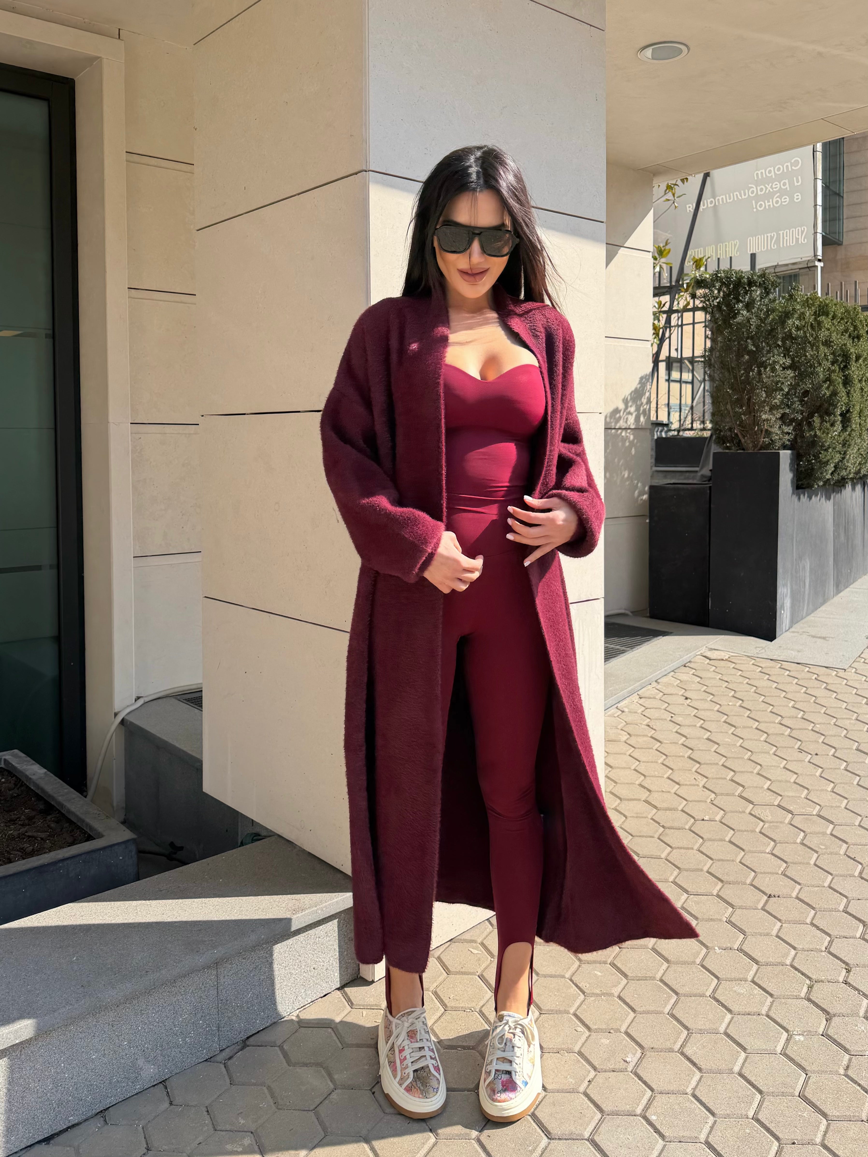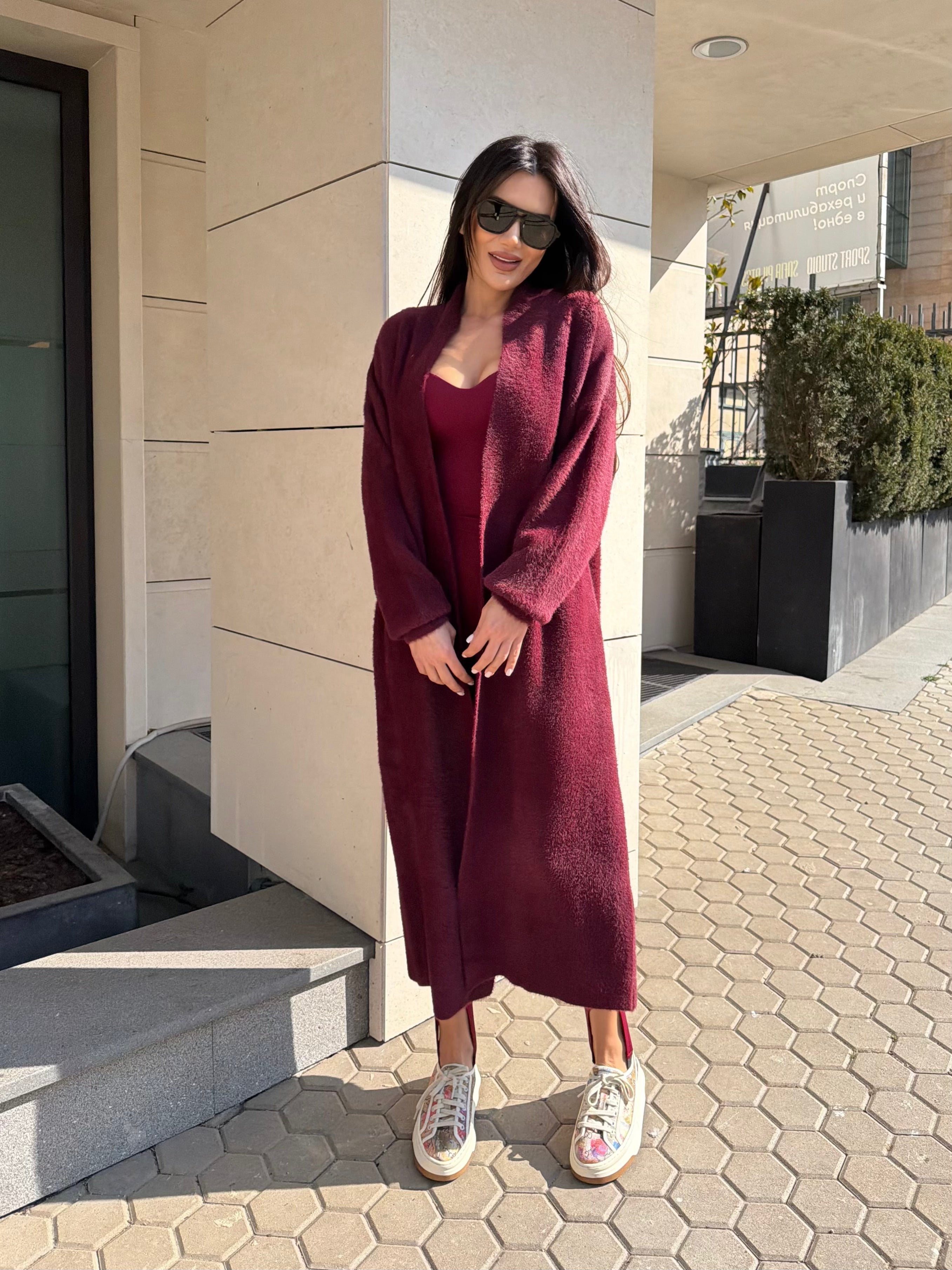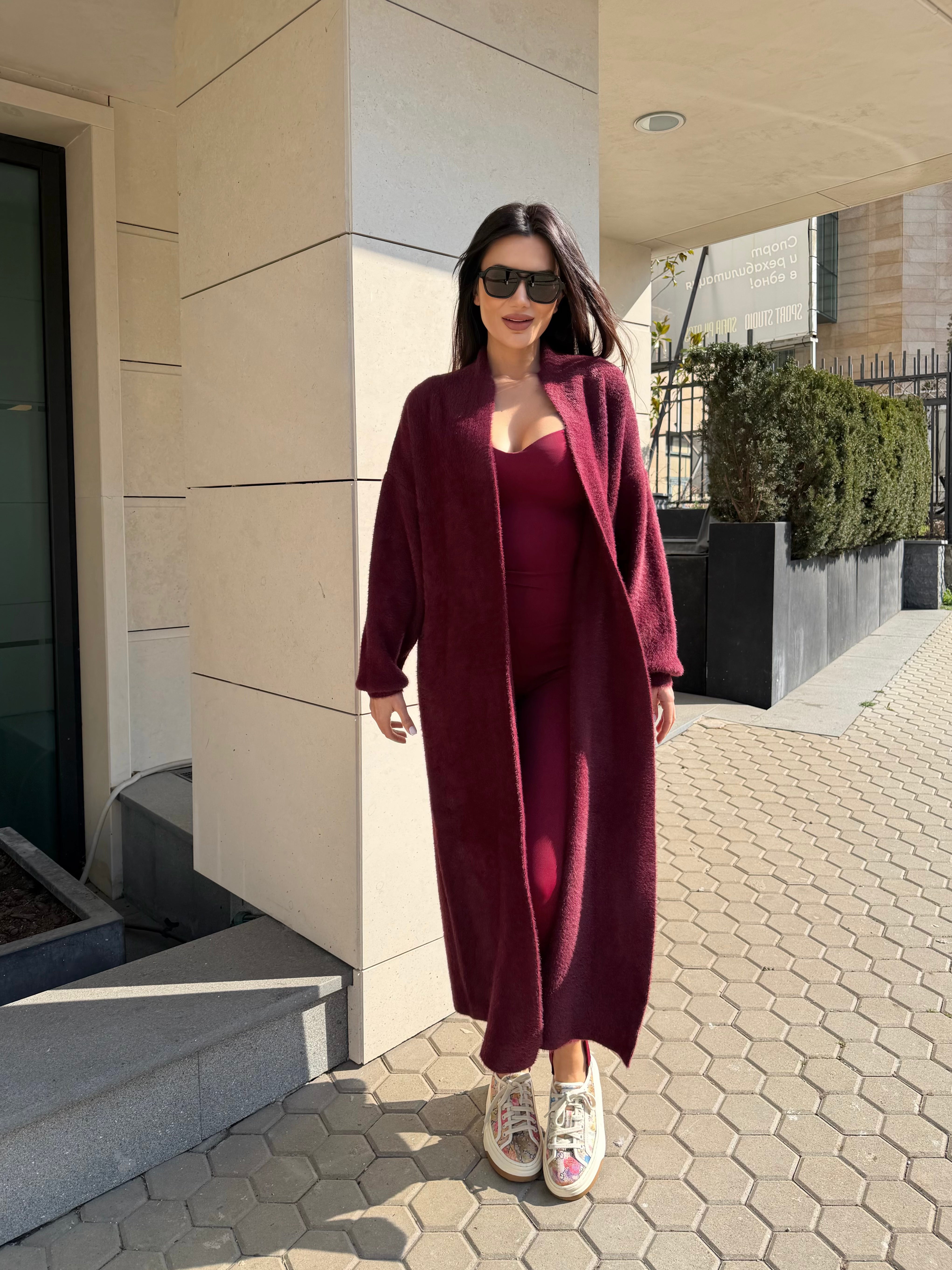 Vestă lungă într-o nuanță rafinată de bordo (Burgundy Red). O culoare versatilă, care se asortează ușor cu toate tonurile din garderobă și este potrivită pentru toate sezoanele.