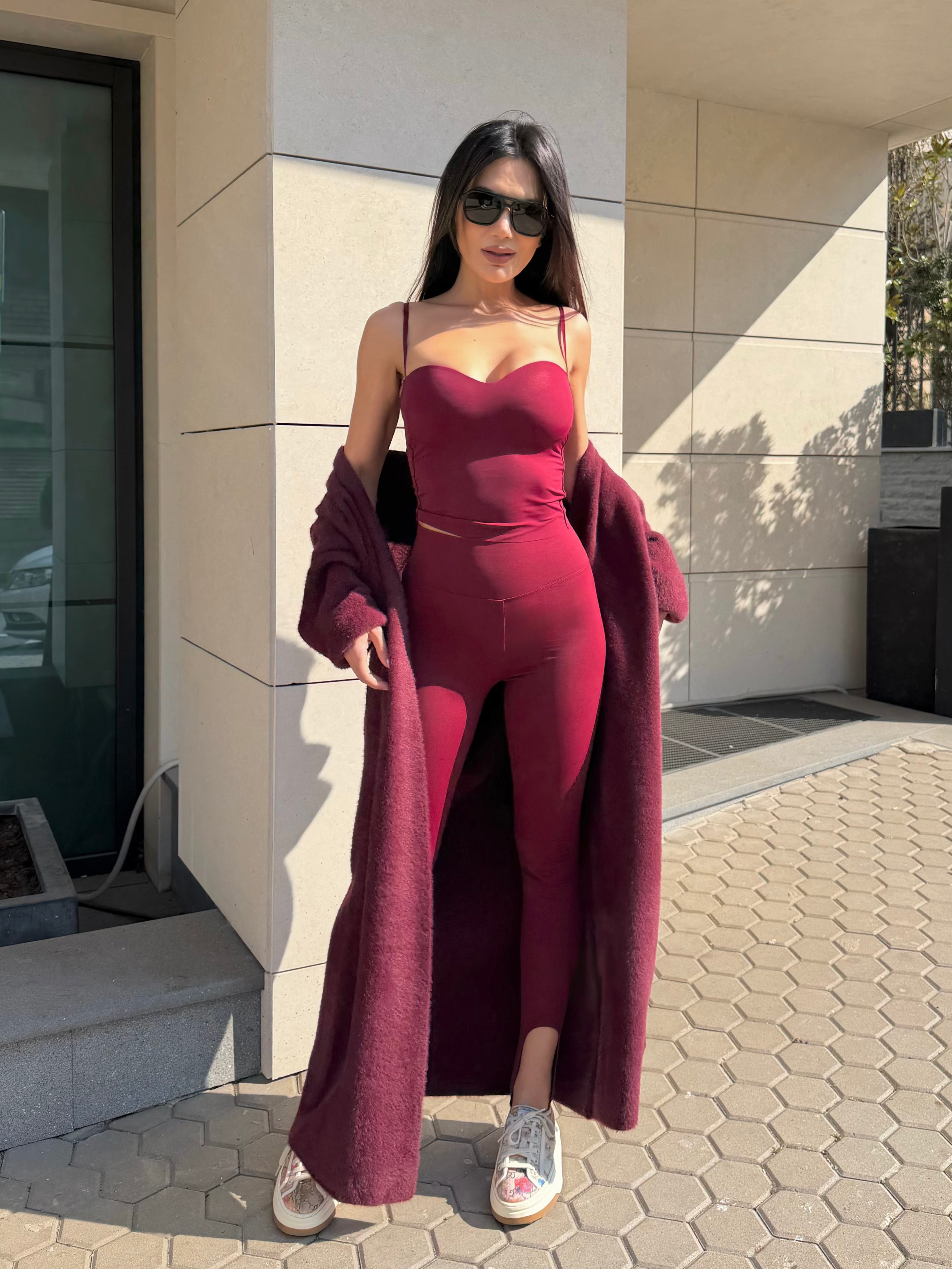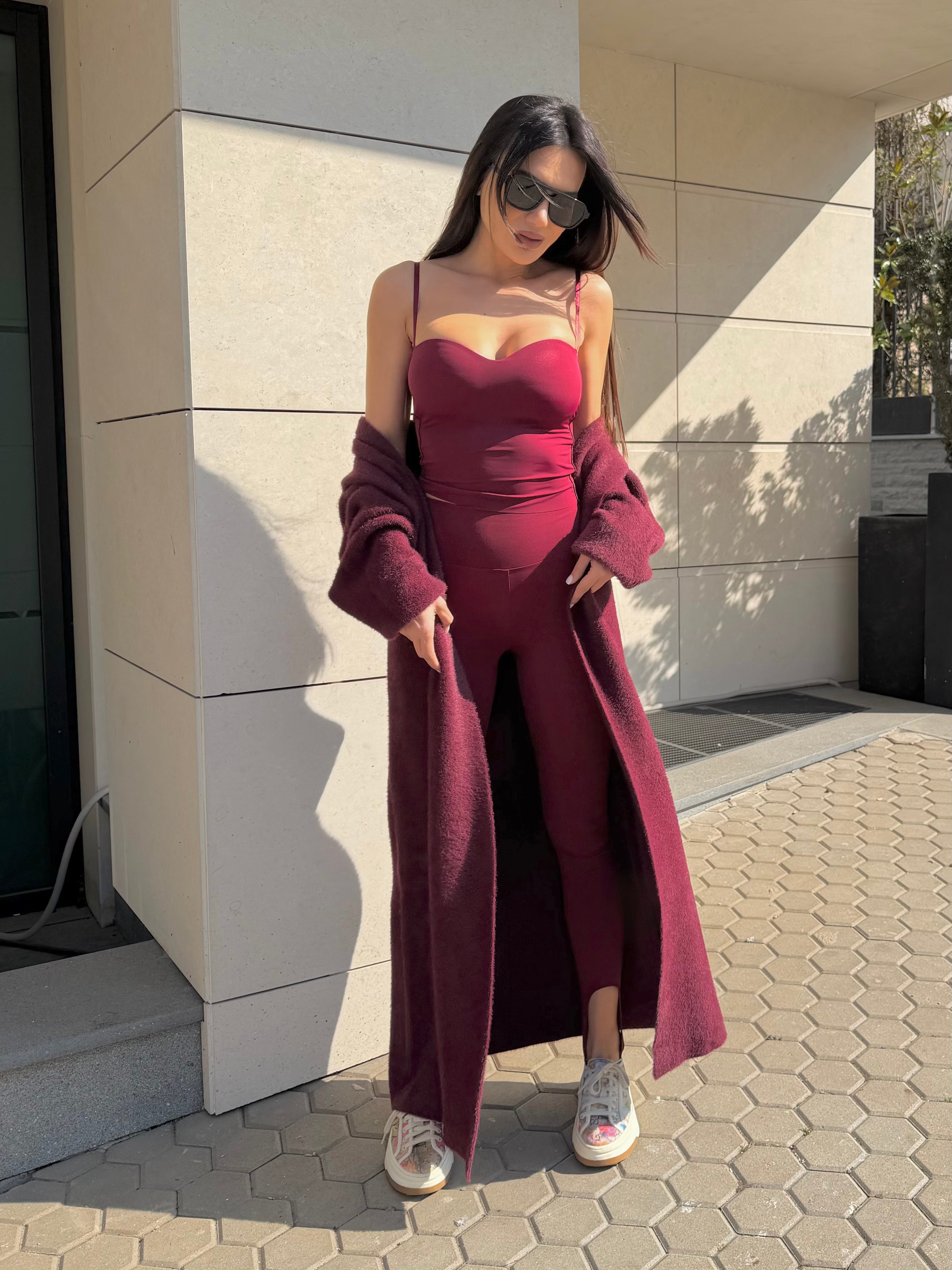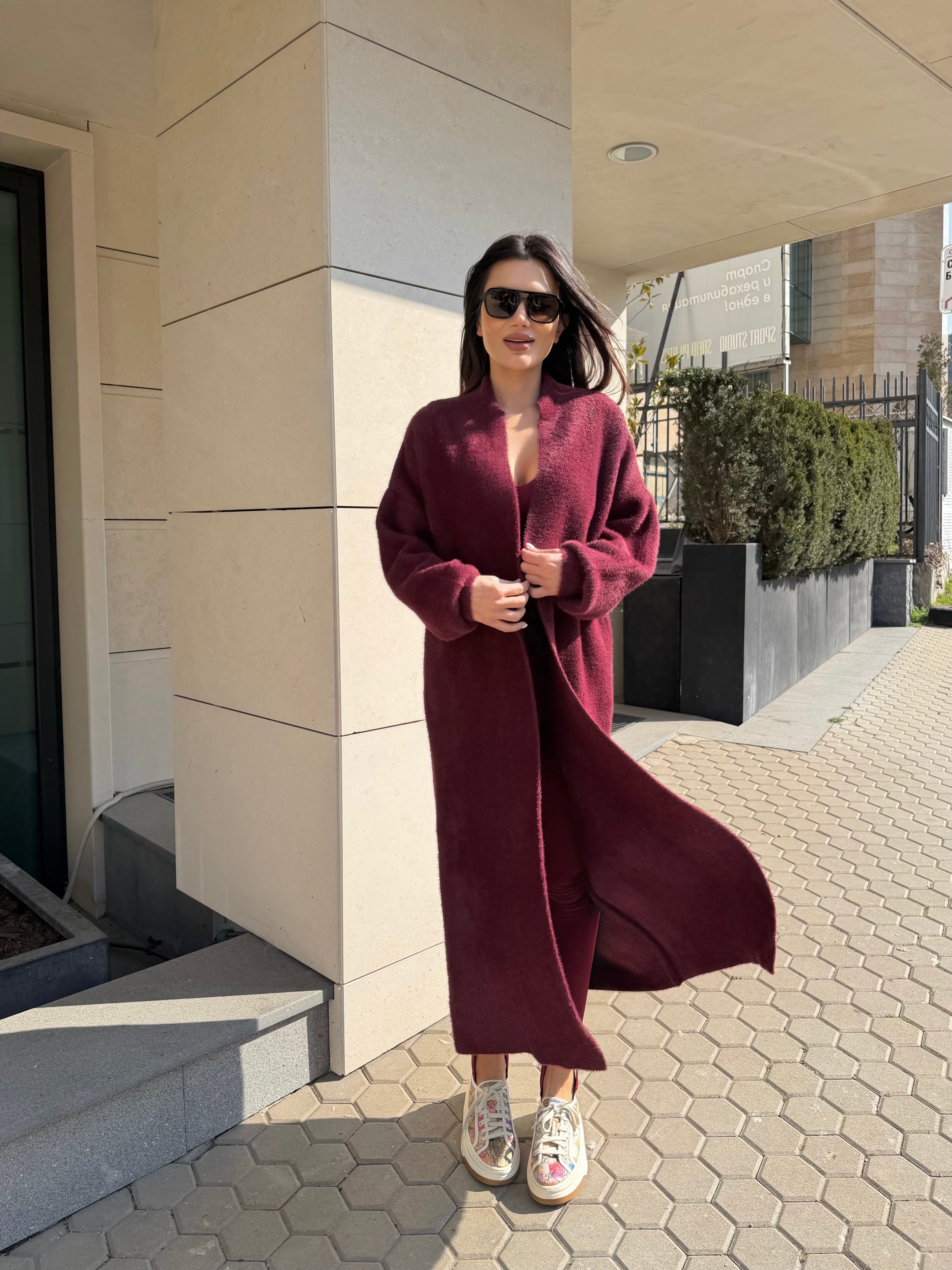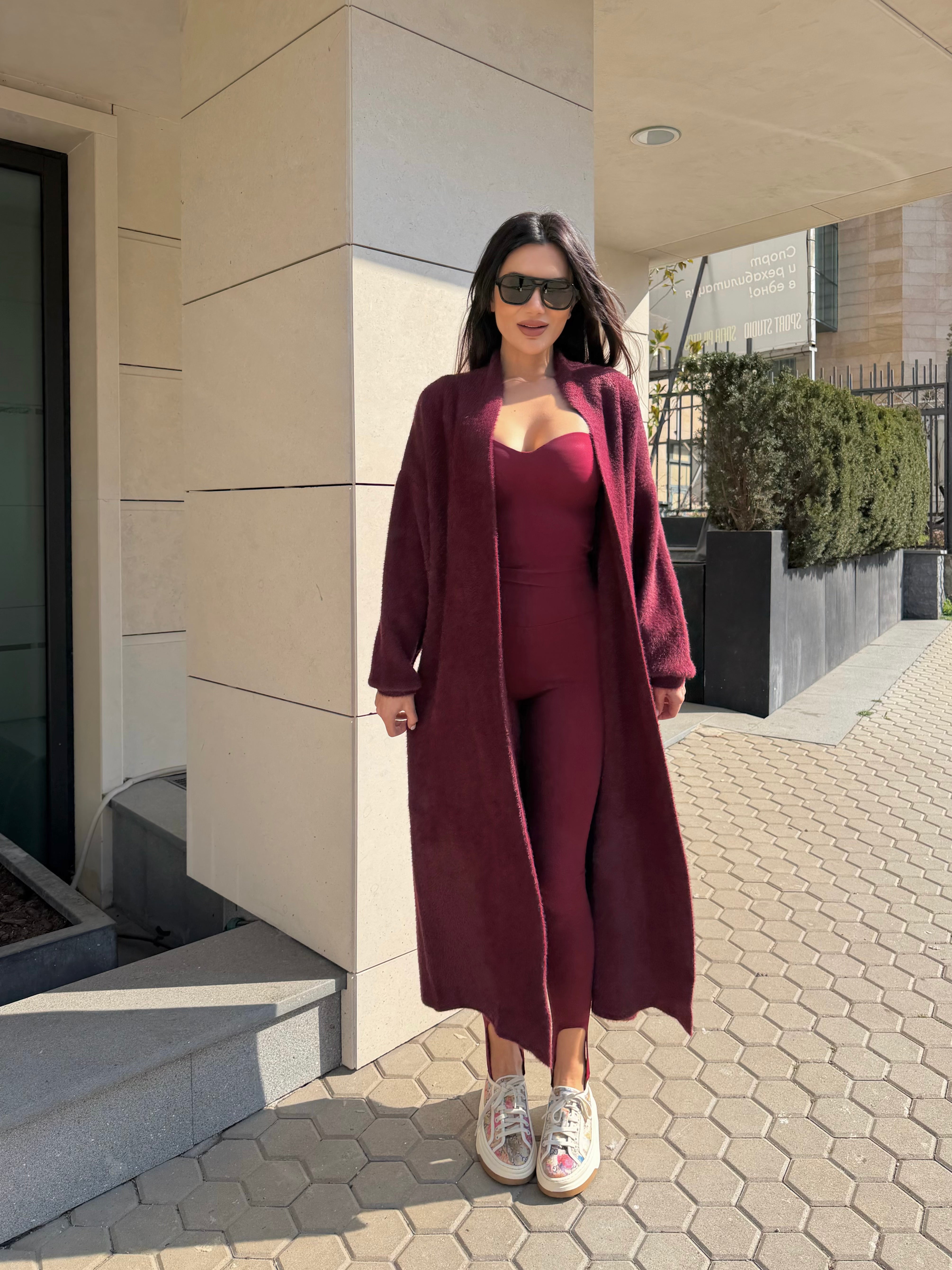 Vestă lungă într-o nuanță rafinată de bordo (Burgundy Red). O culoare versatilă, care se asortează ușor cu toate tonurile din garderobă și este potrivită pentru toate sezoanele.