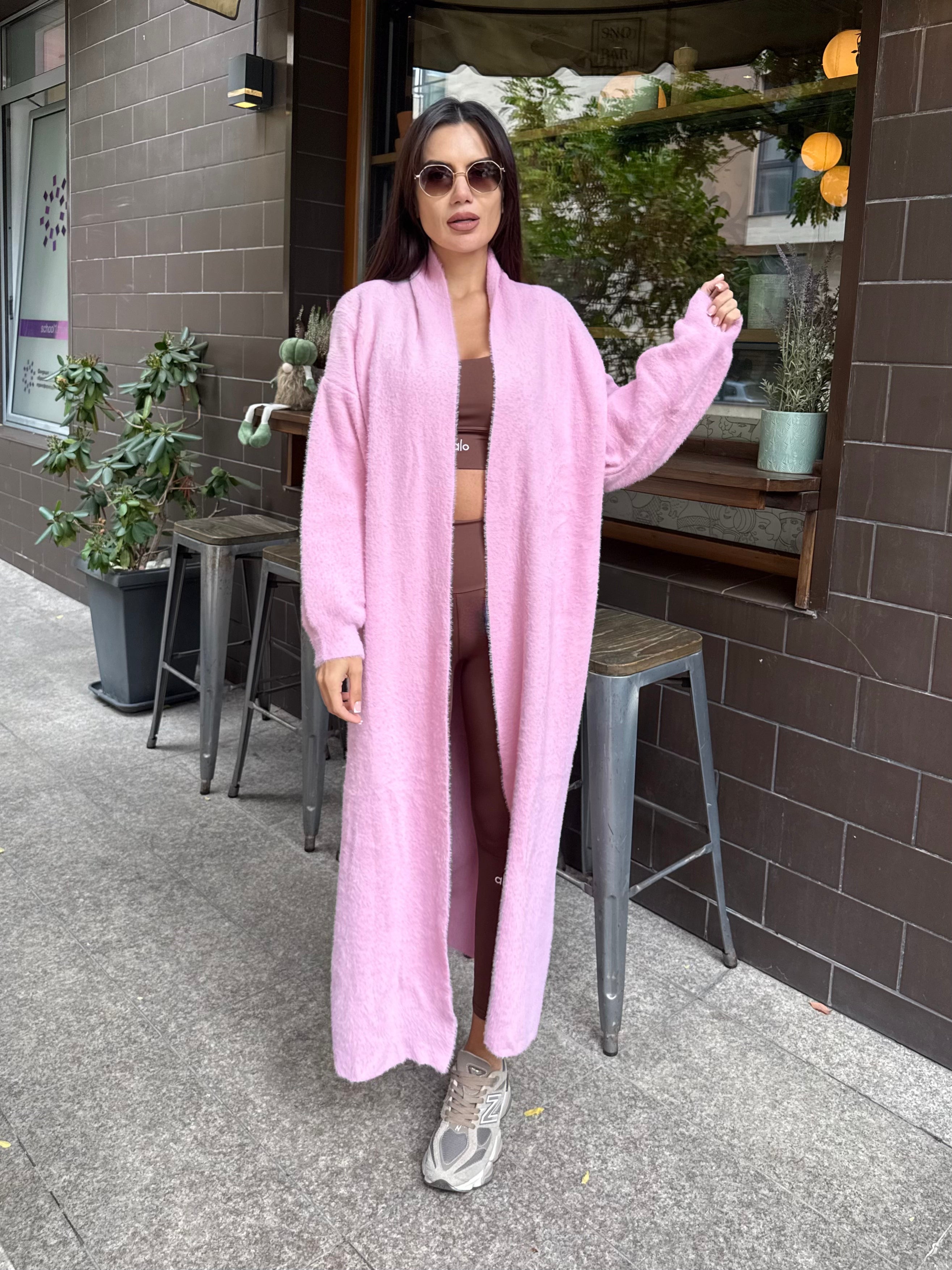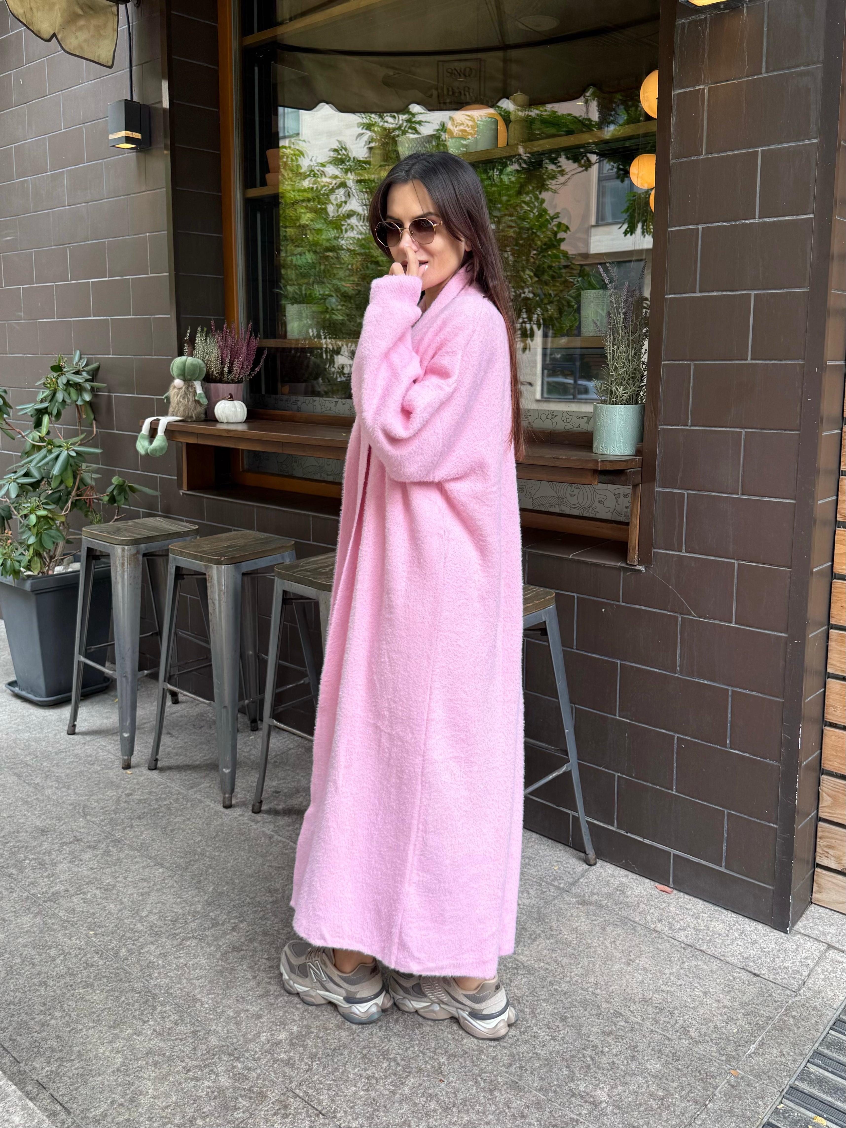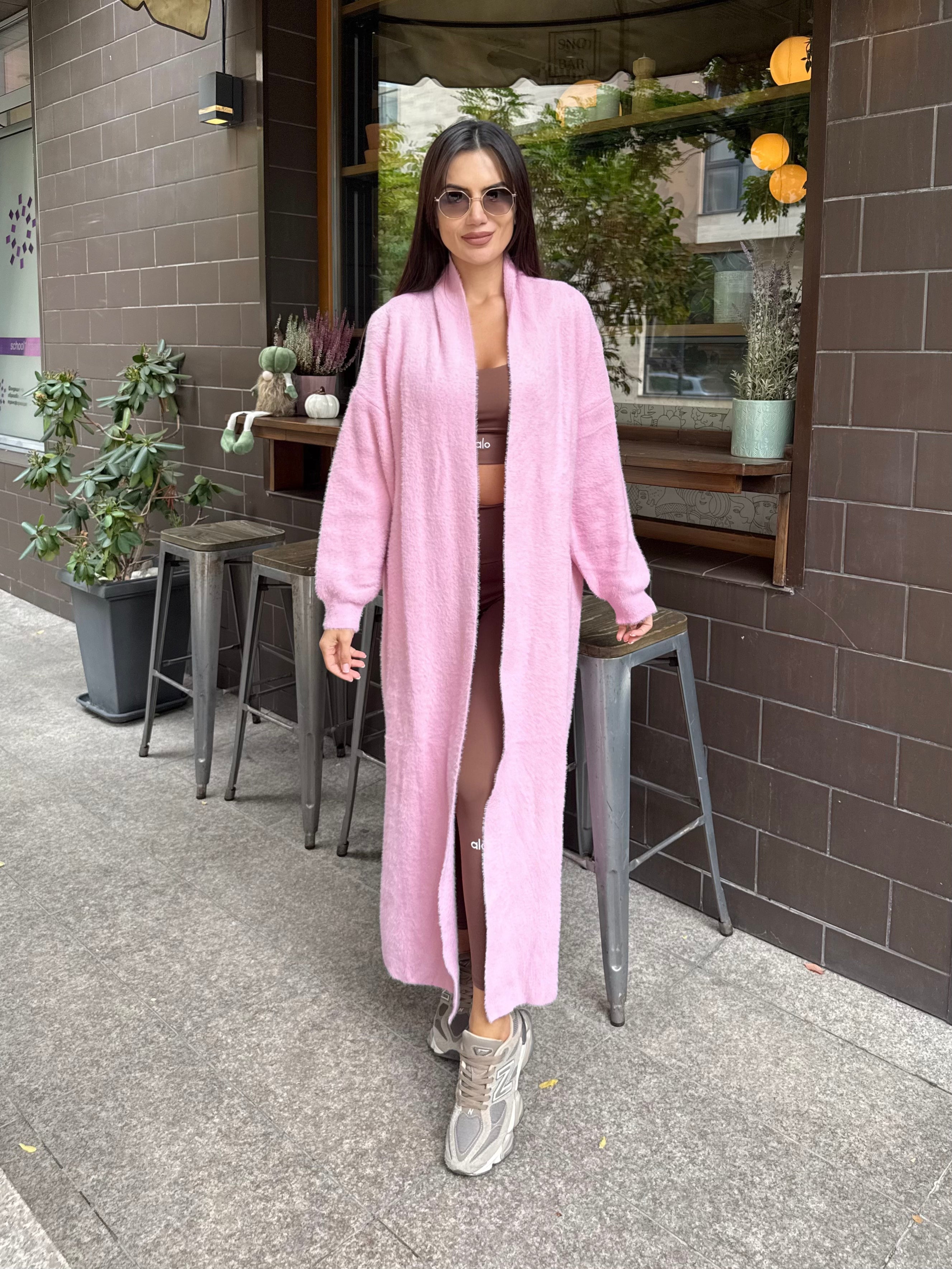 Cardigan lung roz pal, care aduce feminitate și delicatețe. Un accent ideal pentru o ținută romantică și modernă.