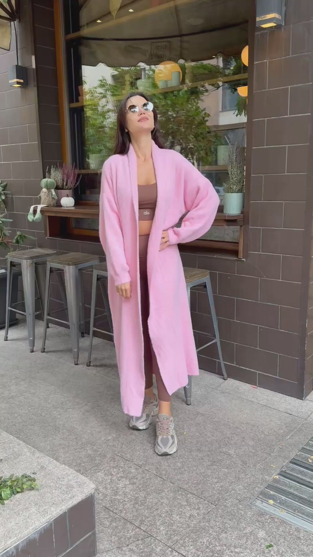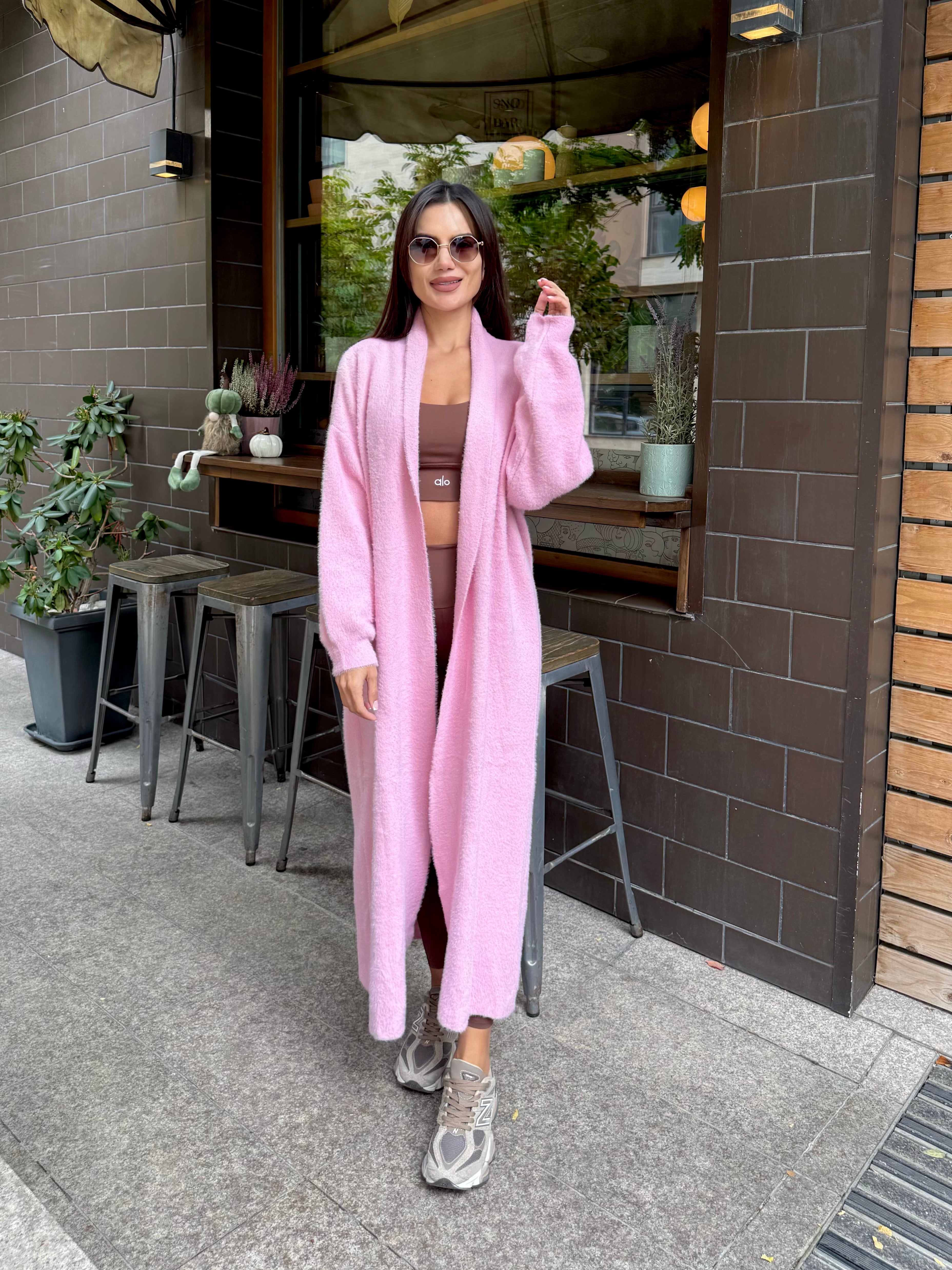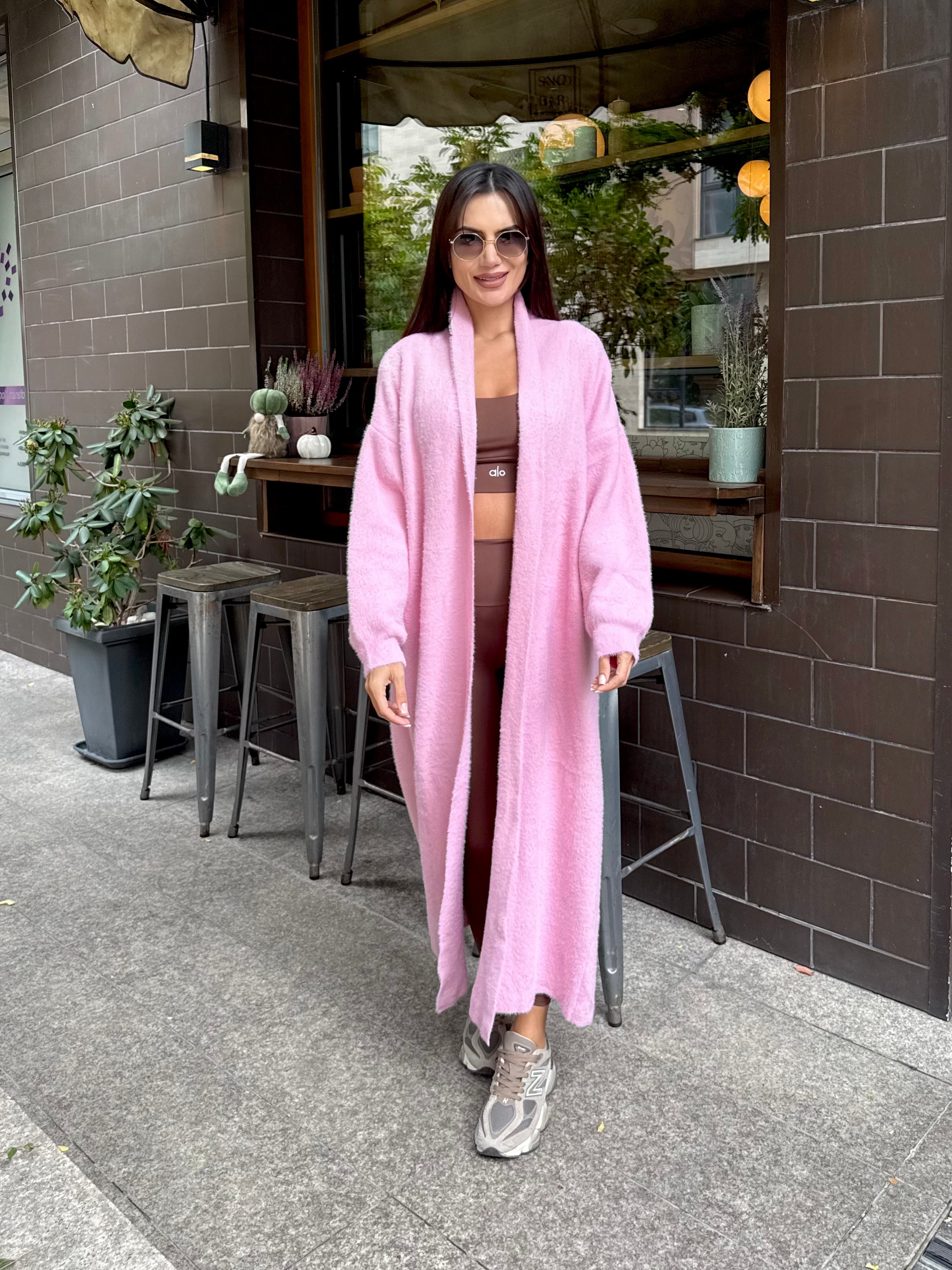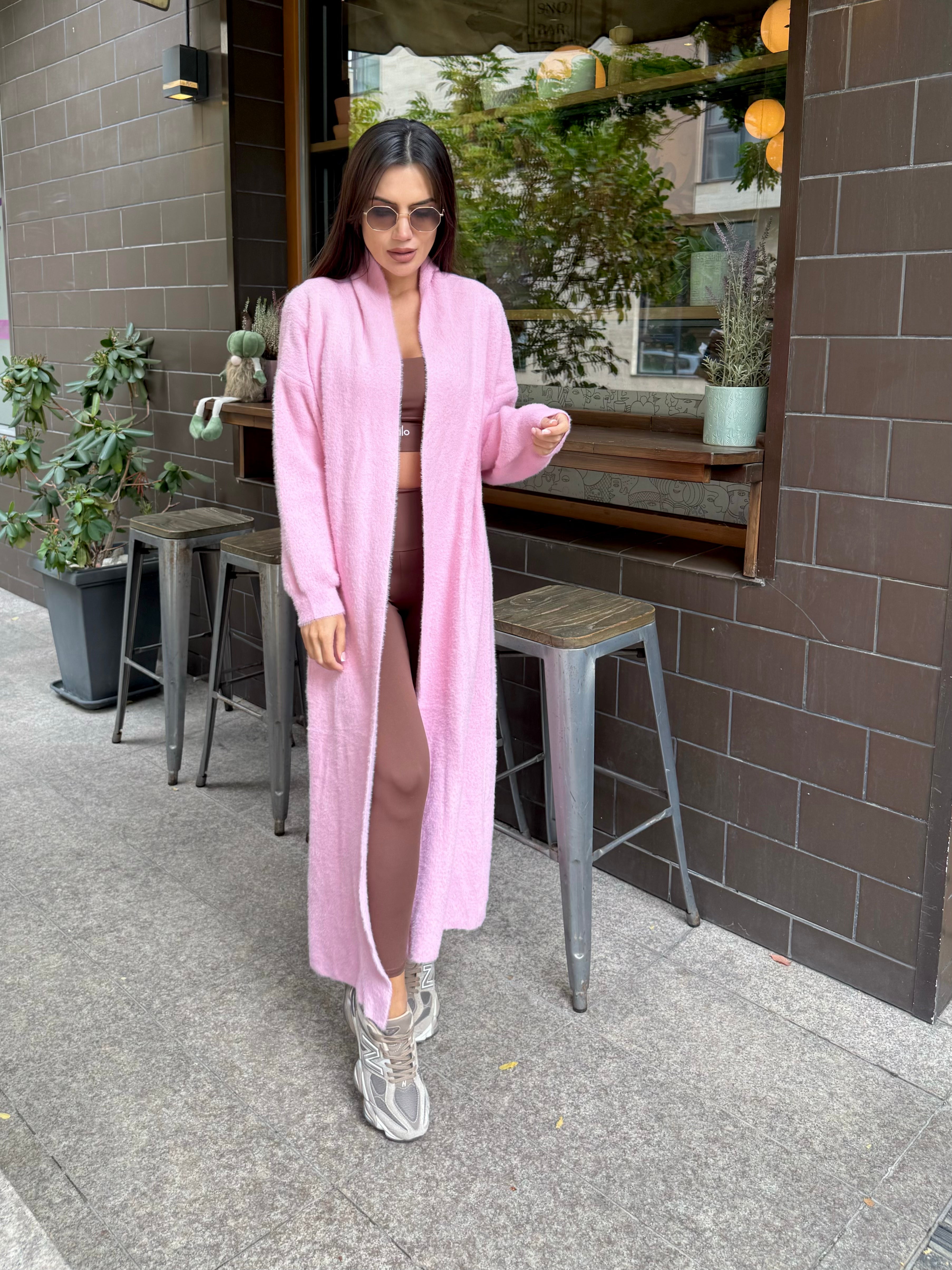 Cardigan lung roz pal, care aduce feminitate și delicatețe. Un accent ideal pentru o ținută romantică și modernă.