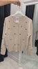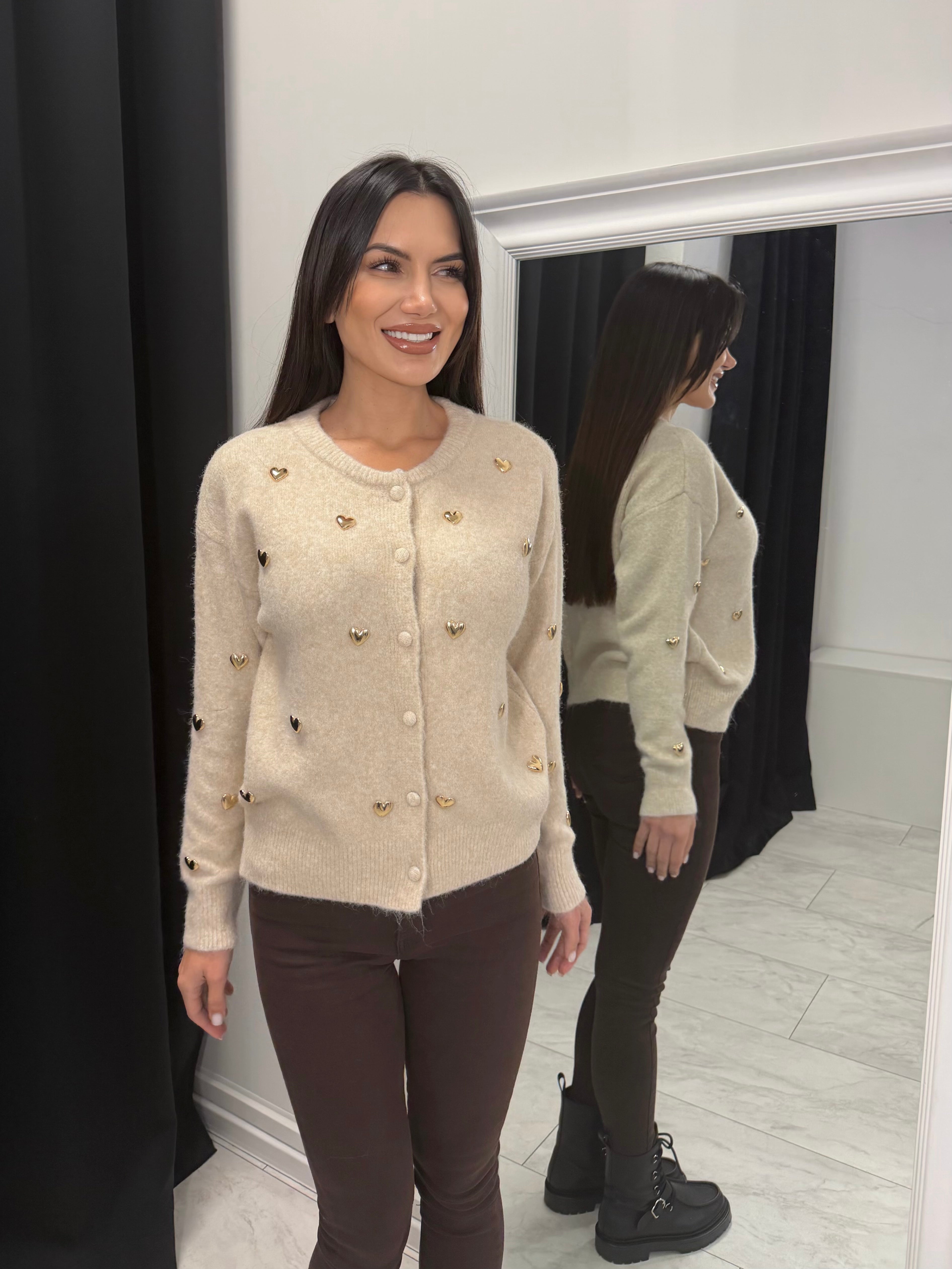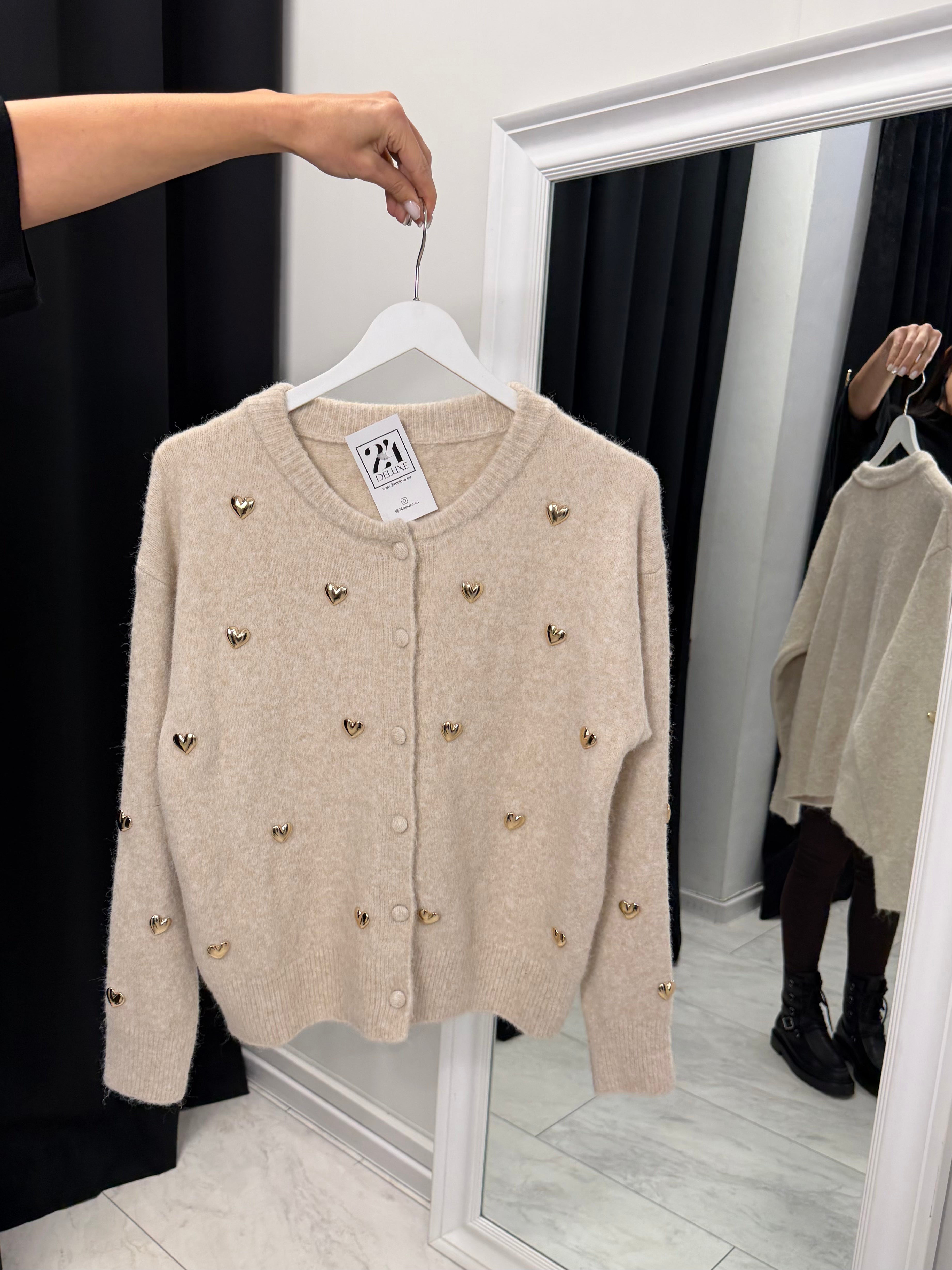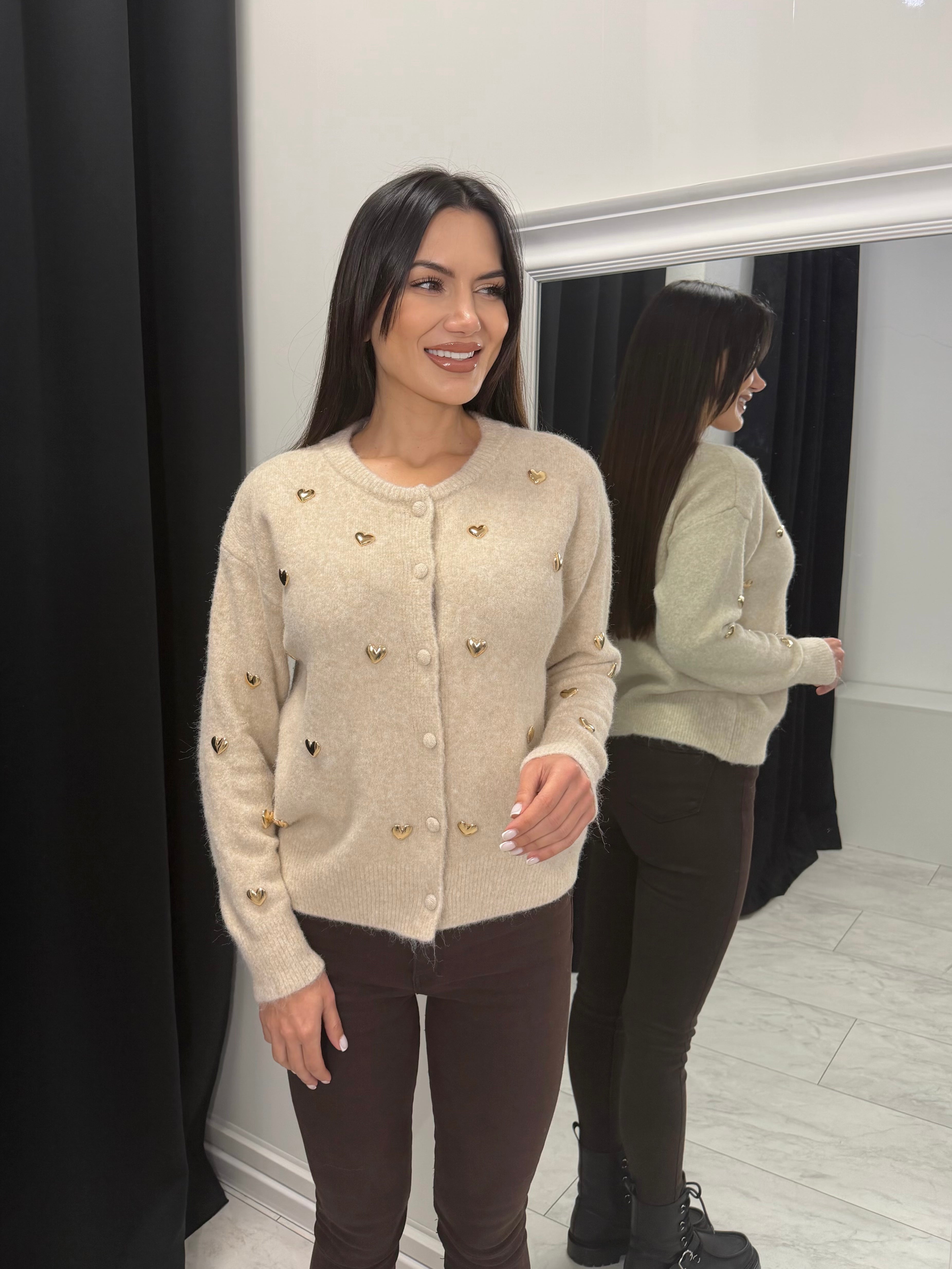 Cardiganul subțire de damă cu inimioare aurii este un accent elegant și feminin pentru orice garderobă. Fabricat dintr-un tricot moale și elastic din viscoză, poliamidă și lână, asigură confort și o senzație plăcută la purtare. Inimioarele decorative aurii conferă un efect delicat de lux, iar închiderea clasică cu nasturi îl face ușor de combinat – atât singur, cât și peste un top sau o cămașă.