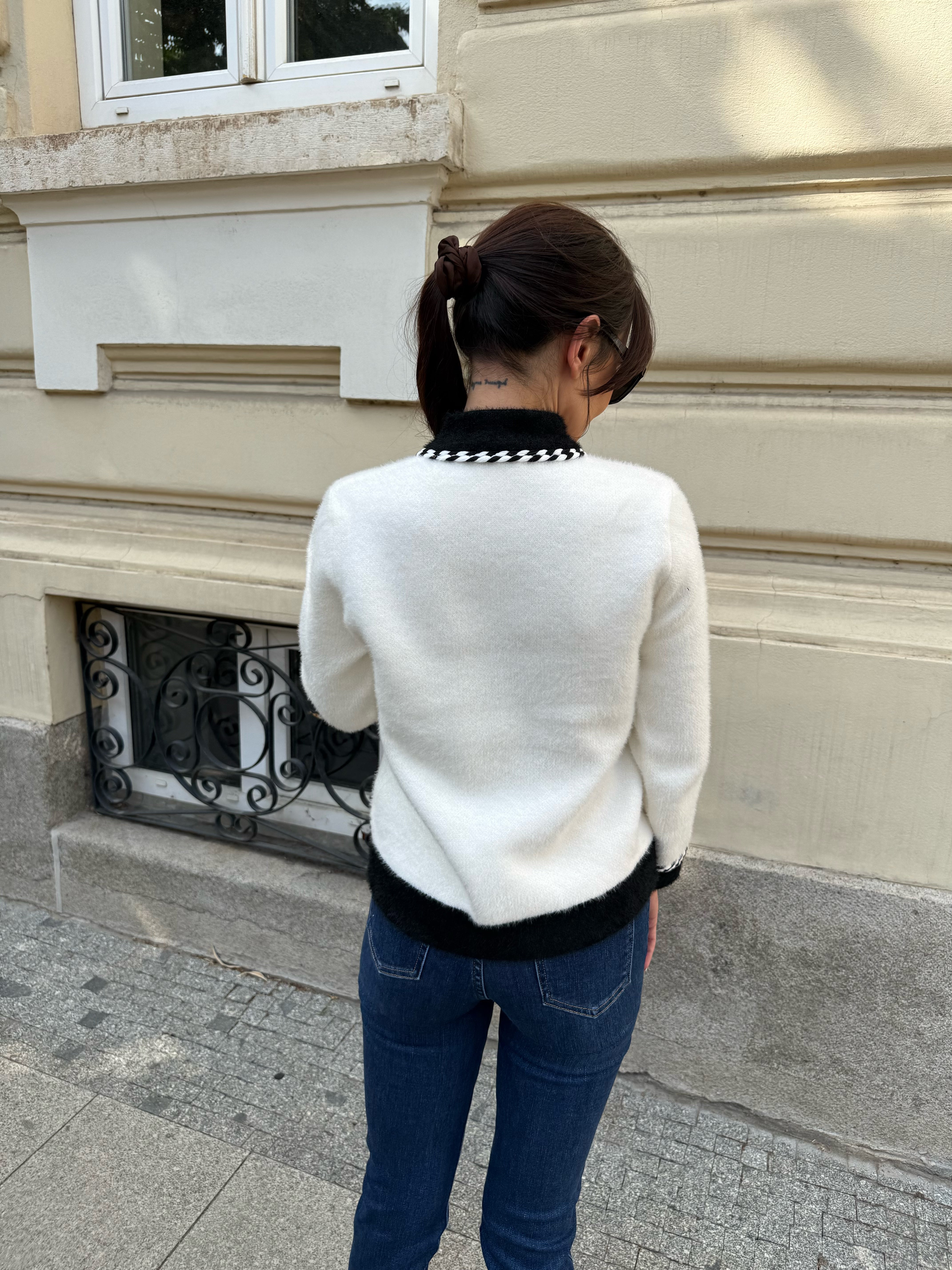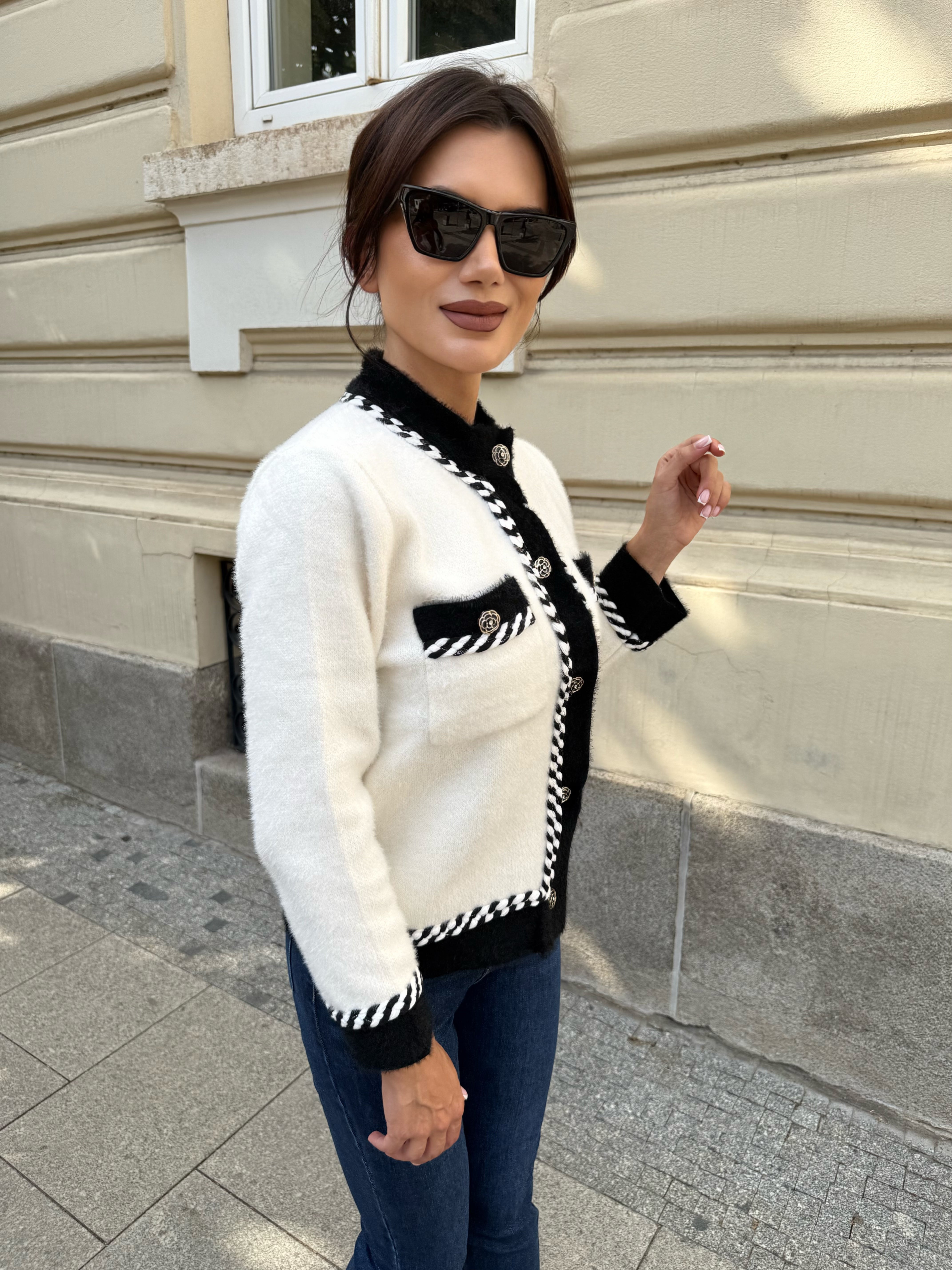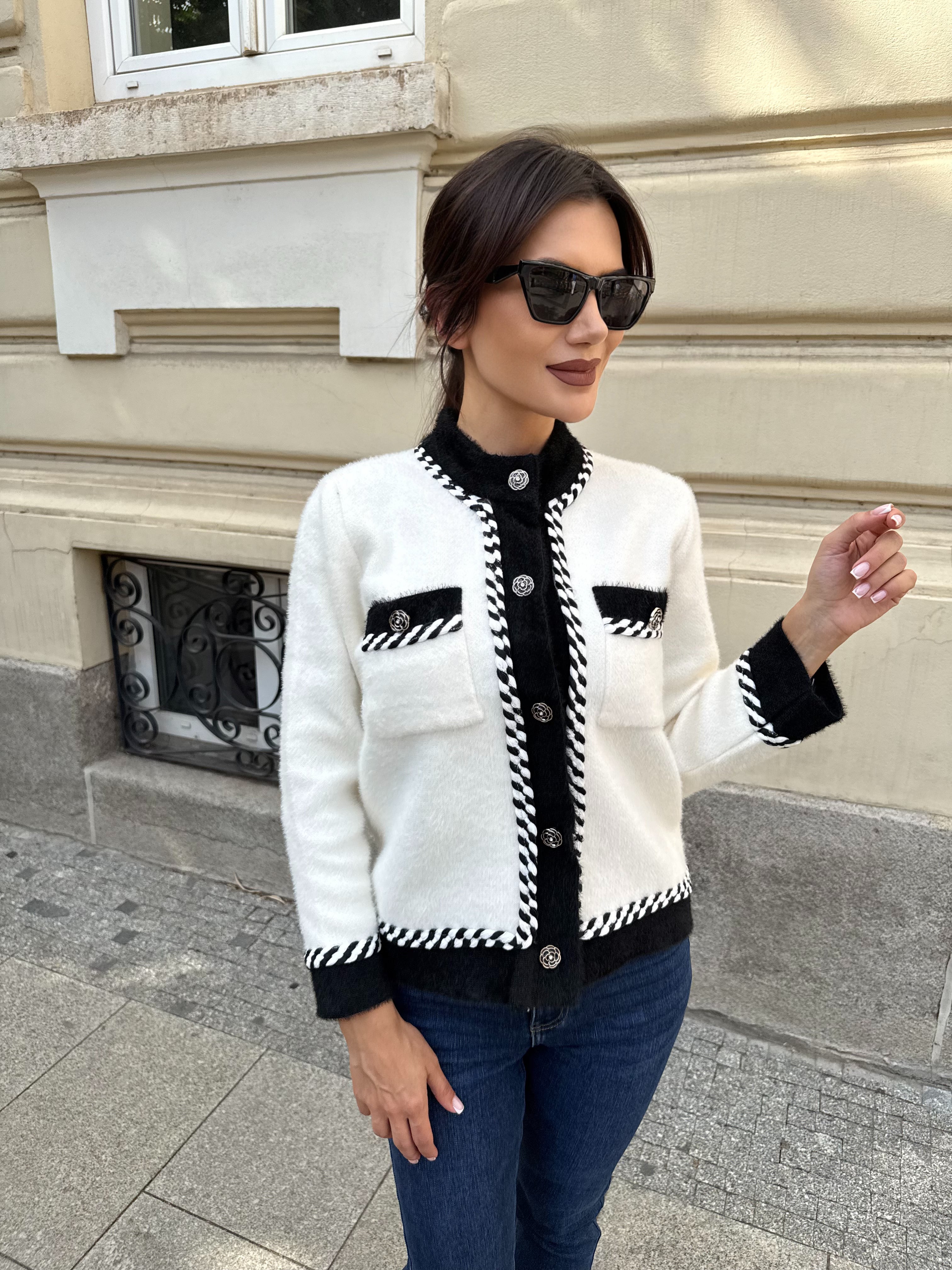 Vesta elegantă în stil coco, confecționată din 100% viscoză. Modelul are o croială dreaptă, borduri decorative în culori contrastante și închidere frontală cu nasturi. Are două buzunare frontale pentru un plus de accent. Este potrivită pentru ținute elegante și de zi cu zi - se combină ușor cu blugi, fuste sau pantaloni.