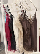 SATIN SWEATER WITH LACE on the neckline in the front and back.