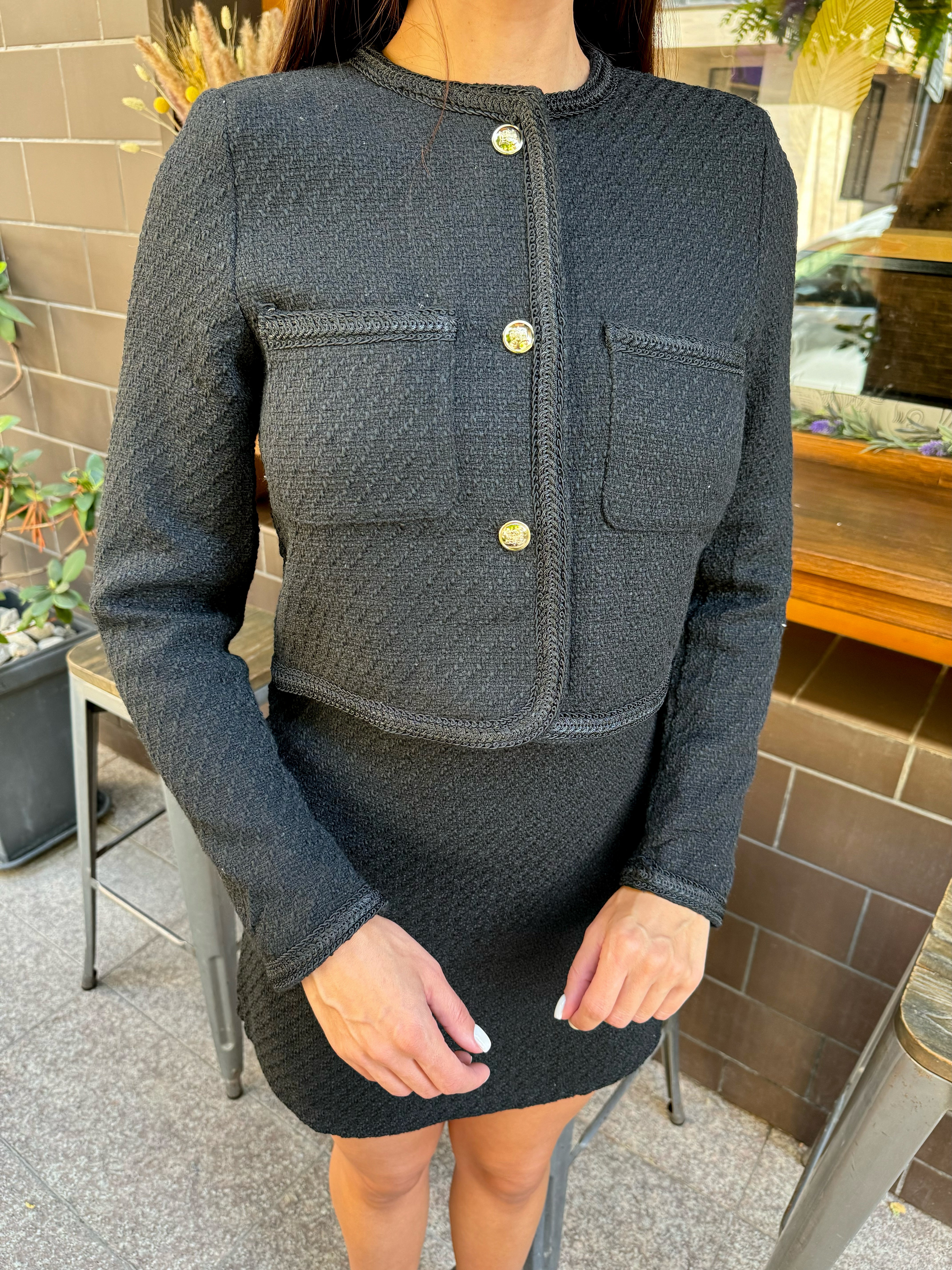 The GRACE two-piece suit features a cropped tailored jacket and a straight above-the-knee skirt.