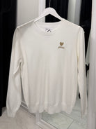 RIBBON BLOUSE with short sleeves and a high collar, round neckline made of fine machine knit with spectacular sewn-in ribbons on the front.