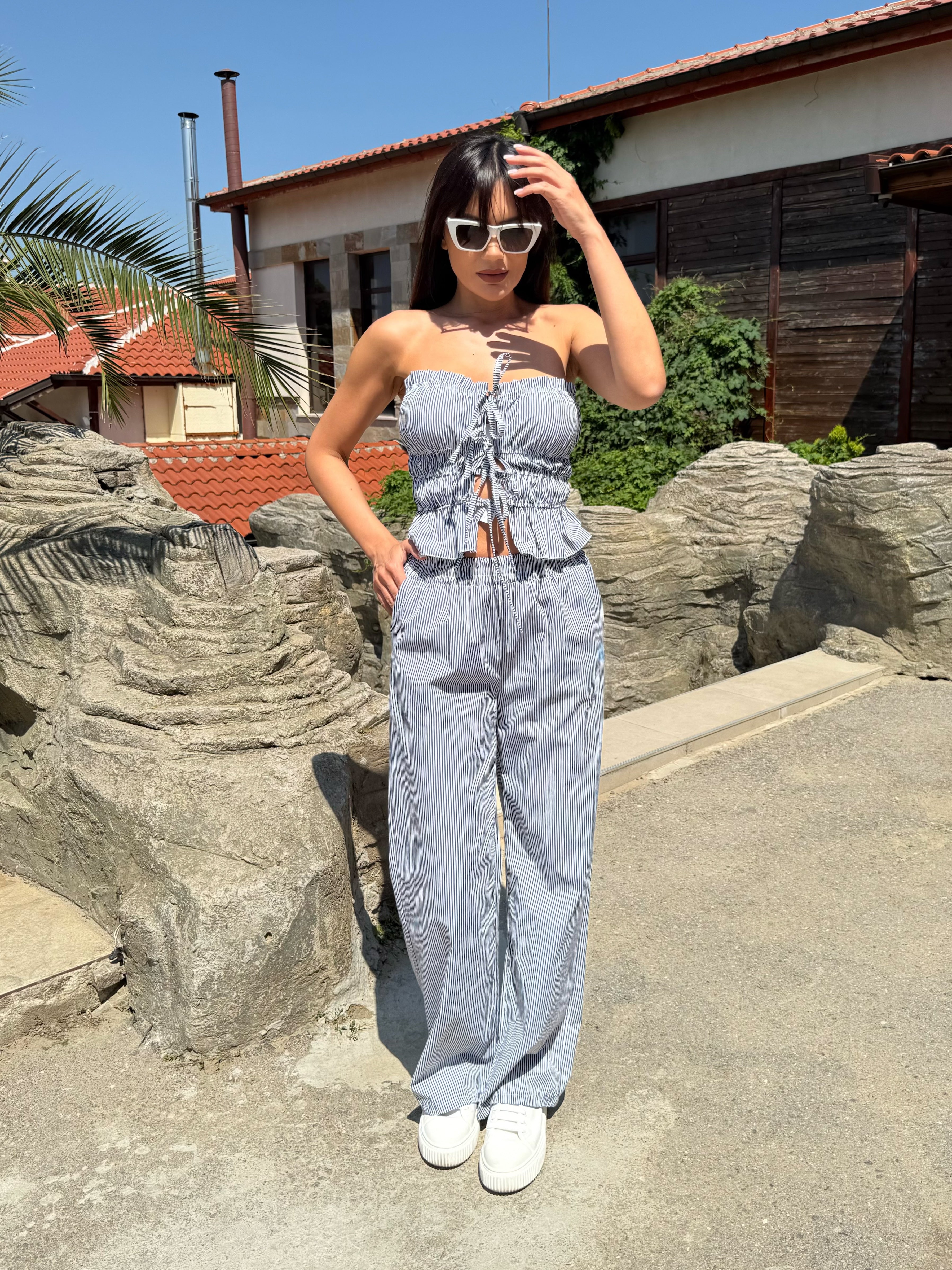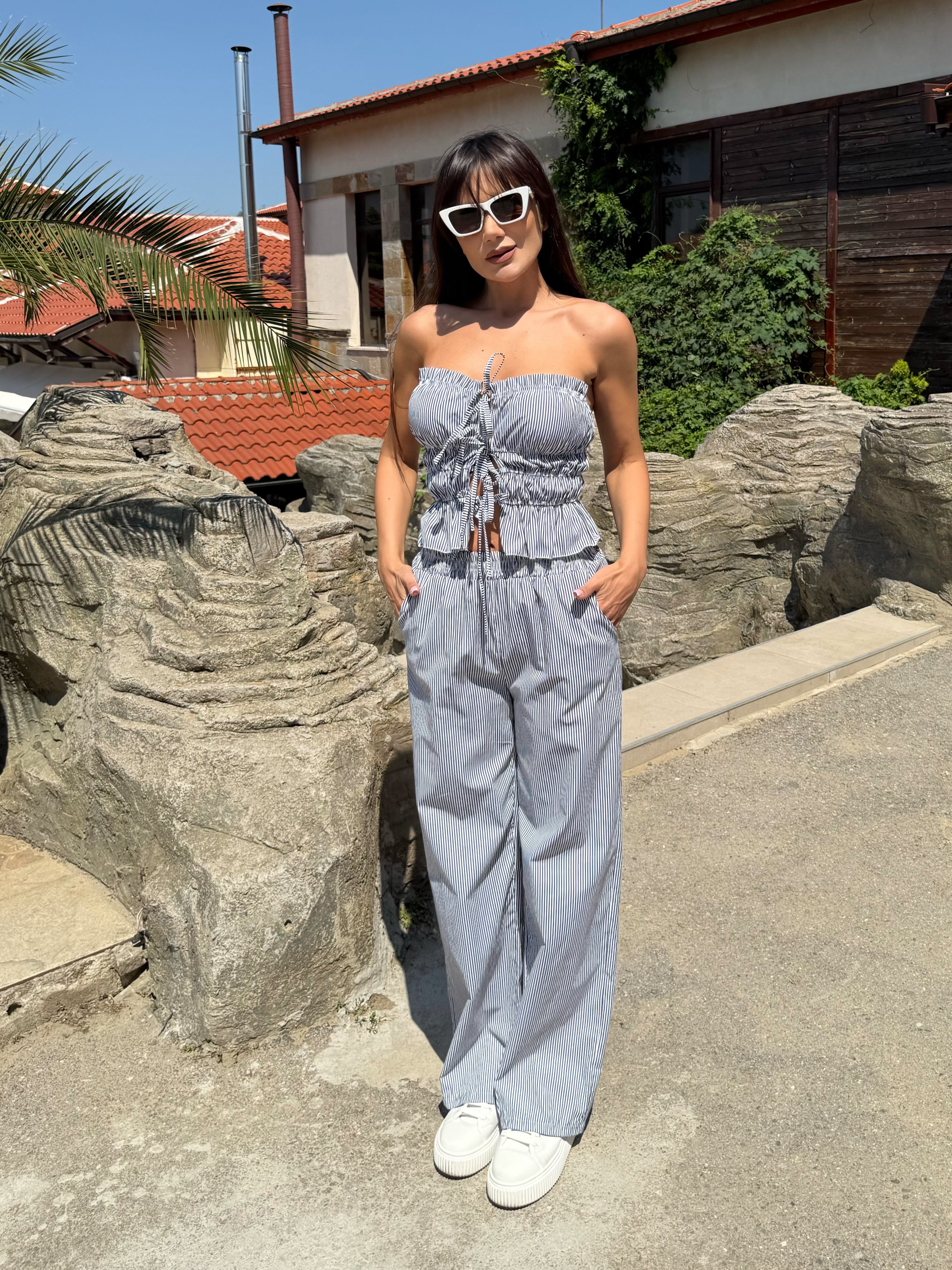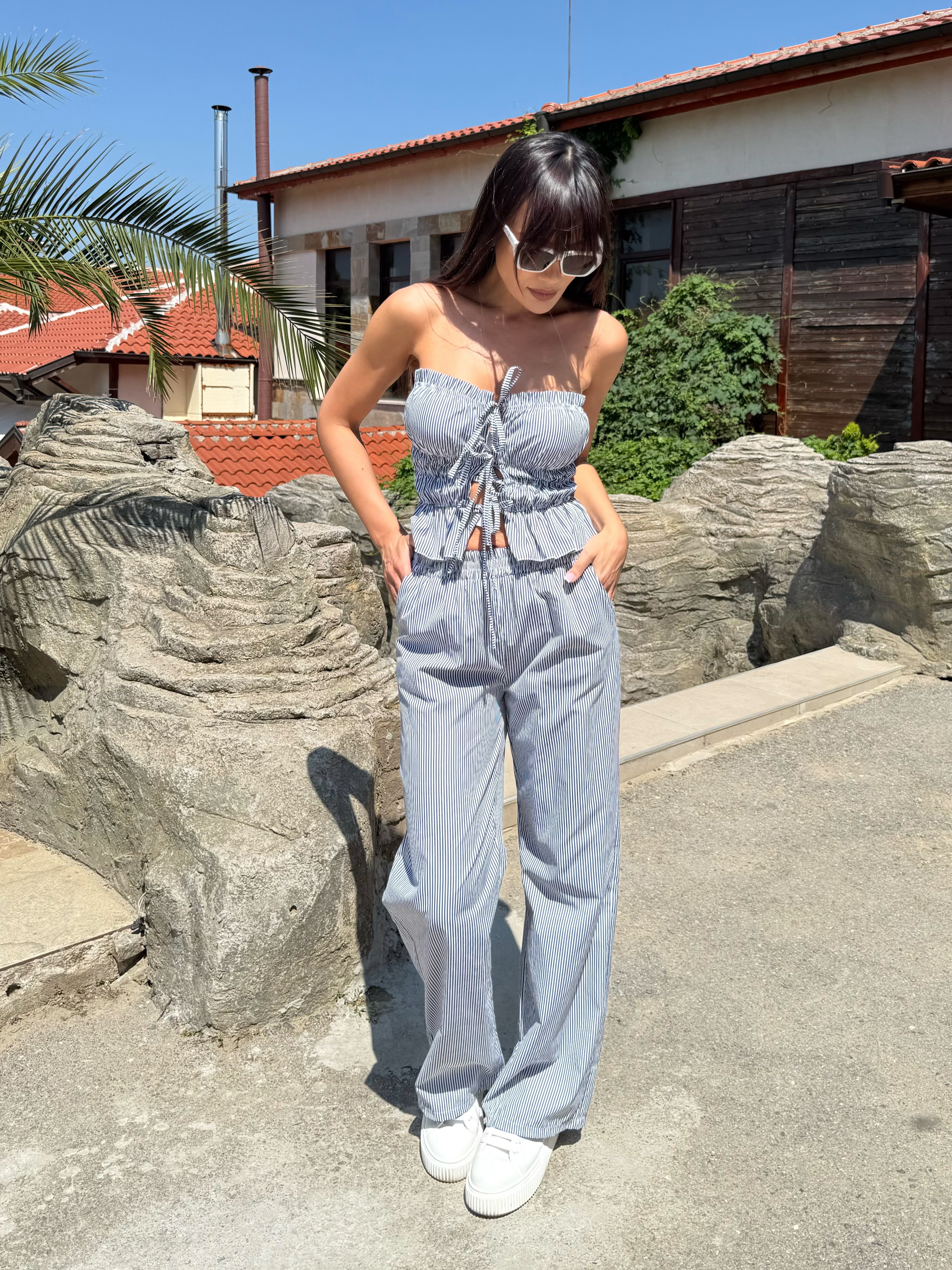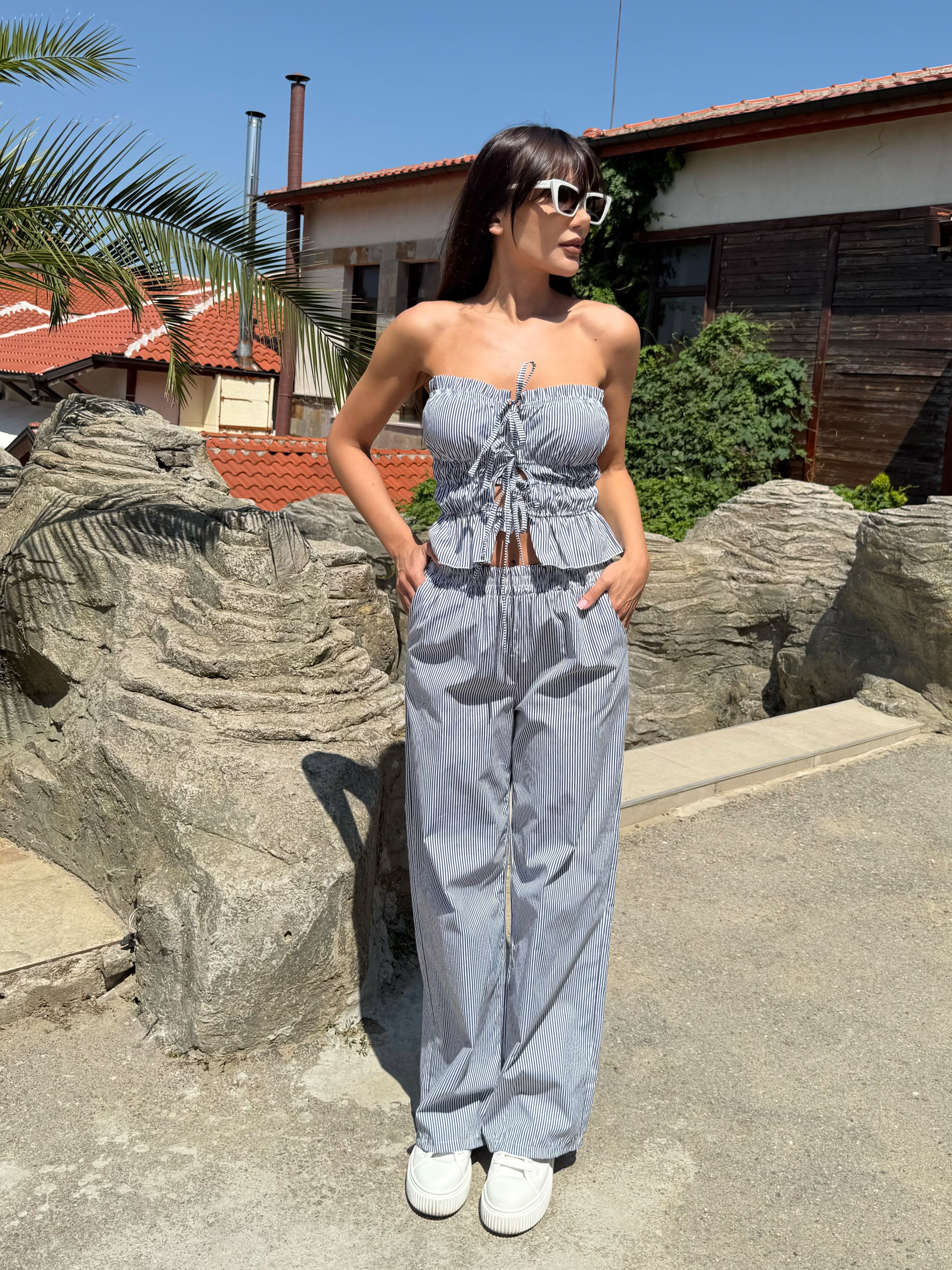 Summer style and casual elegance – this is the “Stripe Breeze” set . It consists of a strapless crop top with spectacular ties at the front and wide trousers with a high waist and subtle vertical stripes that elongate the silhouette. Suitable for both a walk by the sea and a summer day in the city.