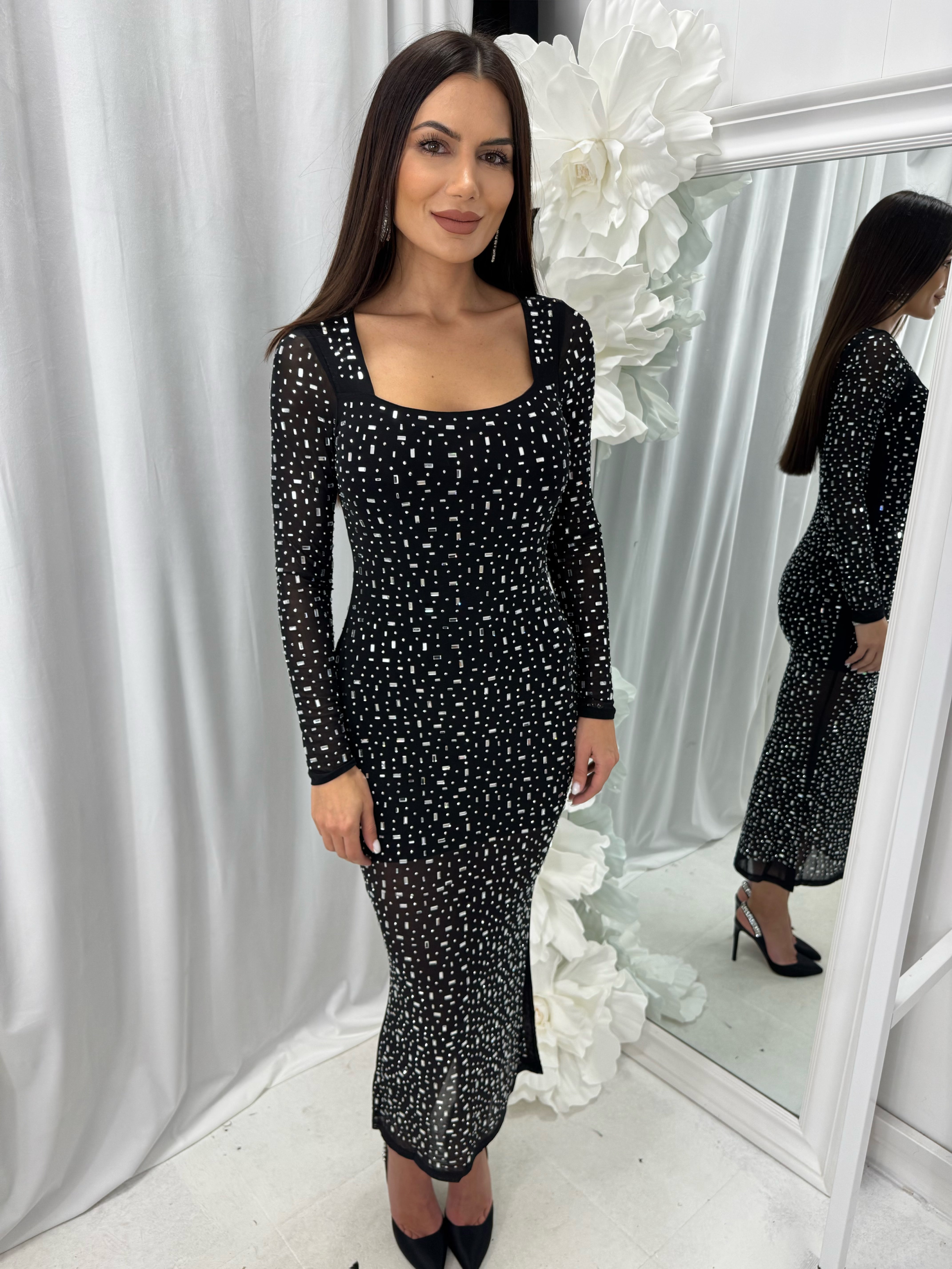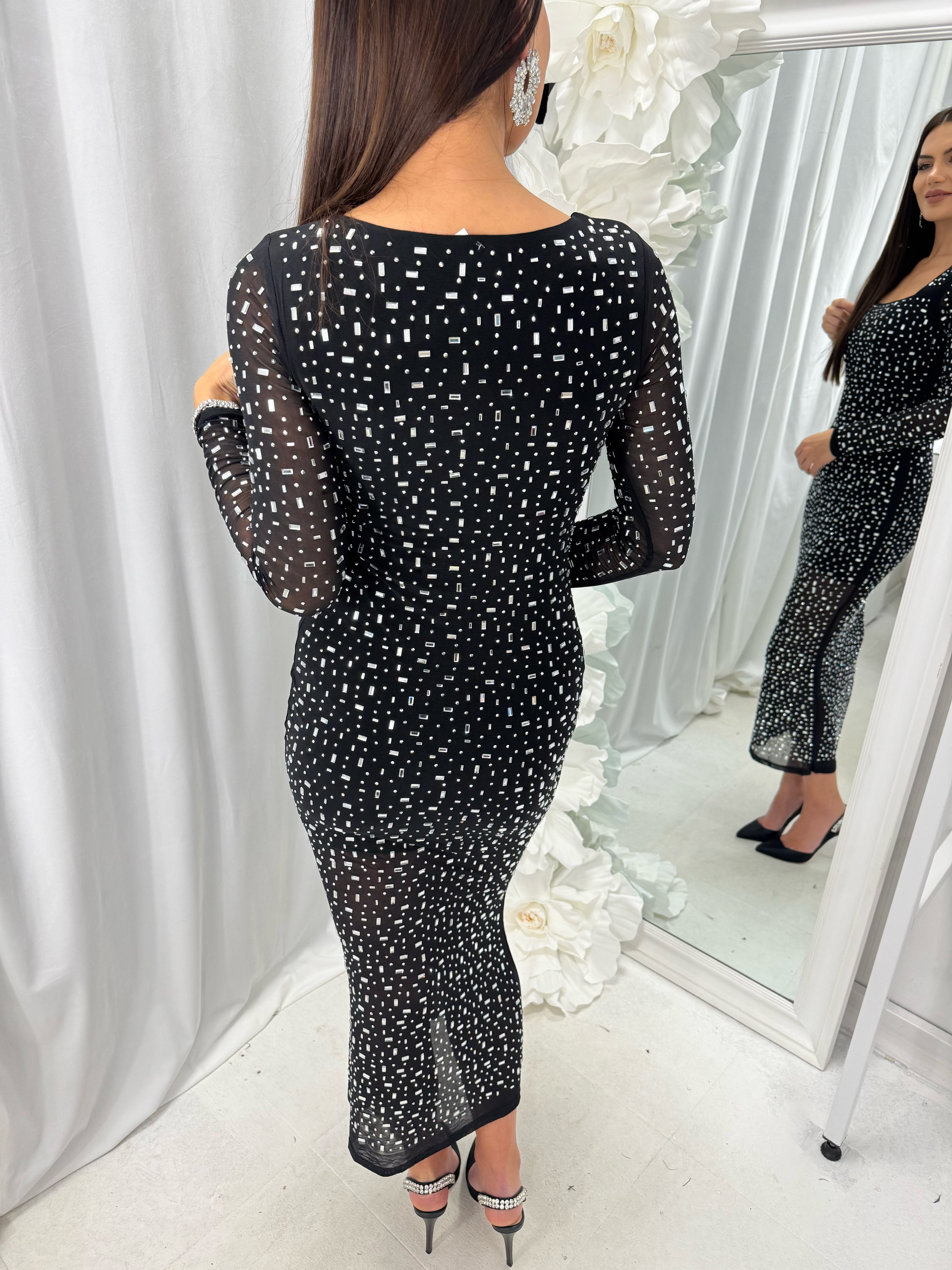 Long DIAMOND DRESS with spectacular sparkling stones in the front and back. The material is made of elastic tulle. The inner part has a short lining. The model is available in one size - S