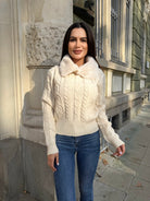 RIBBON BLOUSE with short sleeves and a high collar, round neckline made of fine machine knit with spectacular sewn-in ribbons on the front.