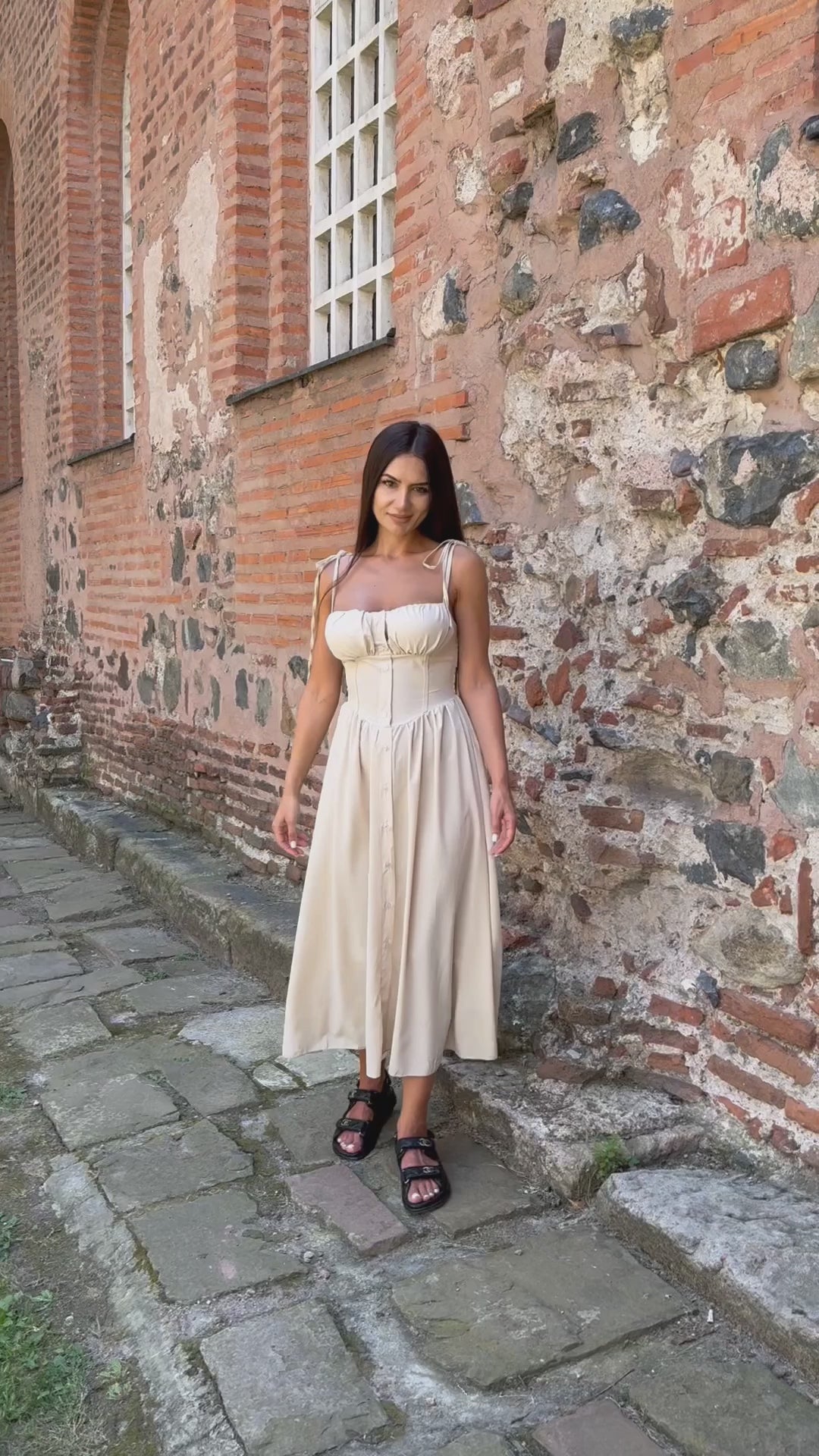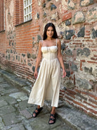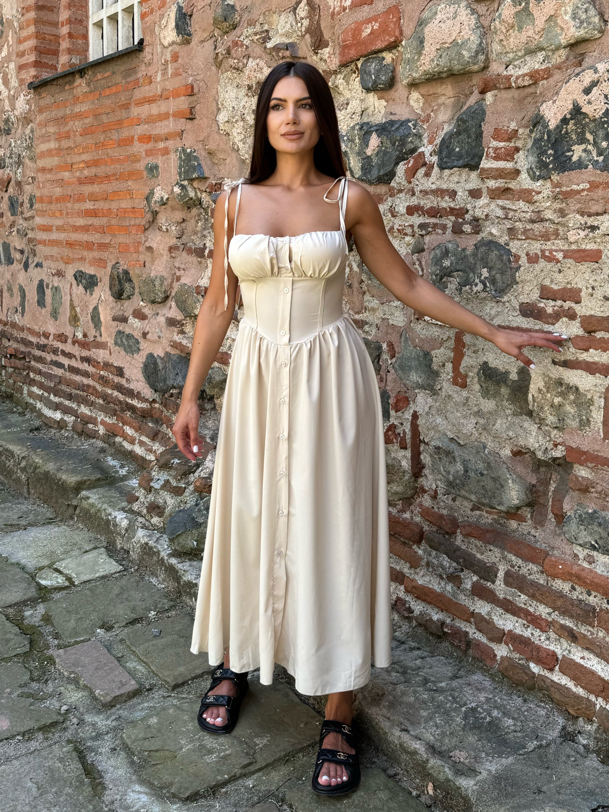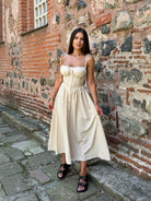 Airy fitted DRESS MARINA in beige color, padded cups and straps-ties.