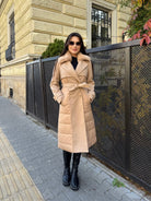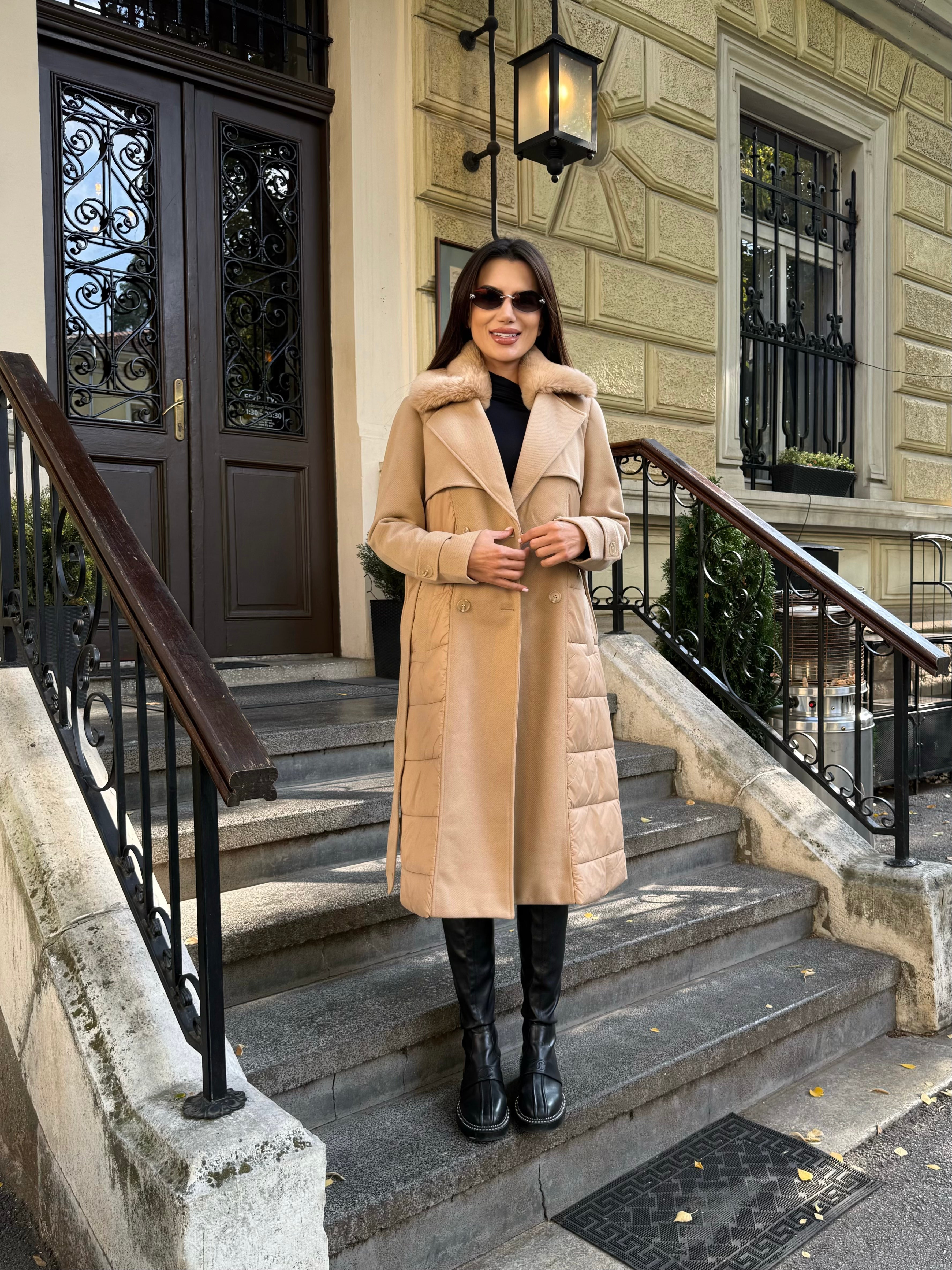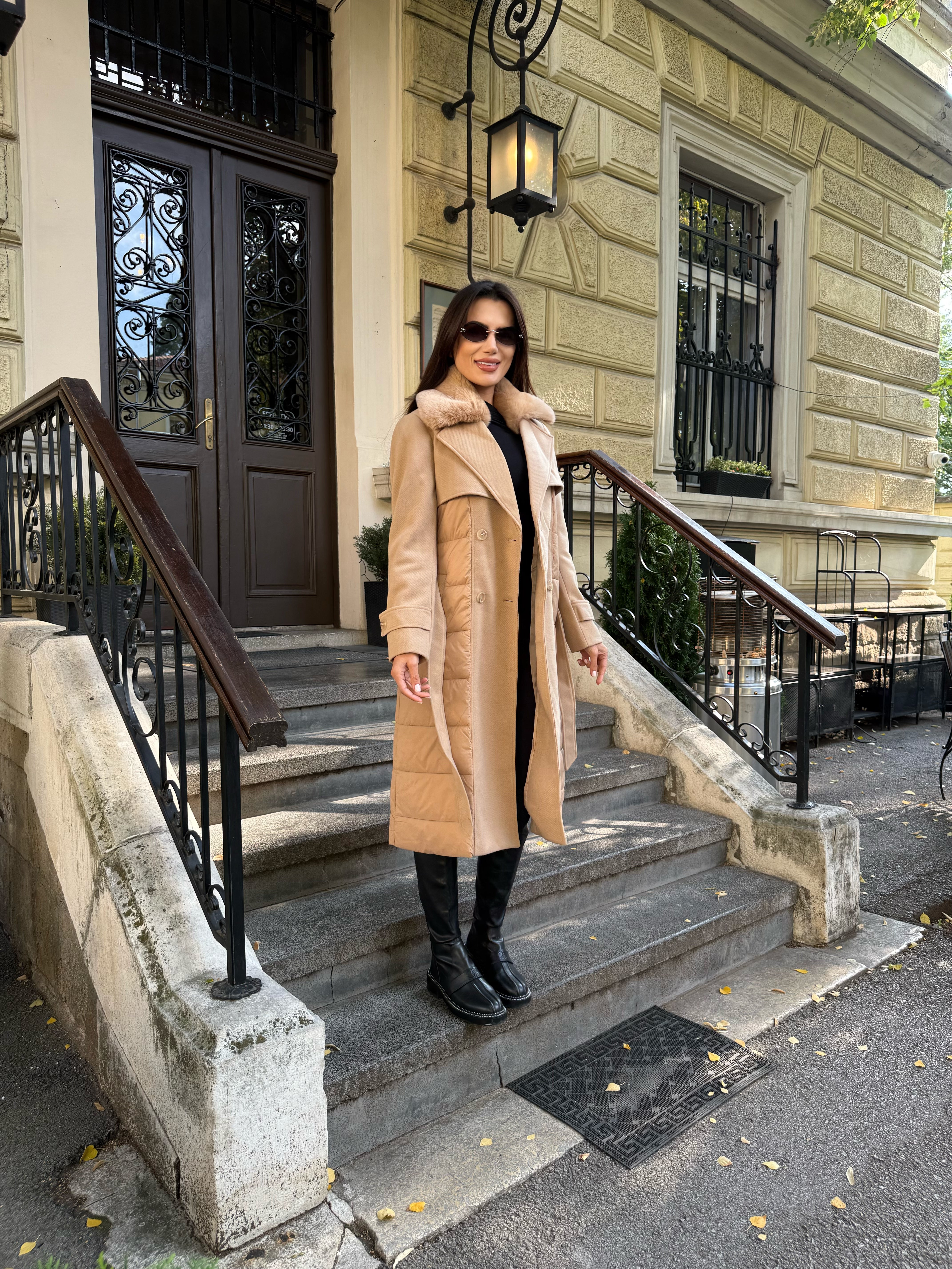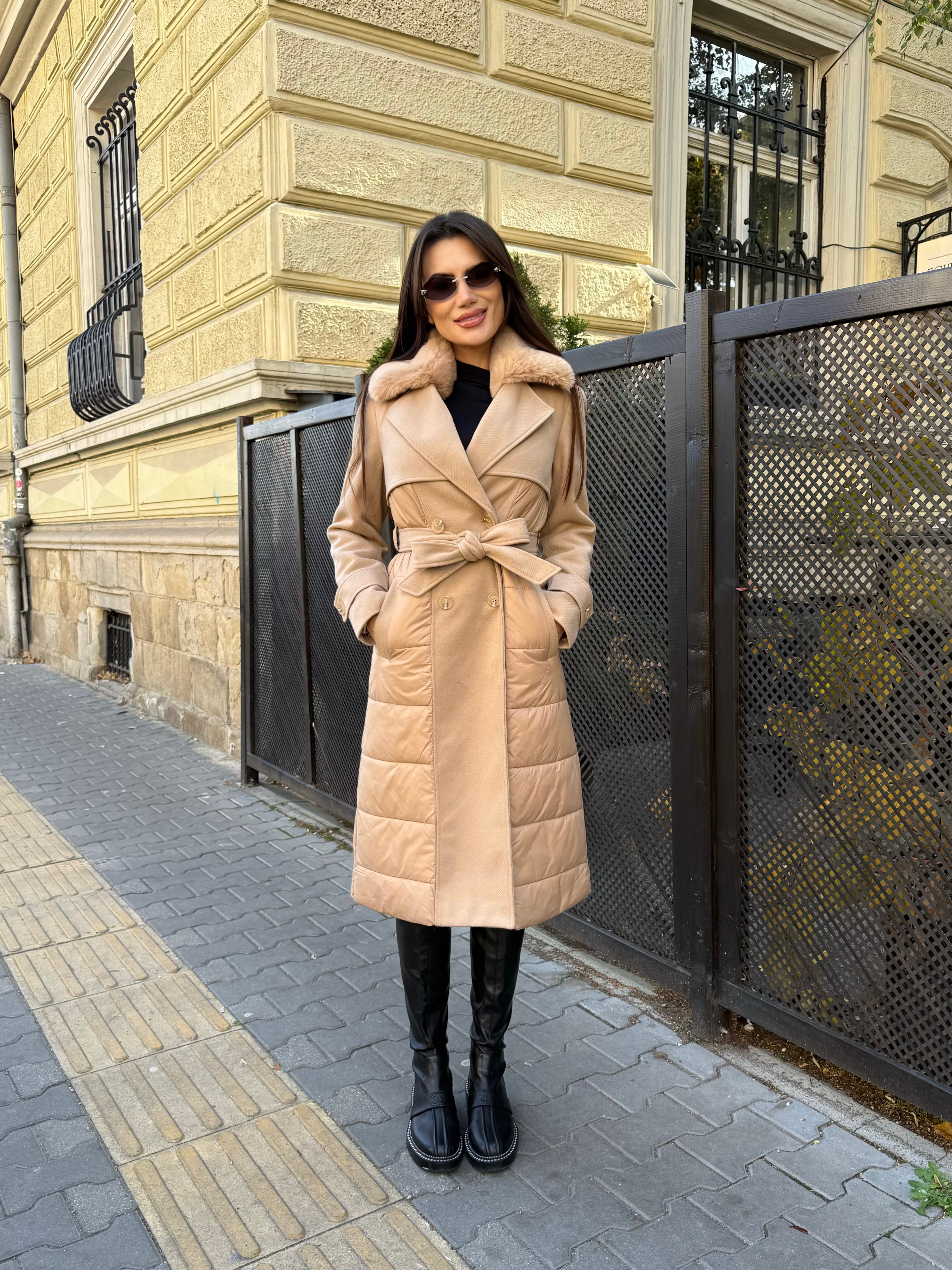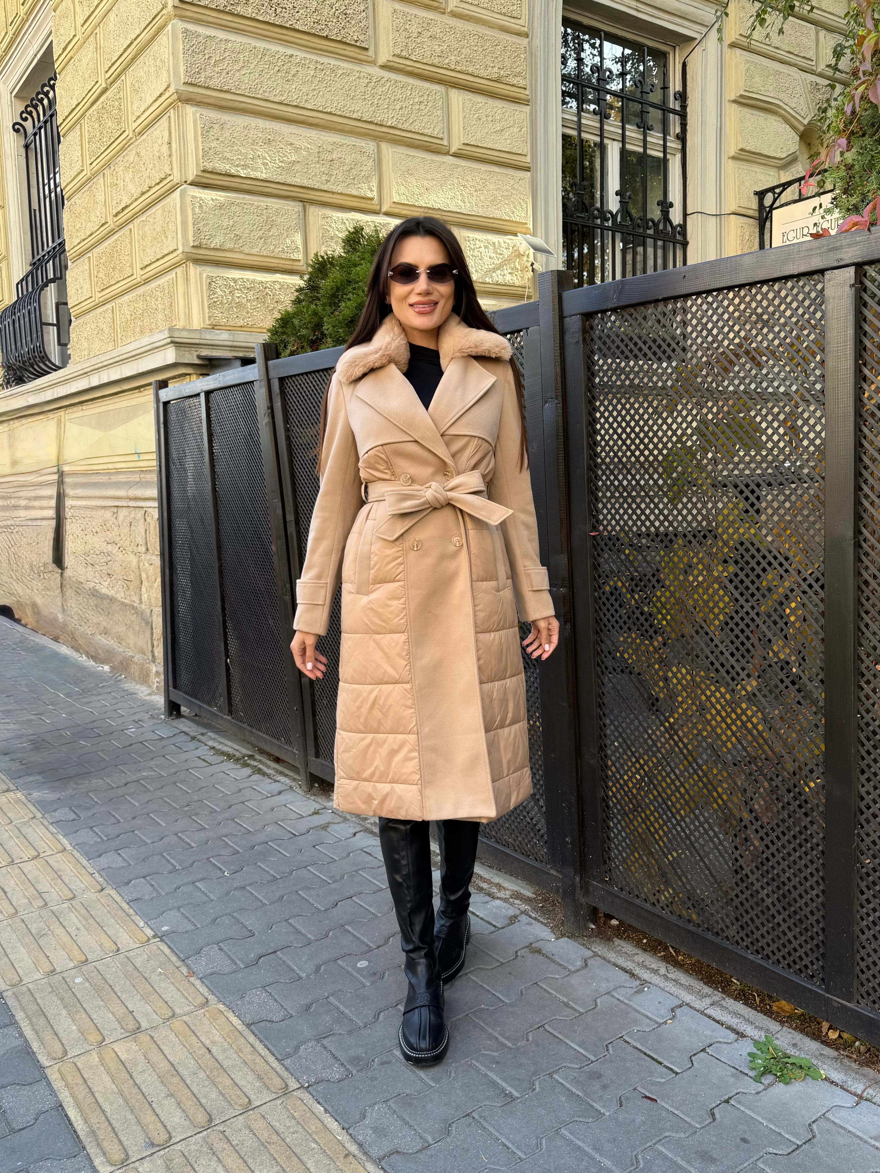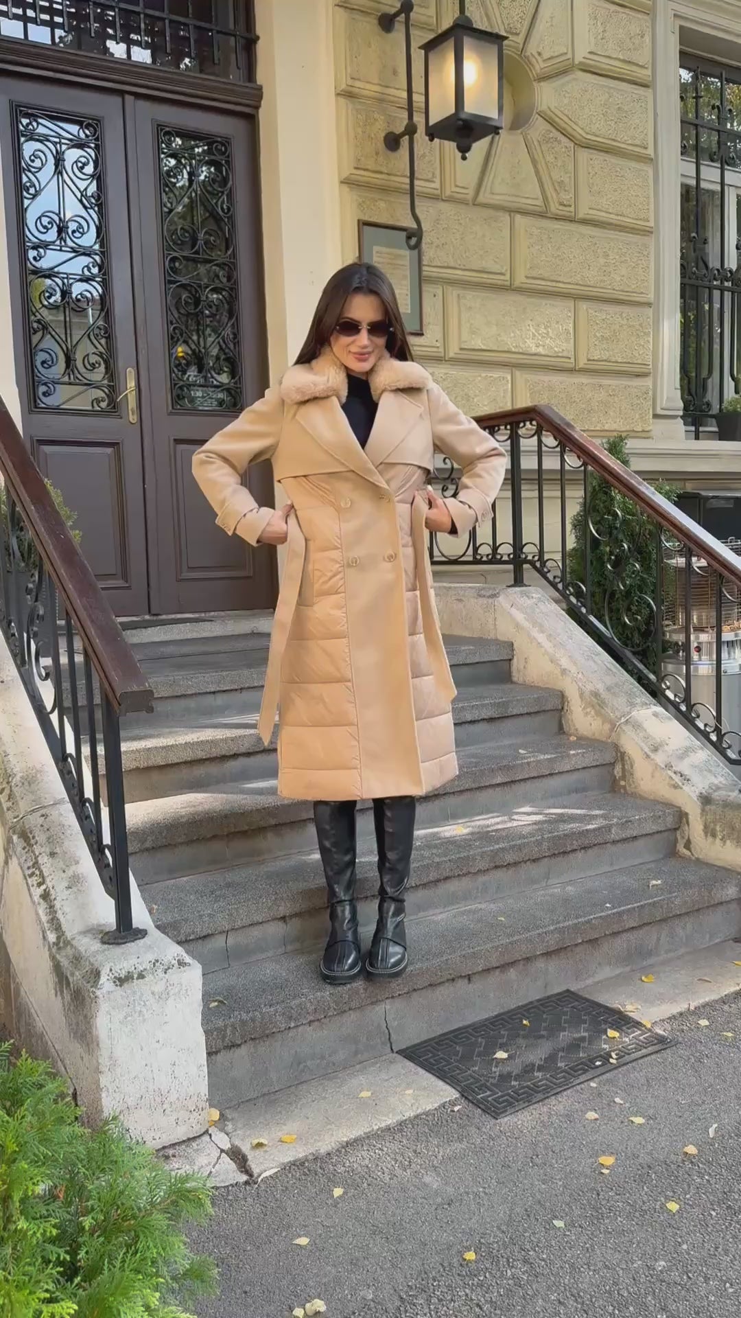 🔸 Detalii: curea în talie, guler din blană ecologică, design dublu rând, partea inferioară matlasată